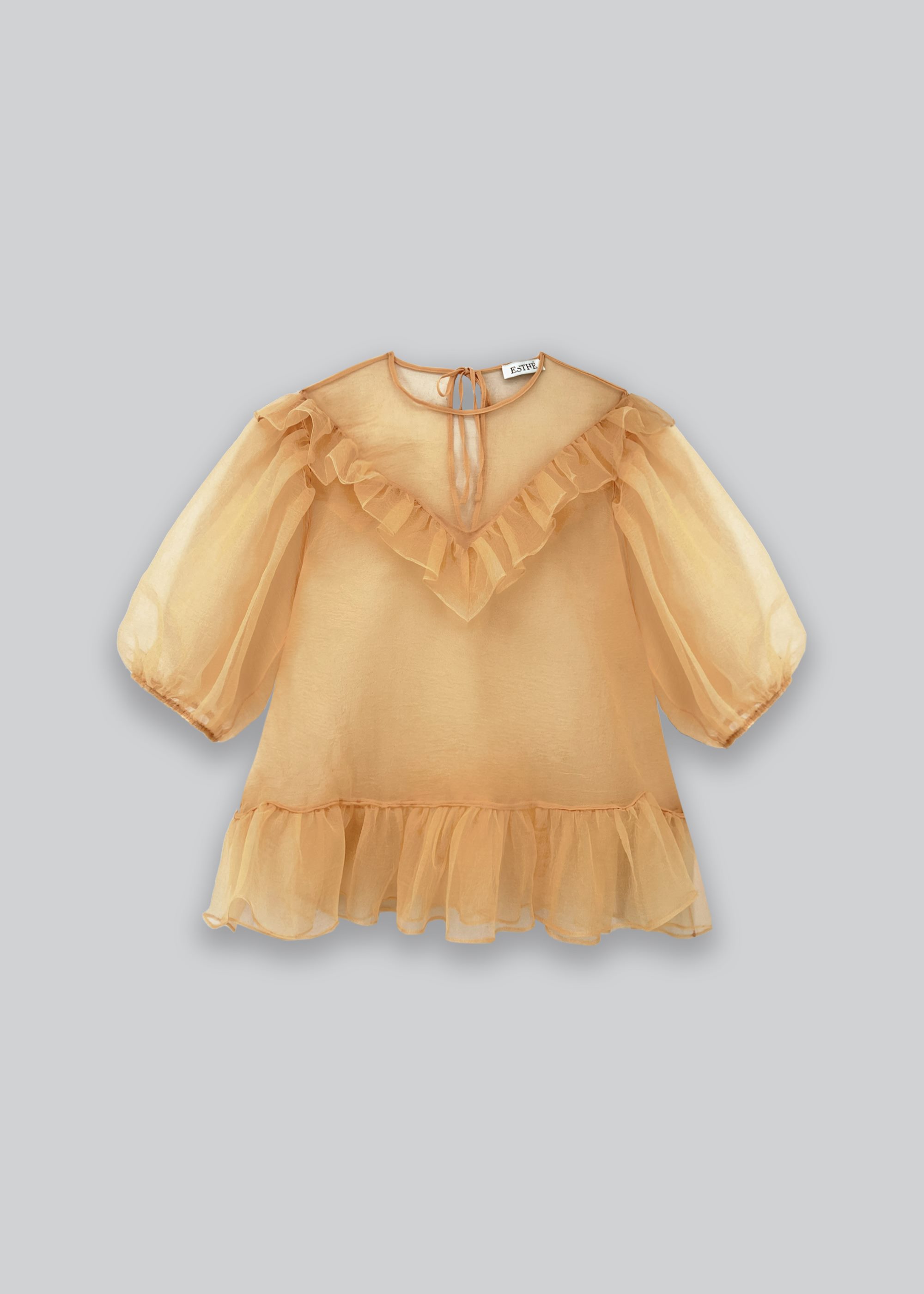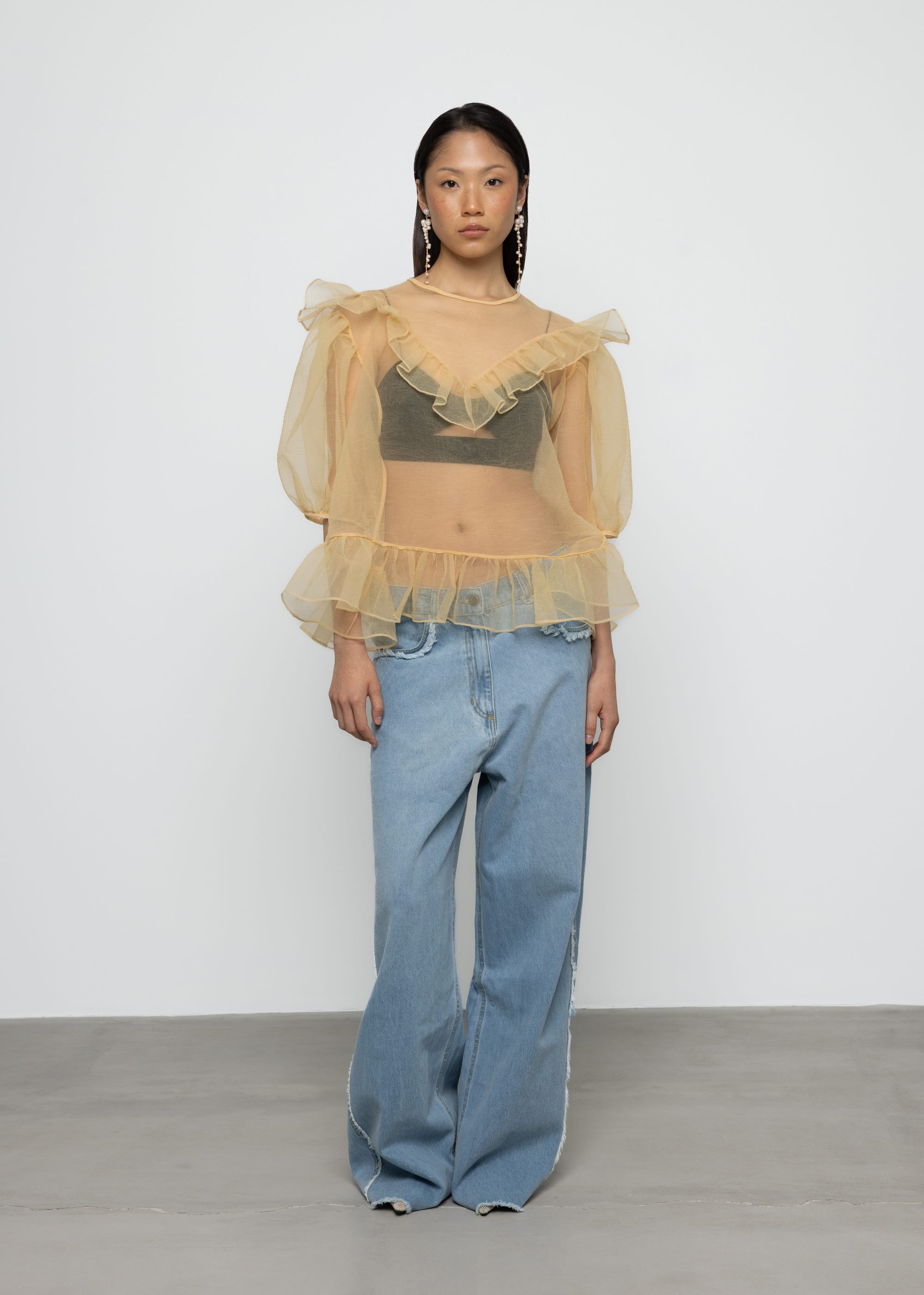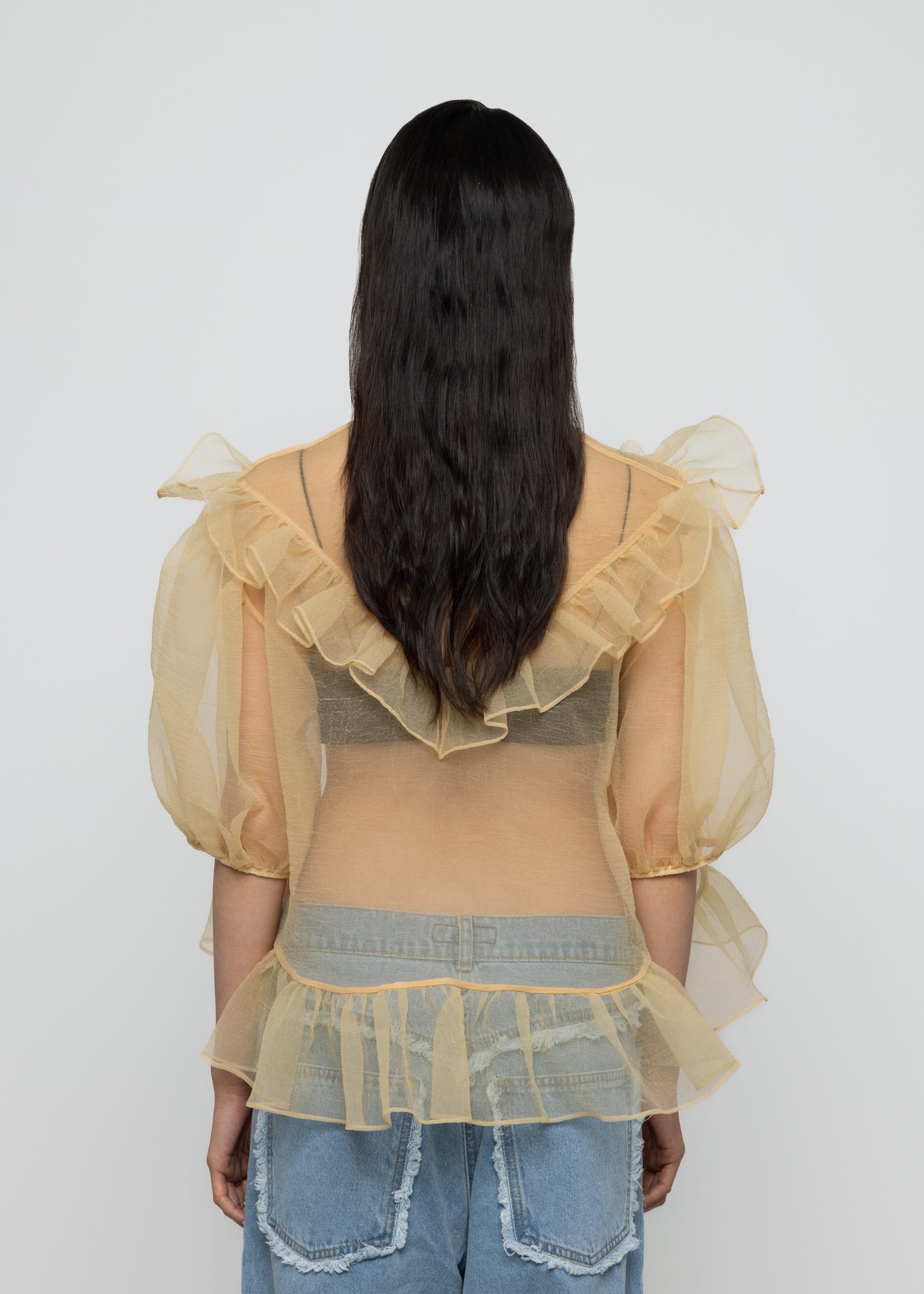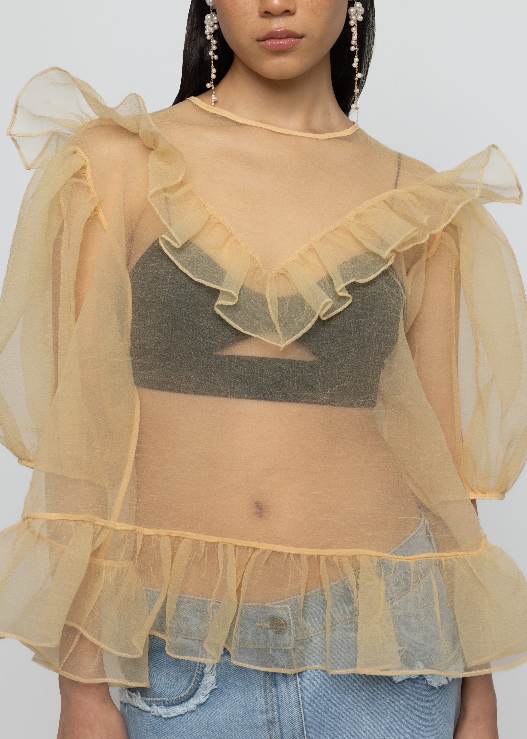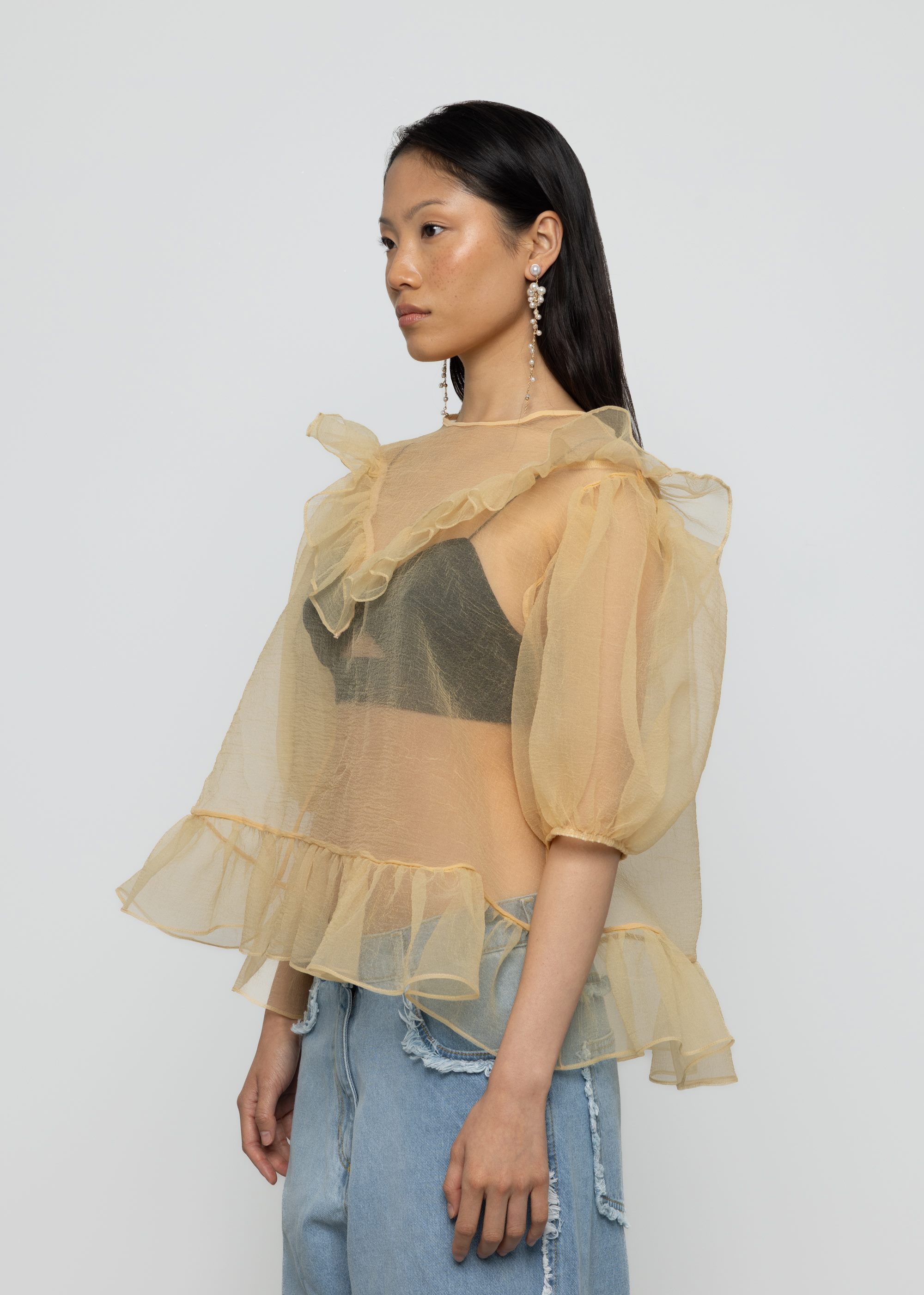 This yellow top features sheer lightweight organza fabric with runs large fit. Crew neckline and short balloon sleeves with V seam ruffle at front.