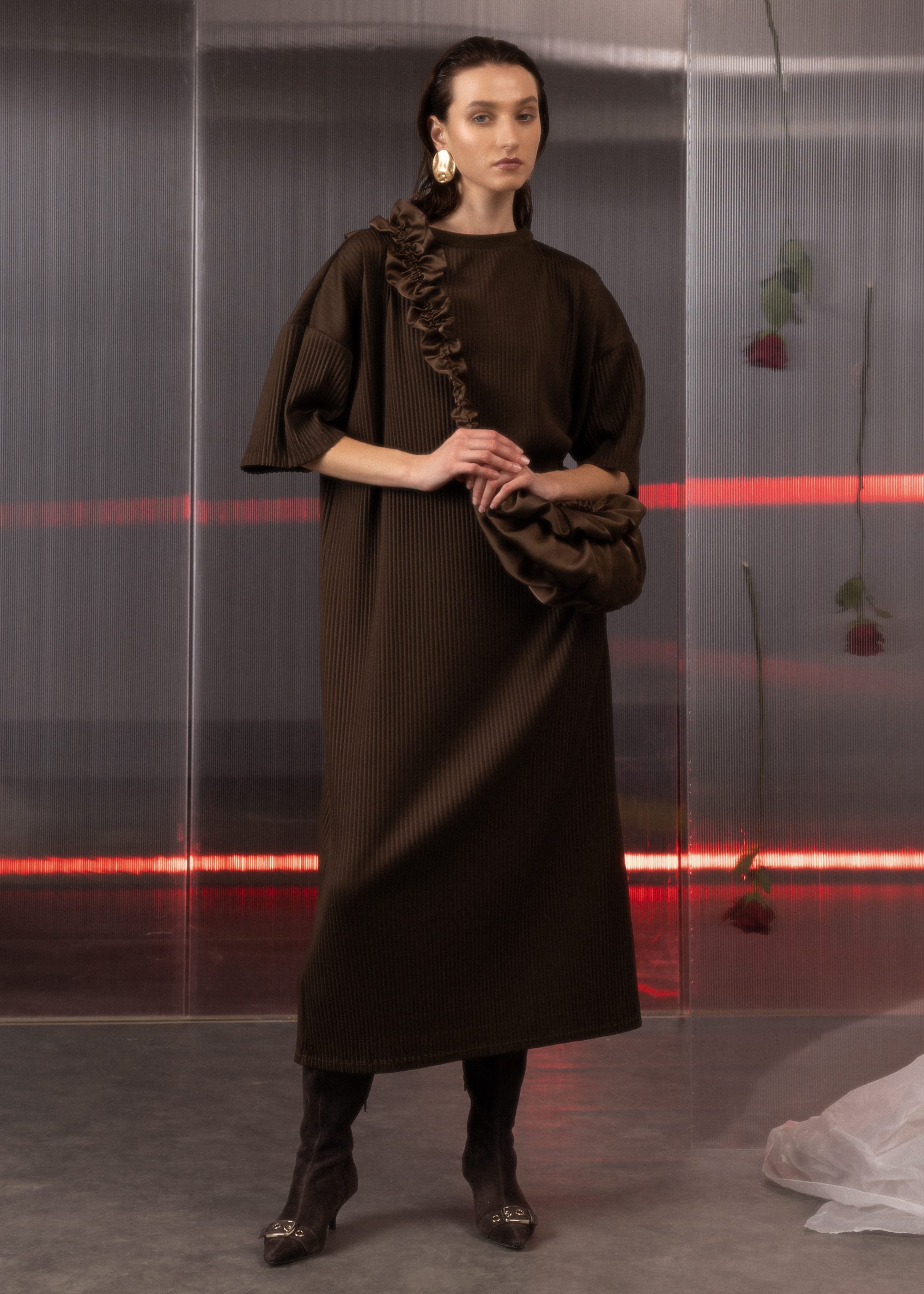 Made from medium weight, semi-stretch fabric, this pleated column dress features a relaxed fit, maxi length, and drop-shoulder short sleeves. Designed with a ribbed crew neckline, it balances comfort and style. Crafted from recycled polyester, it’s a sustainable choice for your wardrobe.