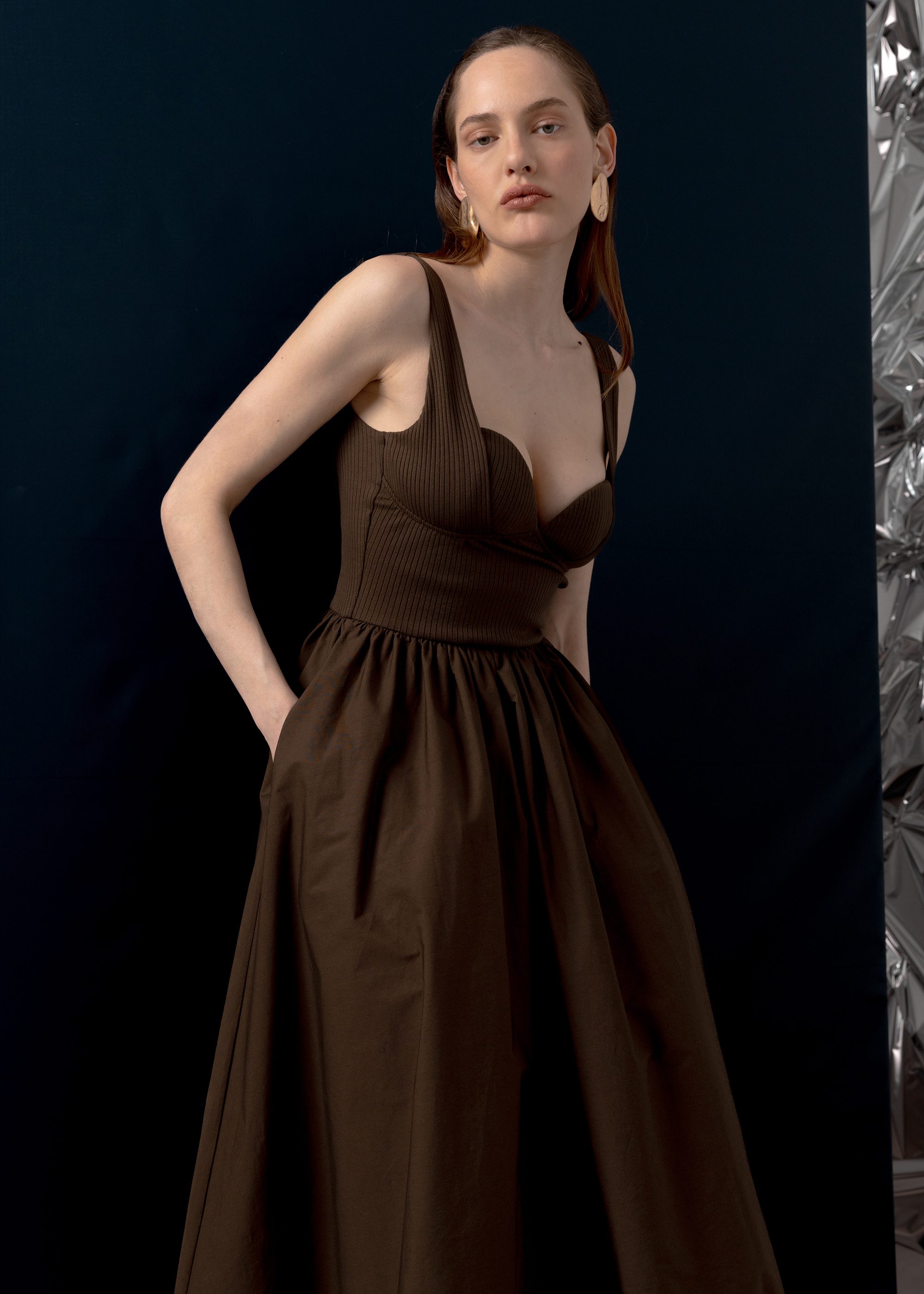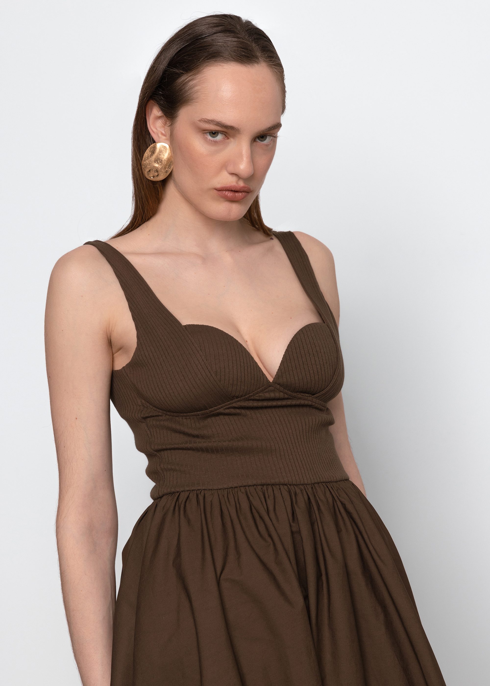 A poplin and rib midi dress combining structured and soft textures. A versatile style for everyday wear with a refined touch.