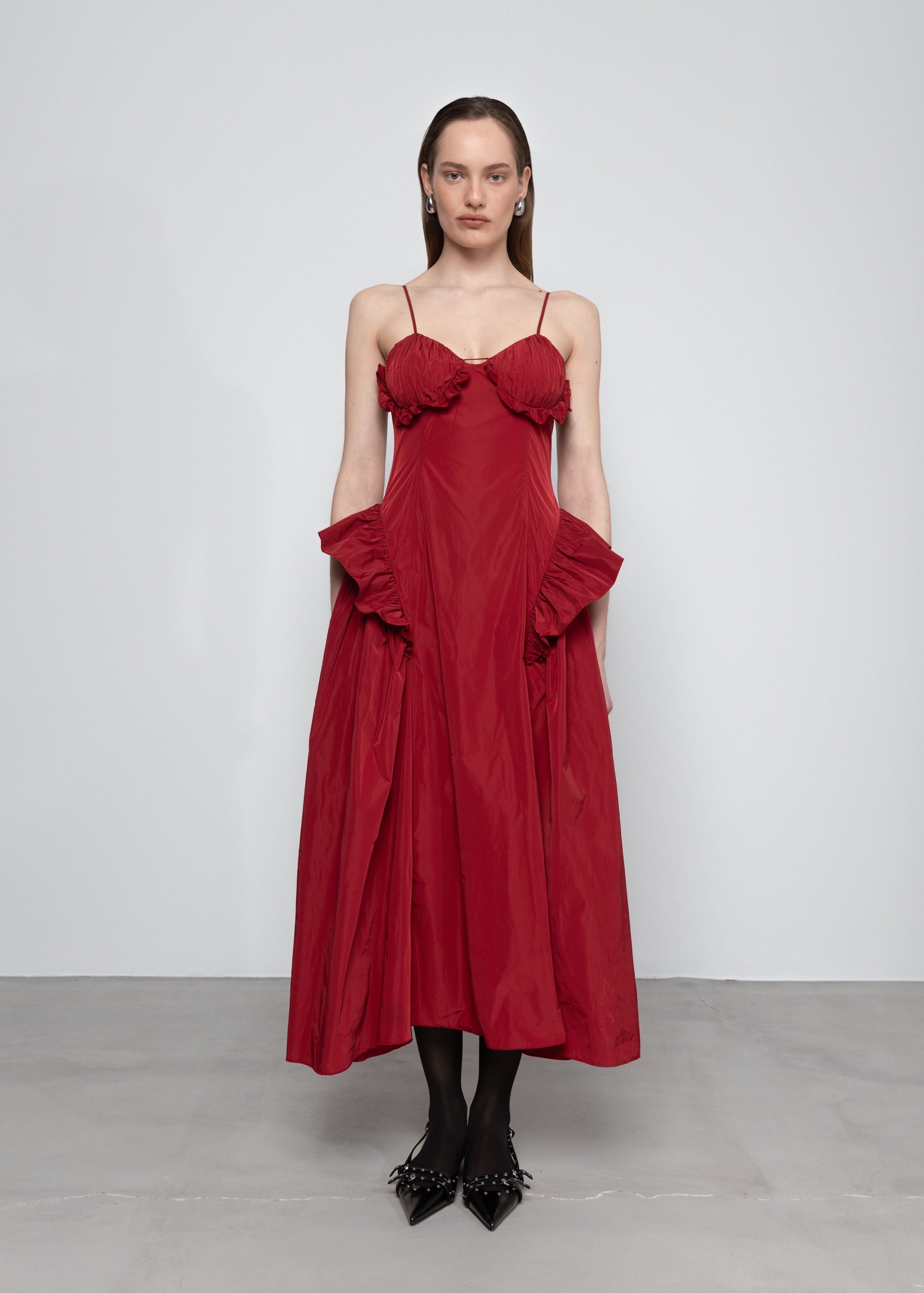 A taffeta slip dress with cut-out accents for a sculptural effect. A lightweight option that elevates evening styling.