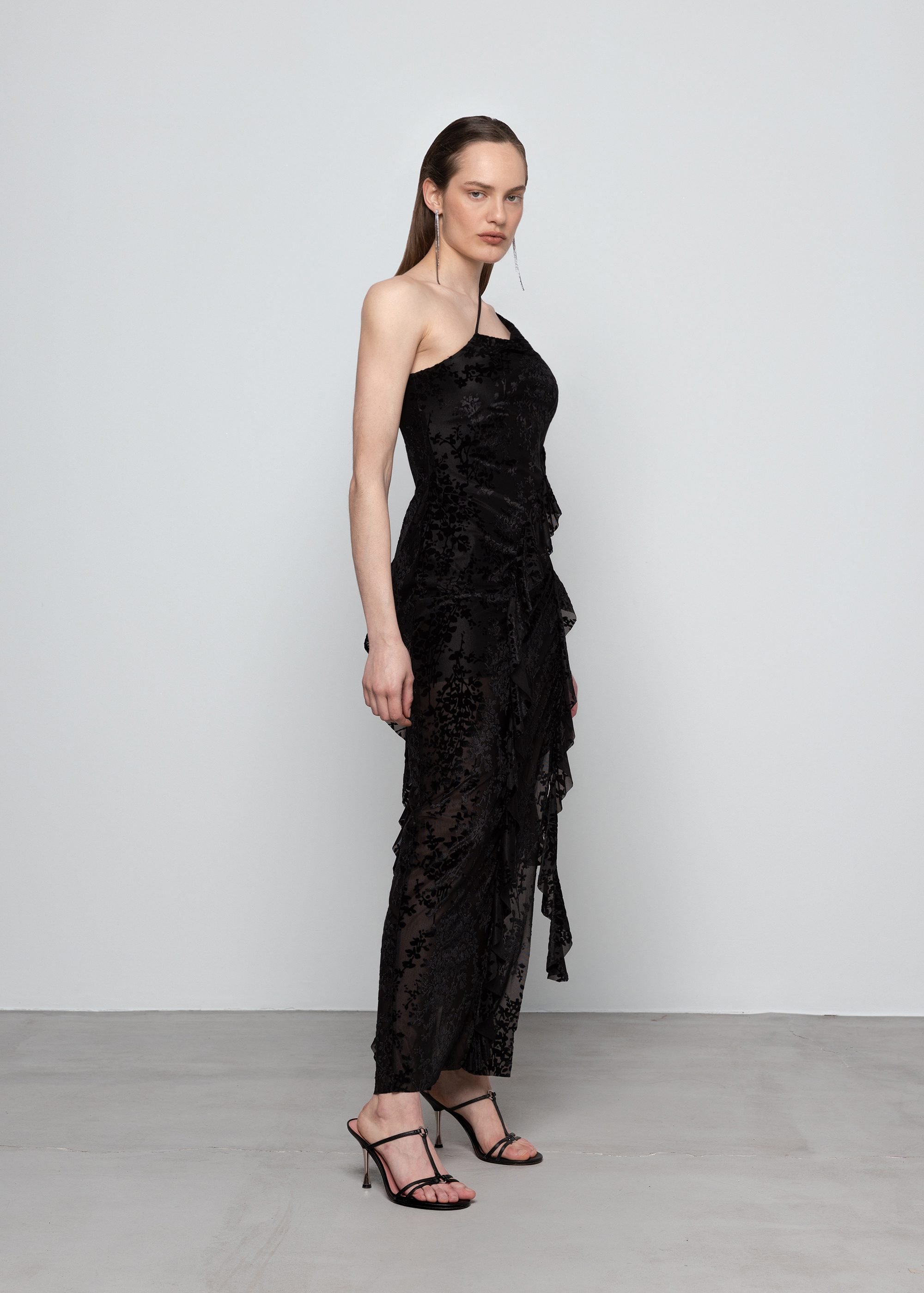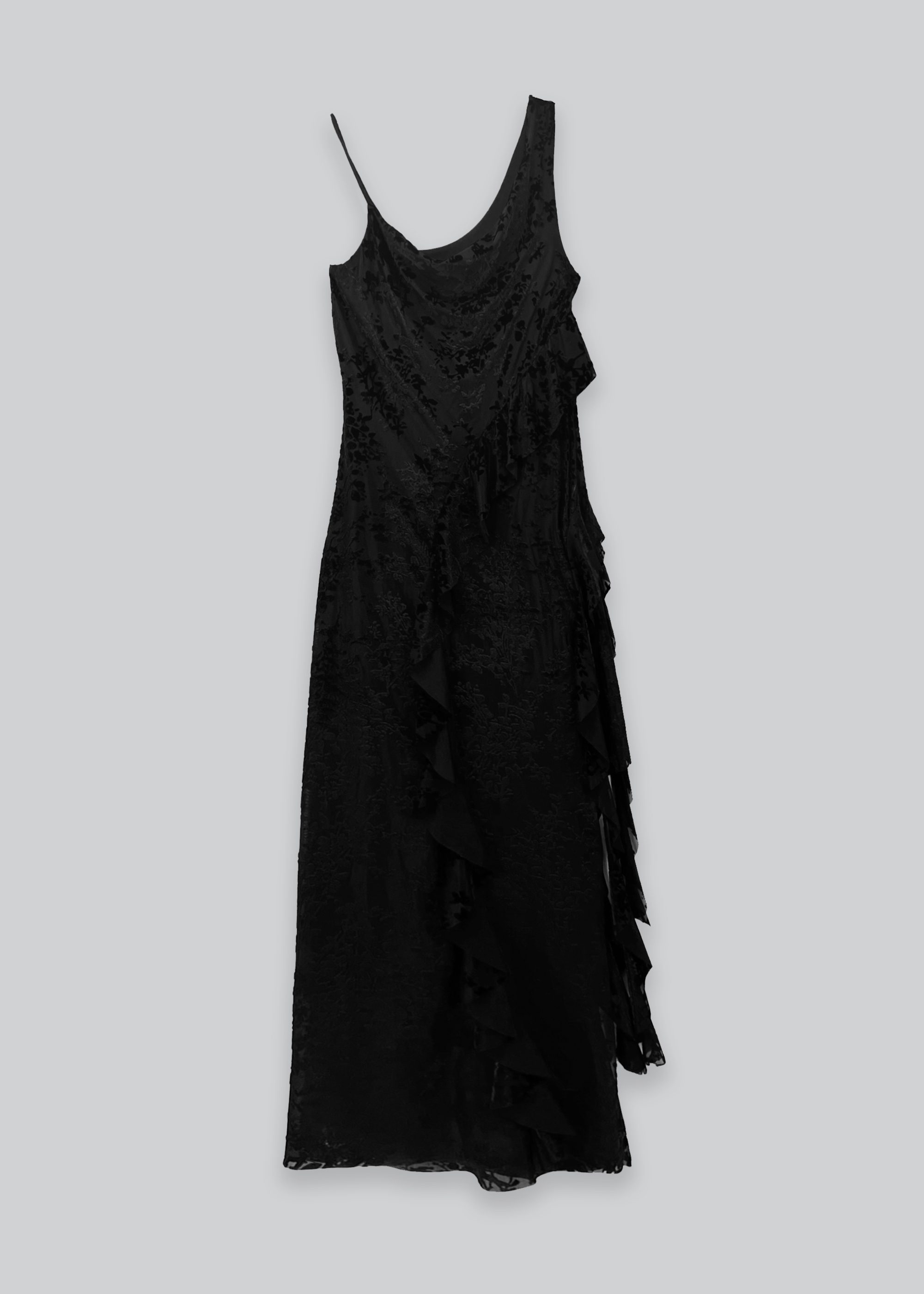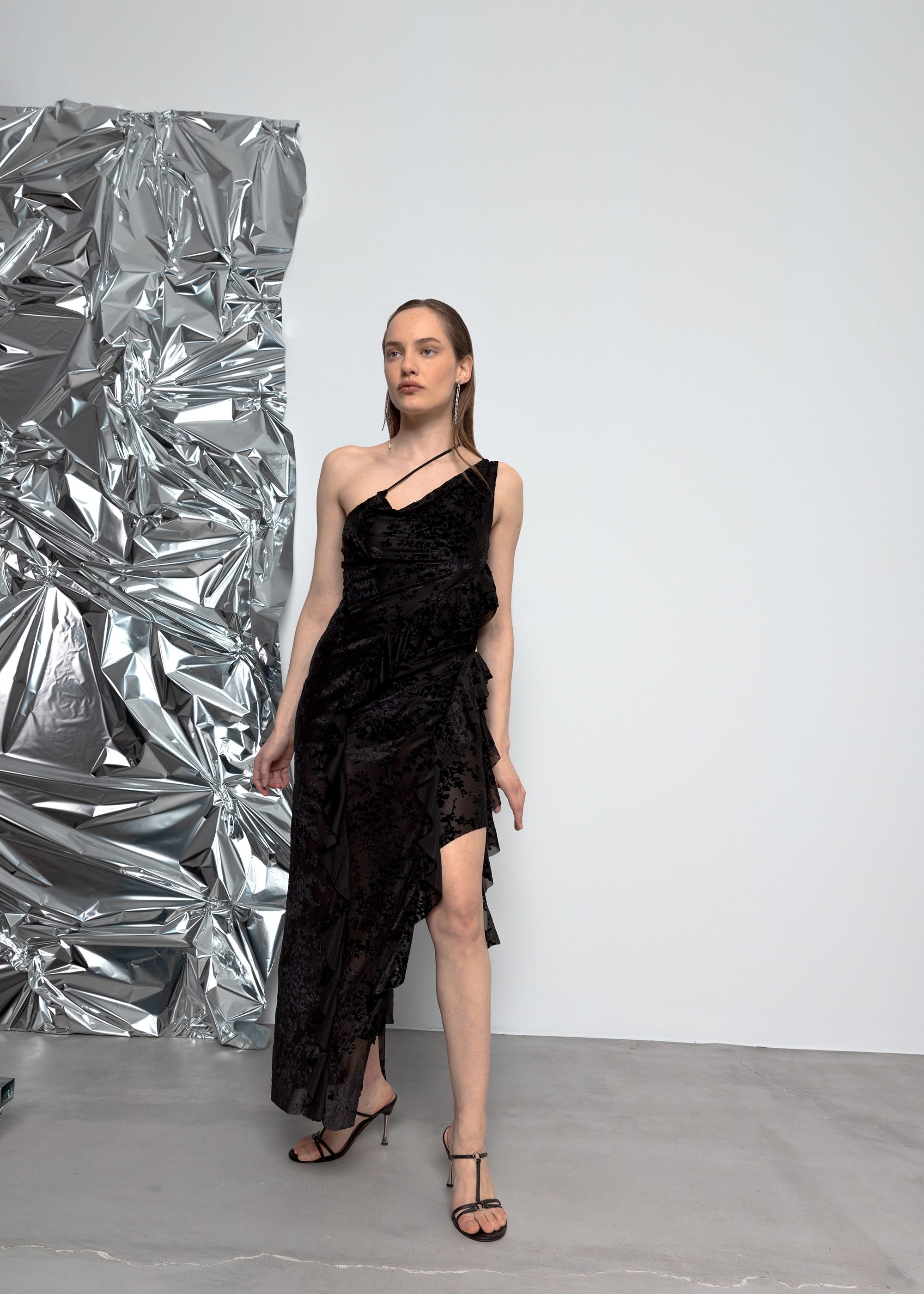 A burnout velvet dress with an asymmetric cut and soft texture. A relaxed yet refined style that works well for evening outings.