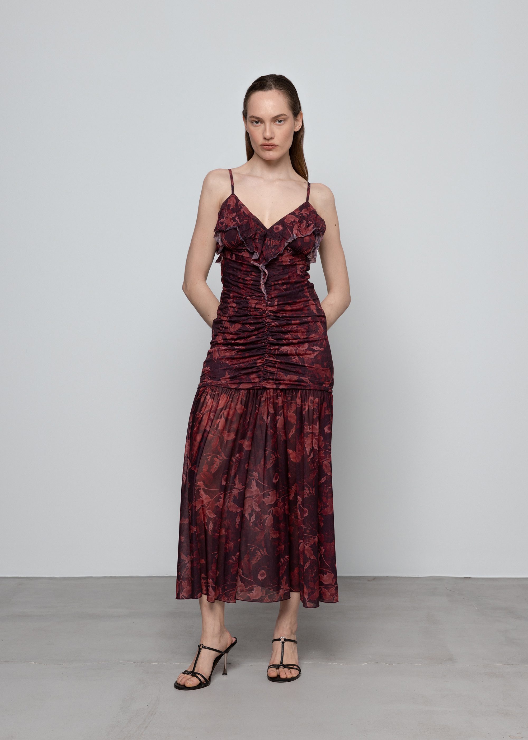 A slip maxi dress with gathered ruffles that add soft movement. A fluid piece ideal for special occasions or elevated daytime looks.