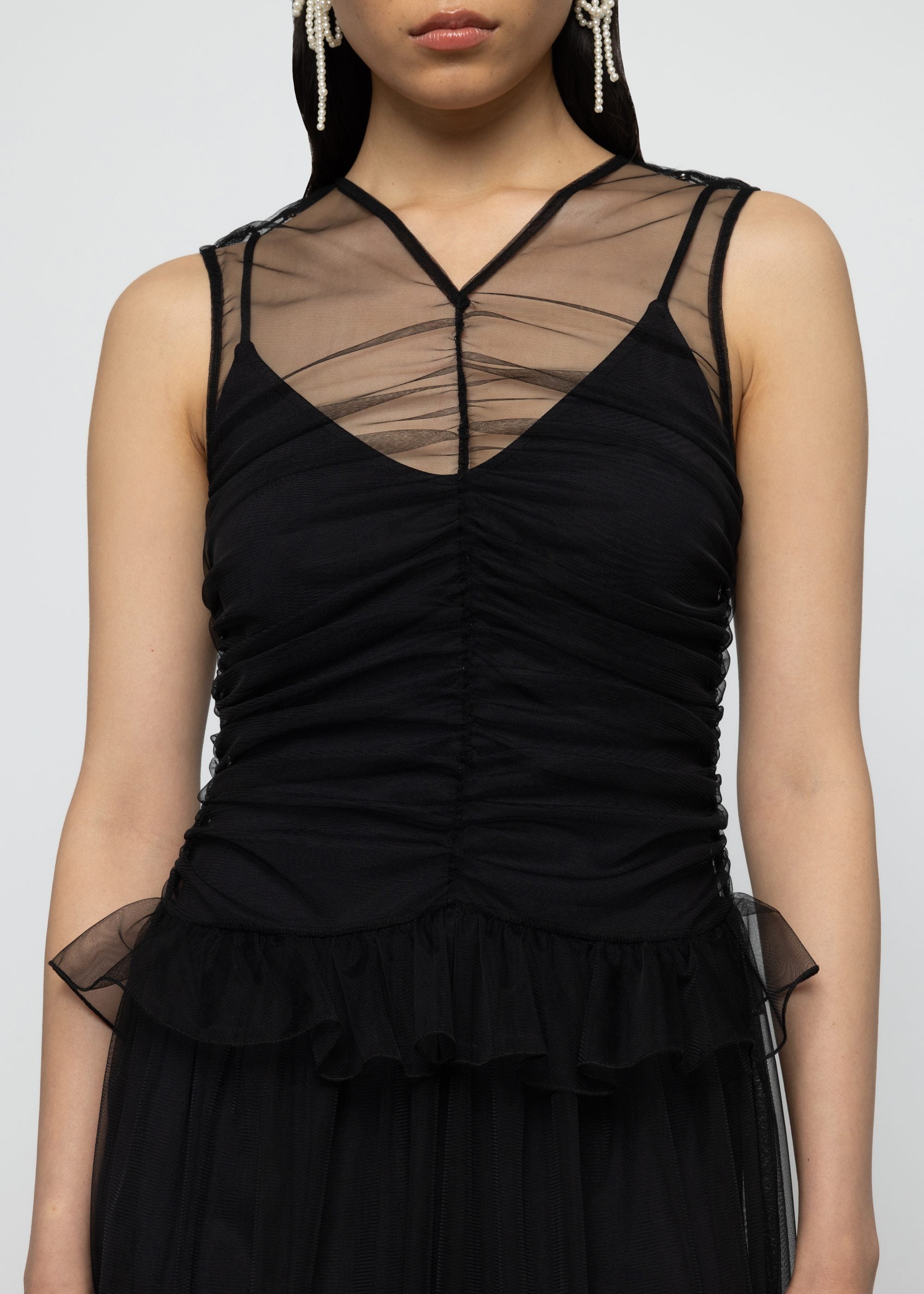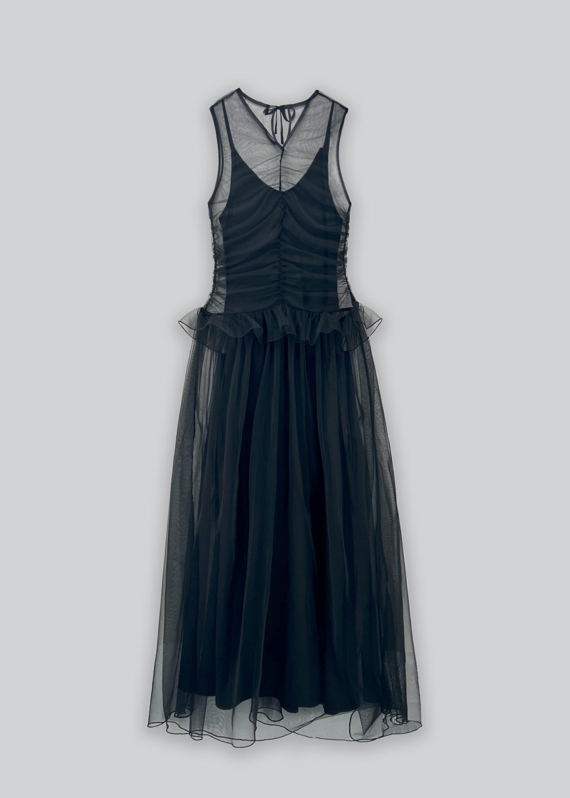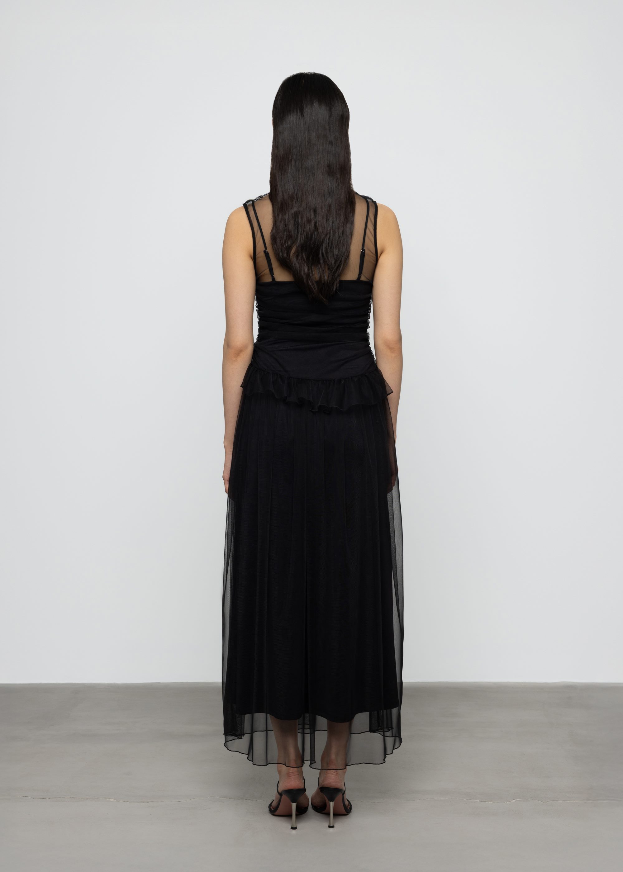 This black midi dress features lightweight sheer tulle fabric with fitted silhouette. Crew V neckline with detachable lining and decorative frill for elegant appeal.