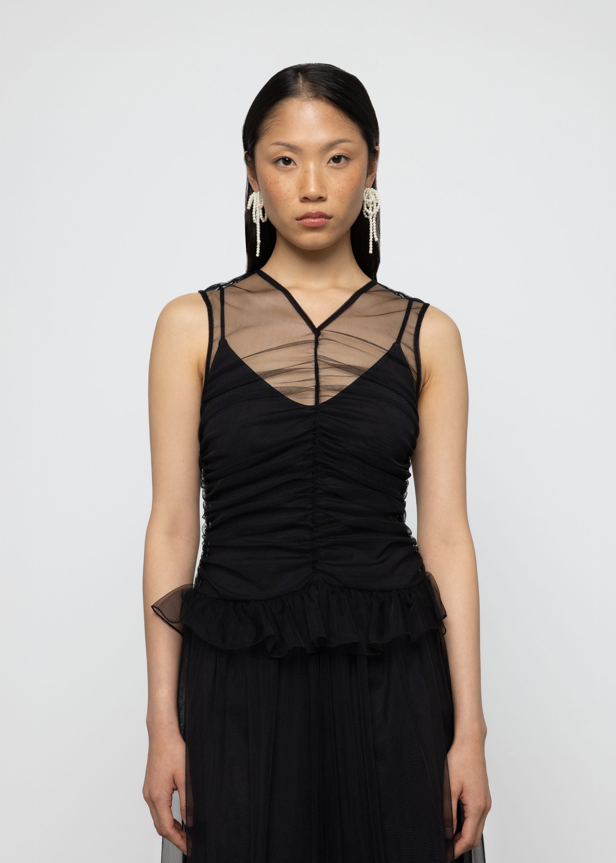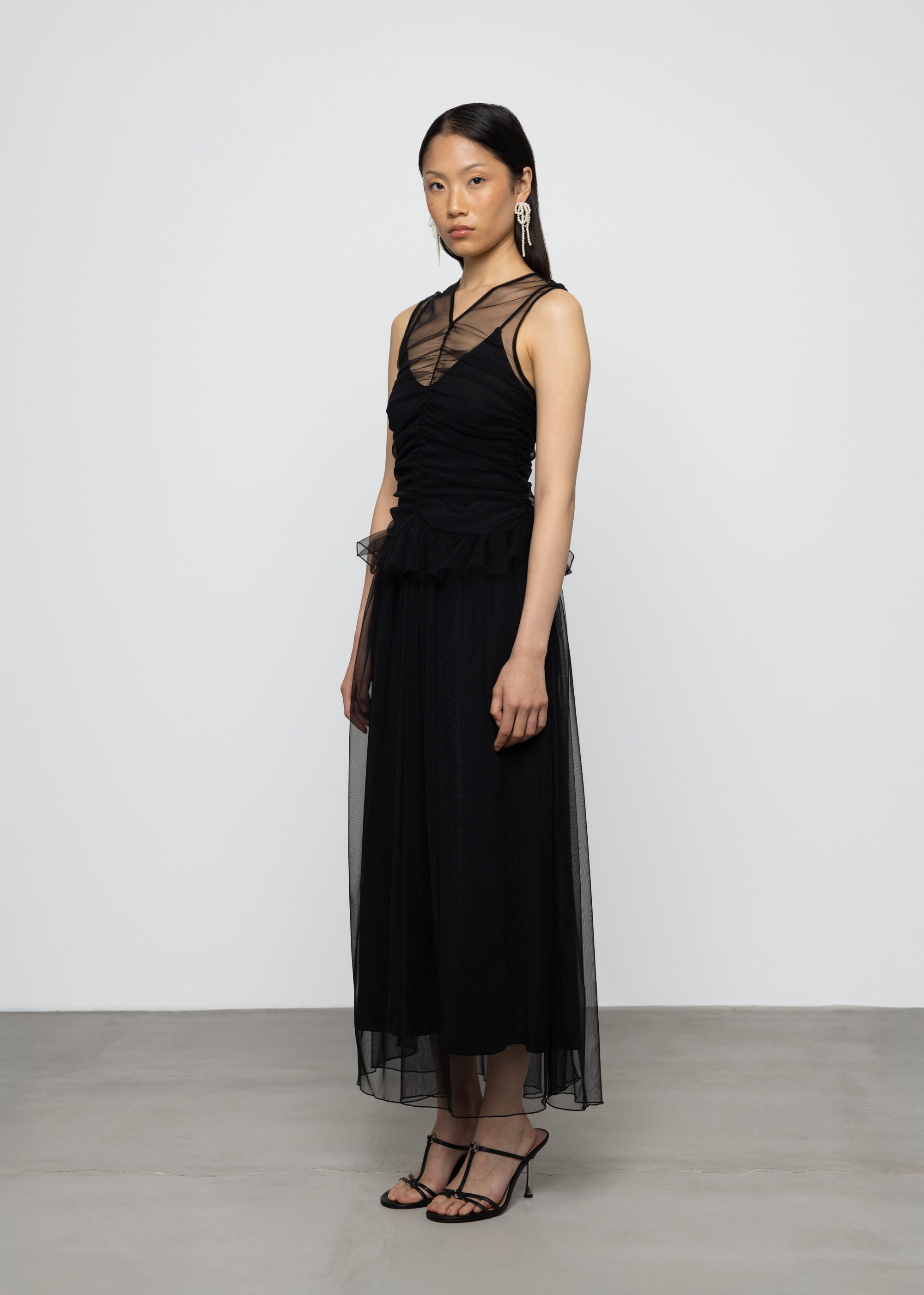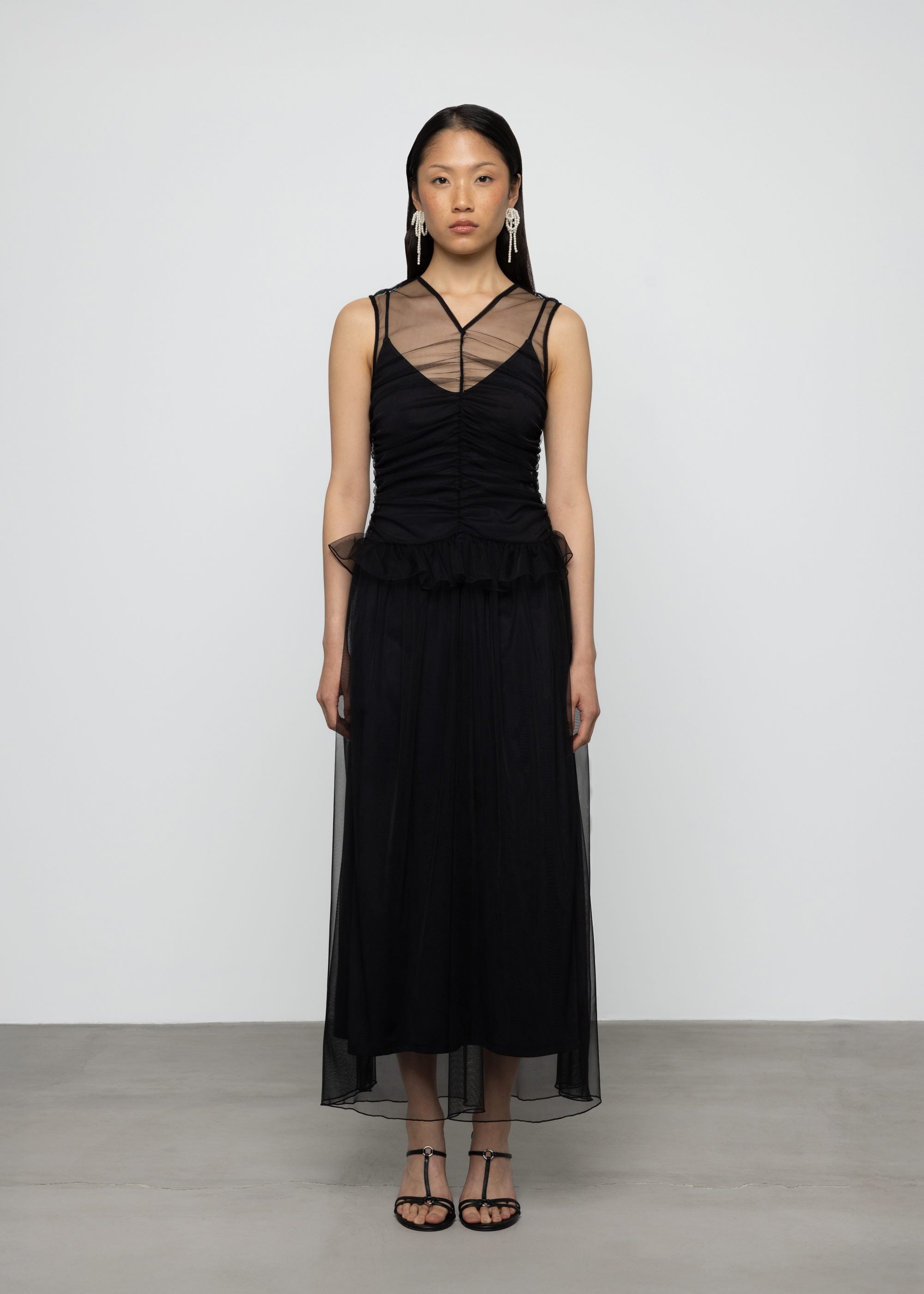 This black midi dress features lightweight sheer tulle fabric with fitted silhouette. Crew V neckline with detachable lining and decorative frill for elegant appeal.