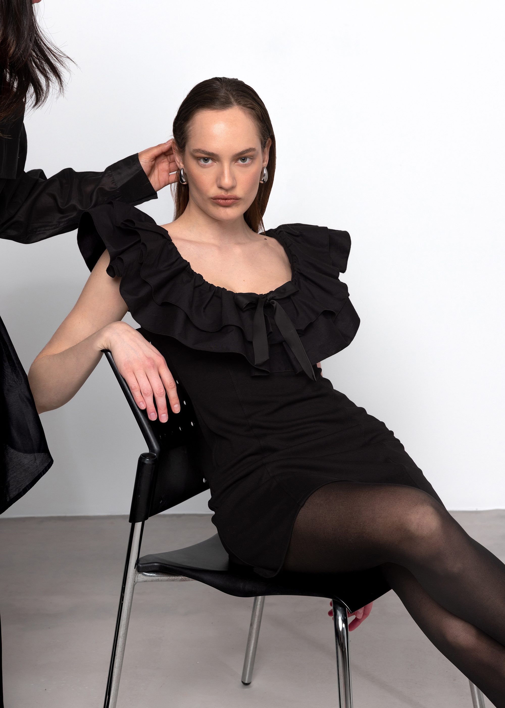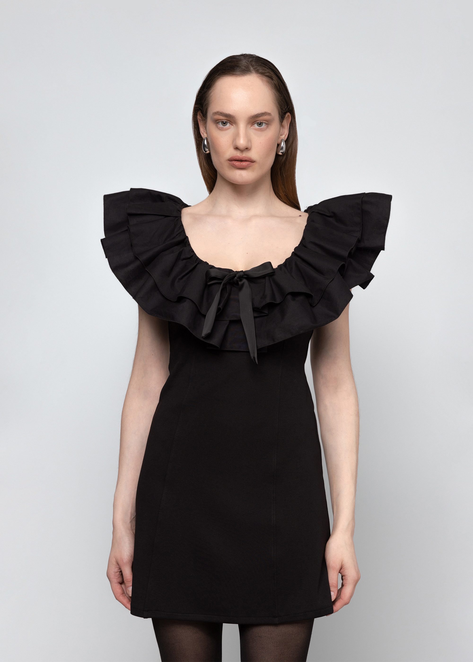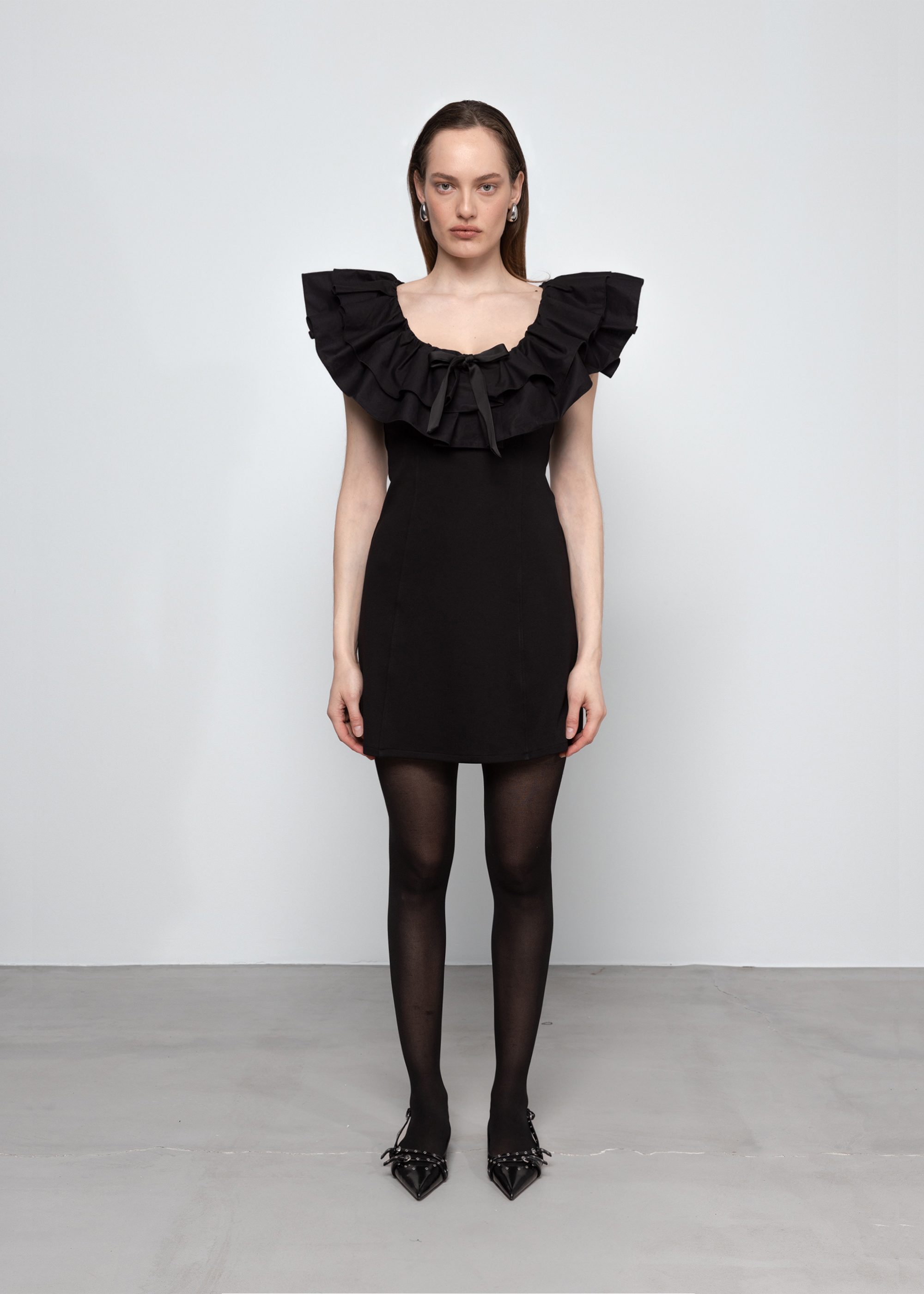 – Scooped neckline with ruffles