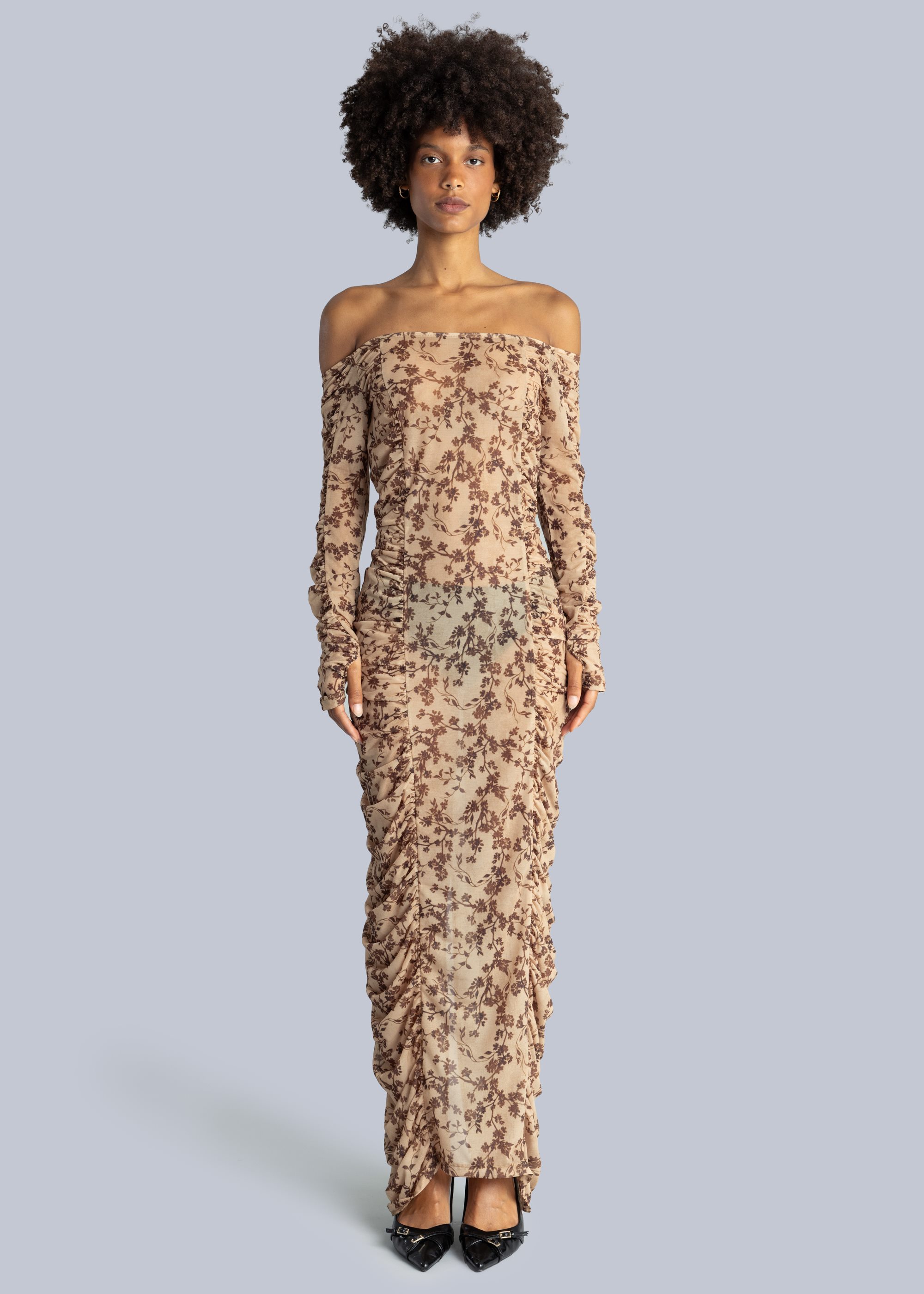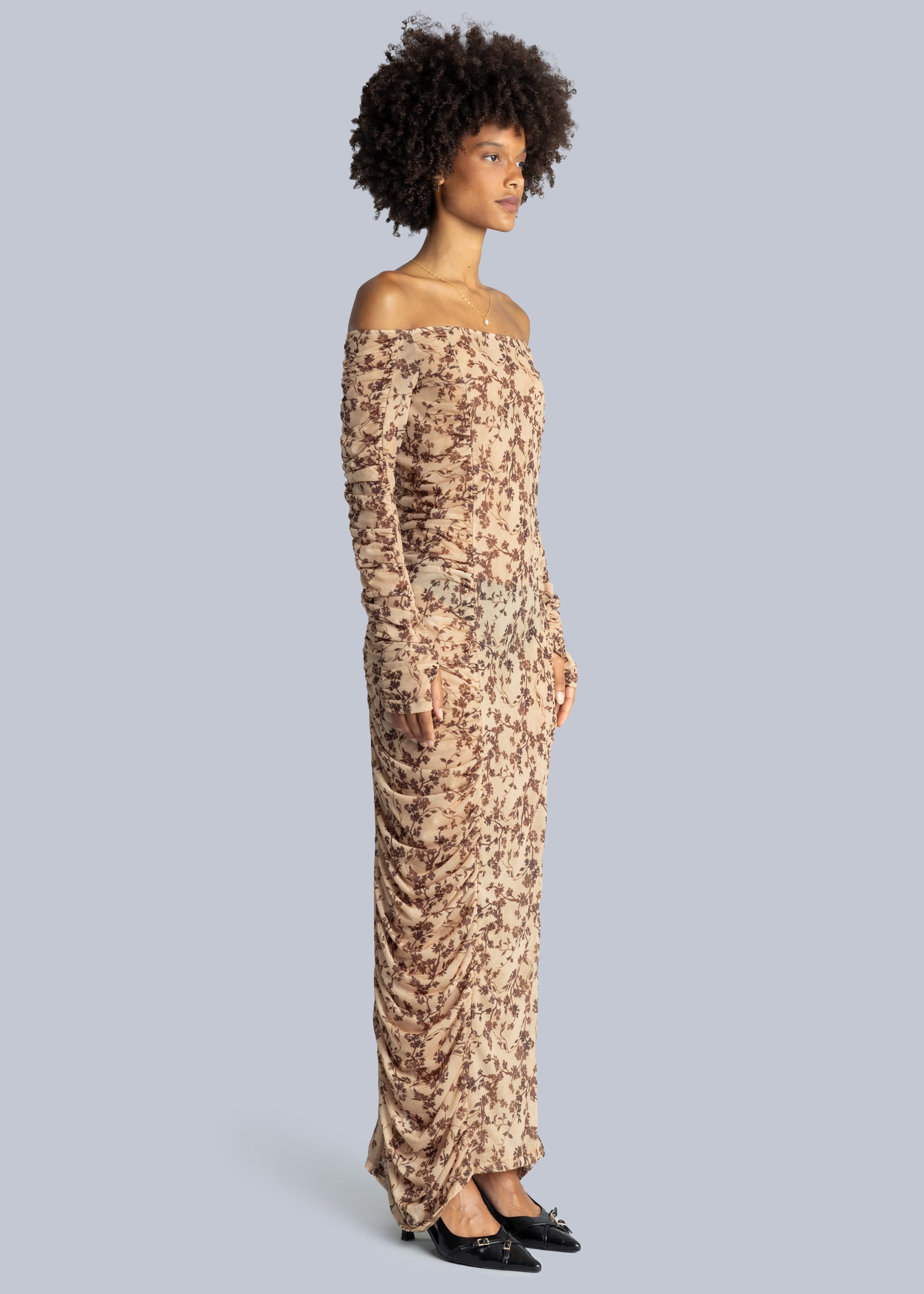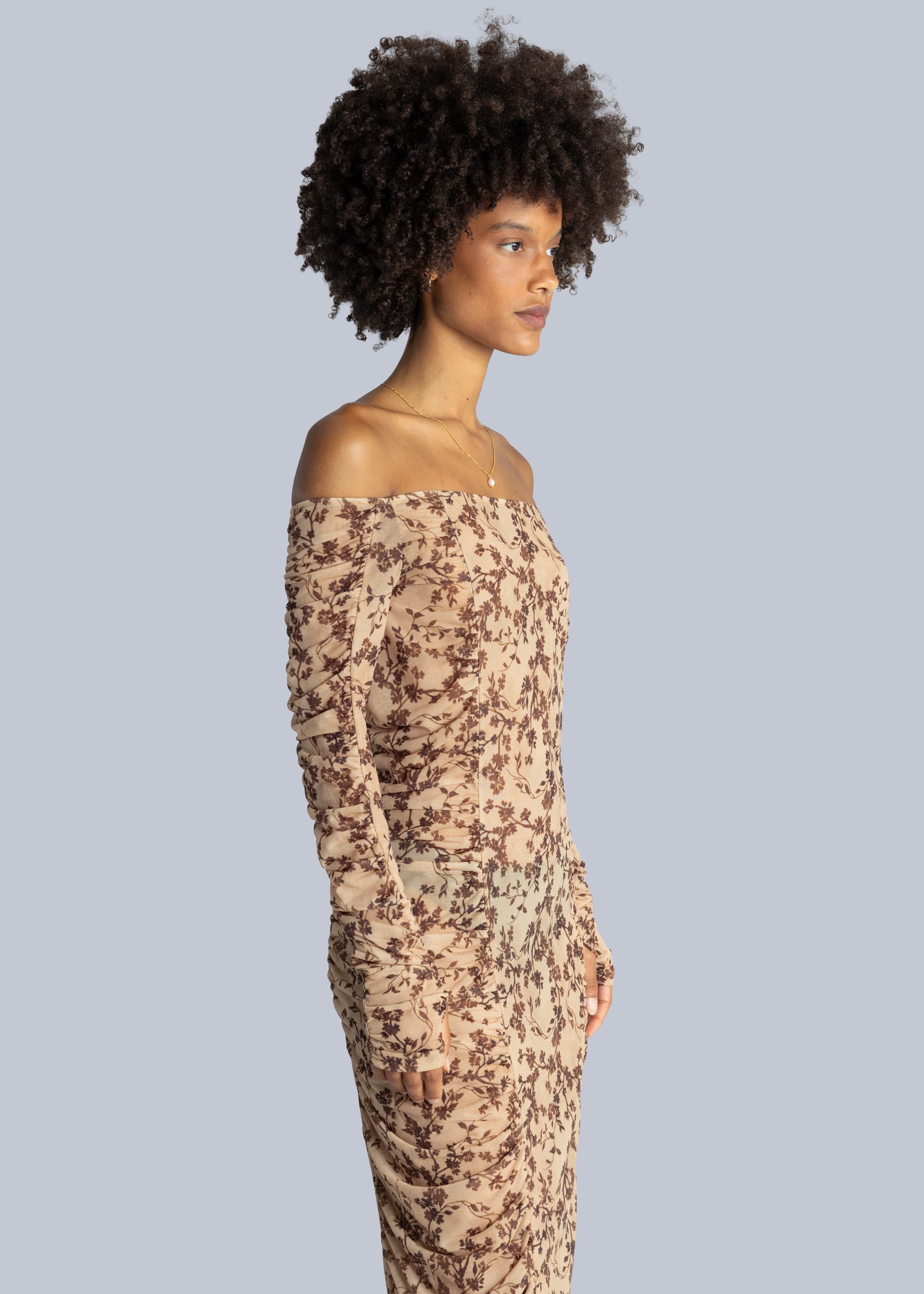 Off-shoulder, fitted midi dress in a vintage florals print. Features fixed ruching panels throughout, semi-sheer fabric, and a back split. Printed design adds visual interest.
