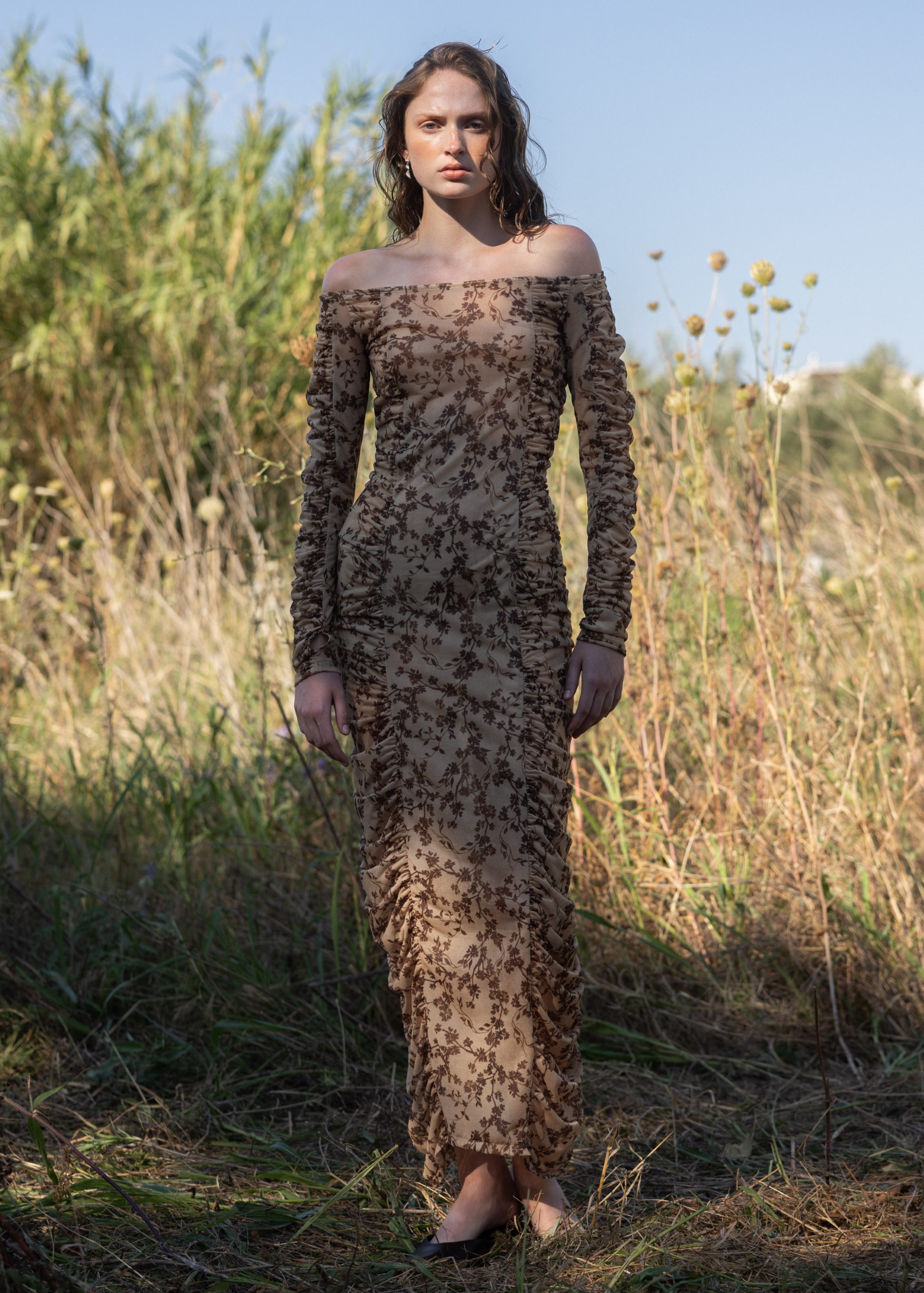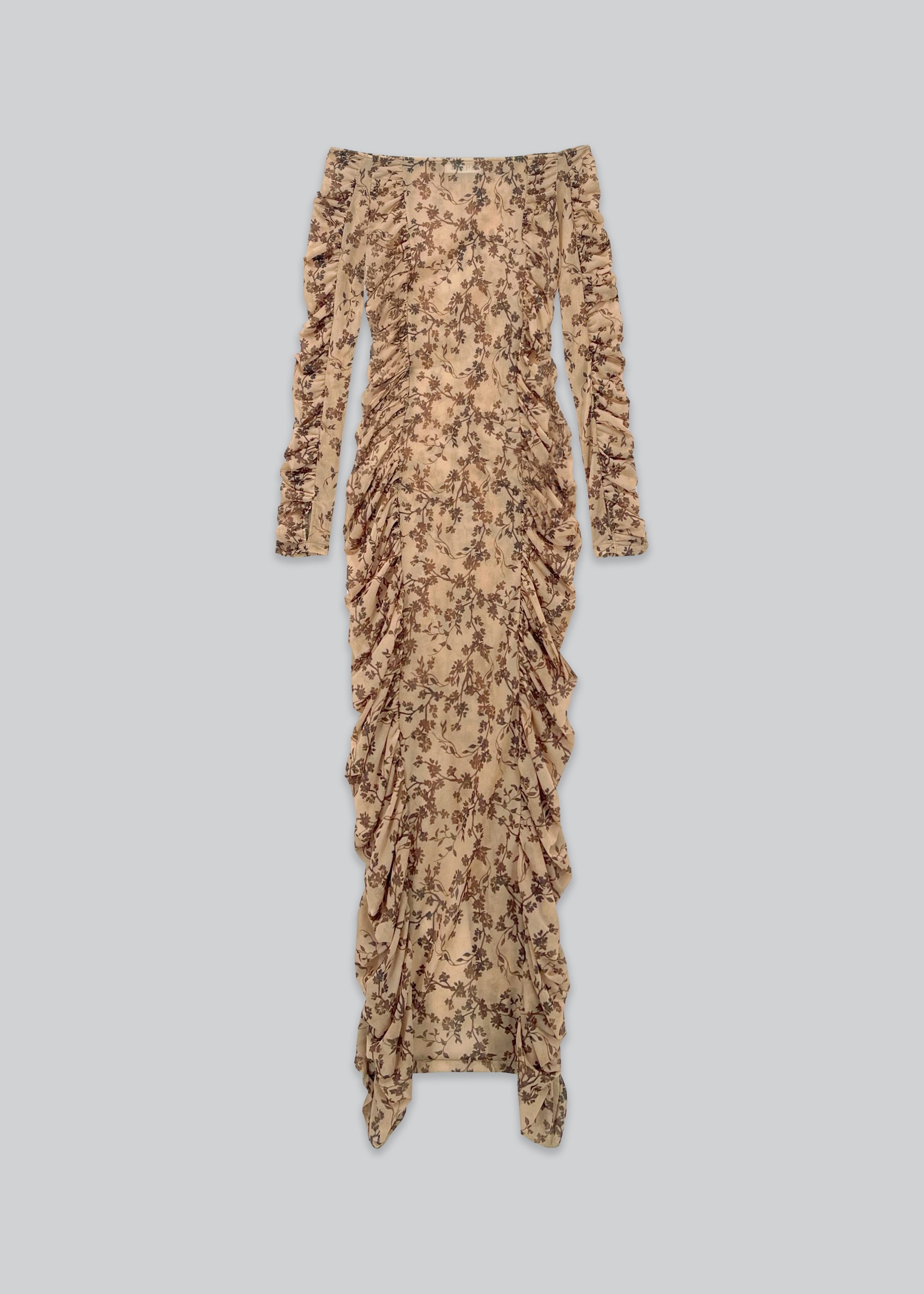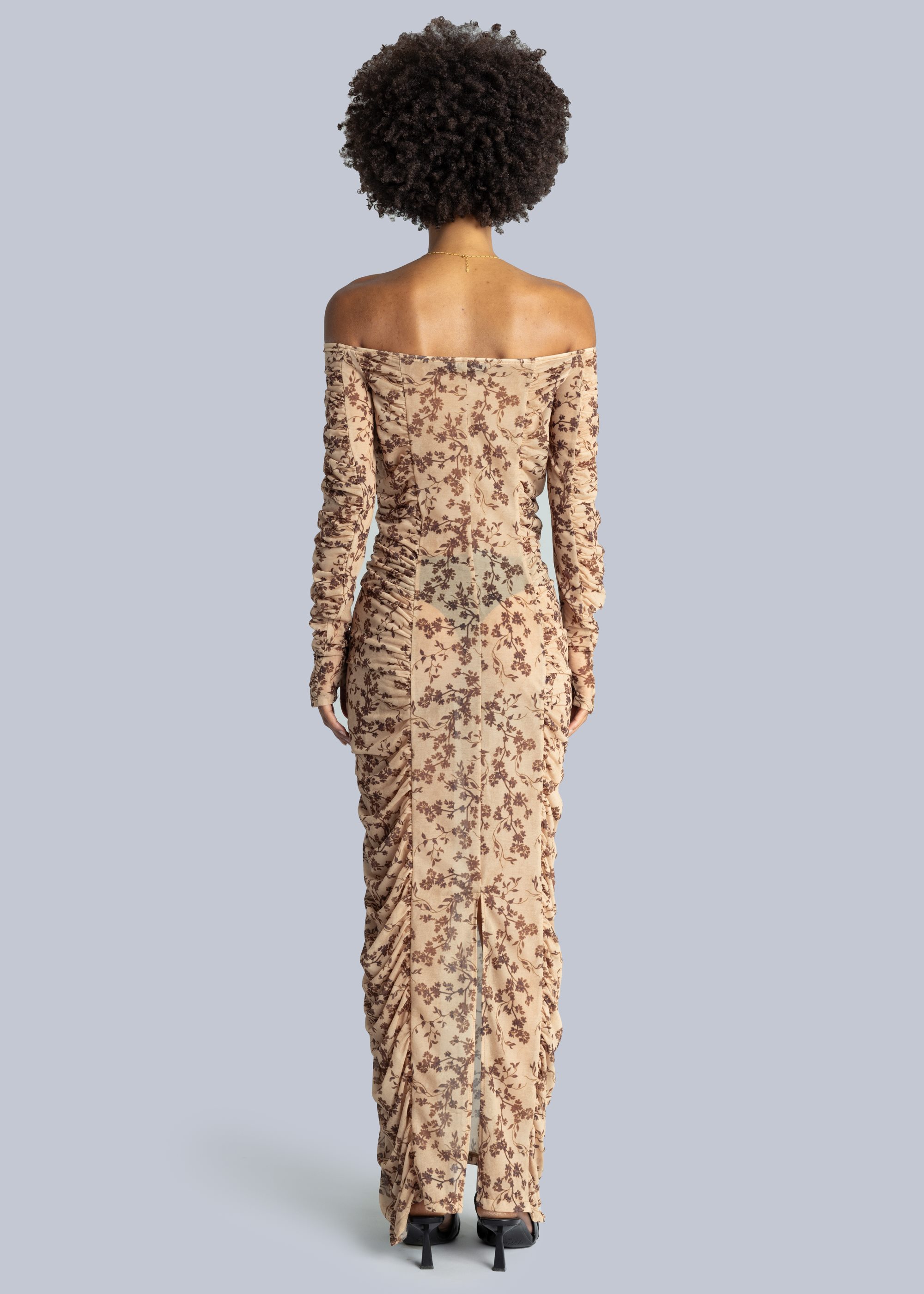 Off-shoulder, fitted midi dress in a vintage florals print. Features fixed ruching panels throughout, semi-sheer fabric, and a back split. Printed design adds visual interest.