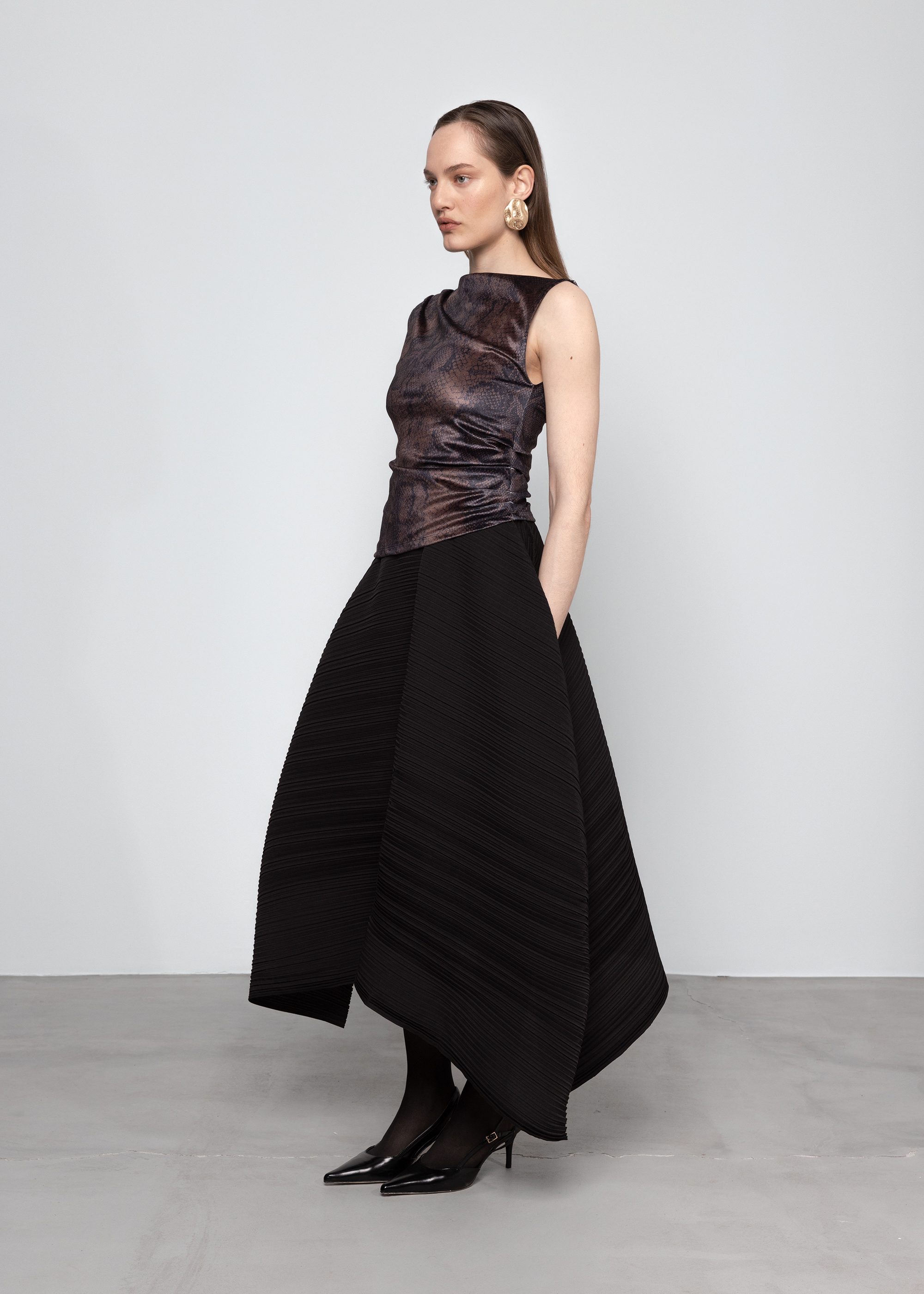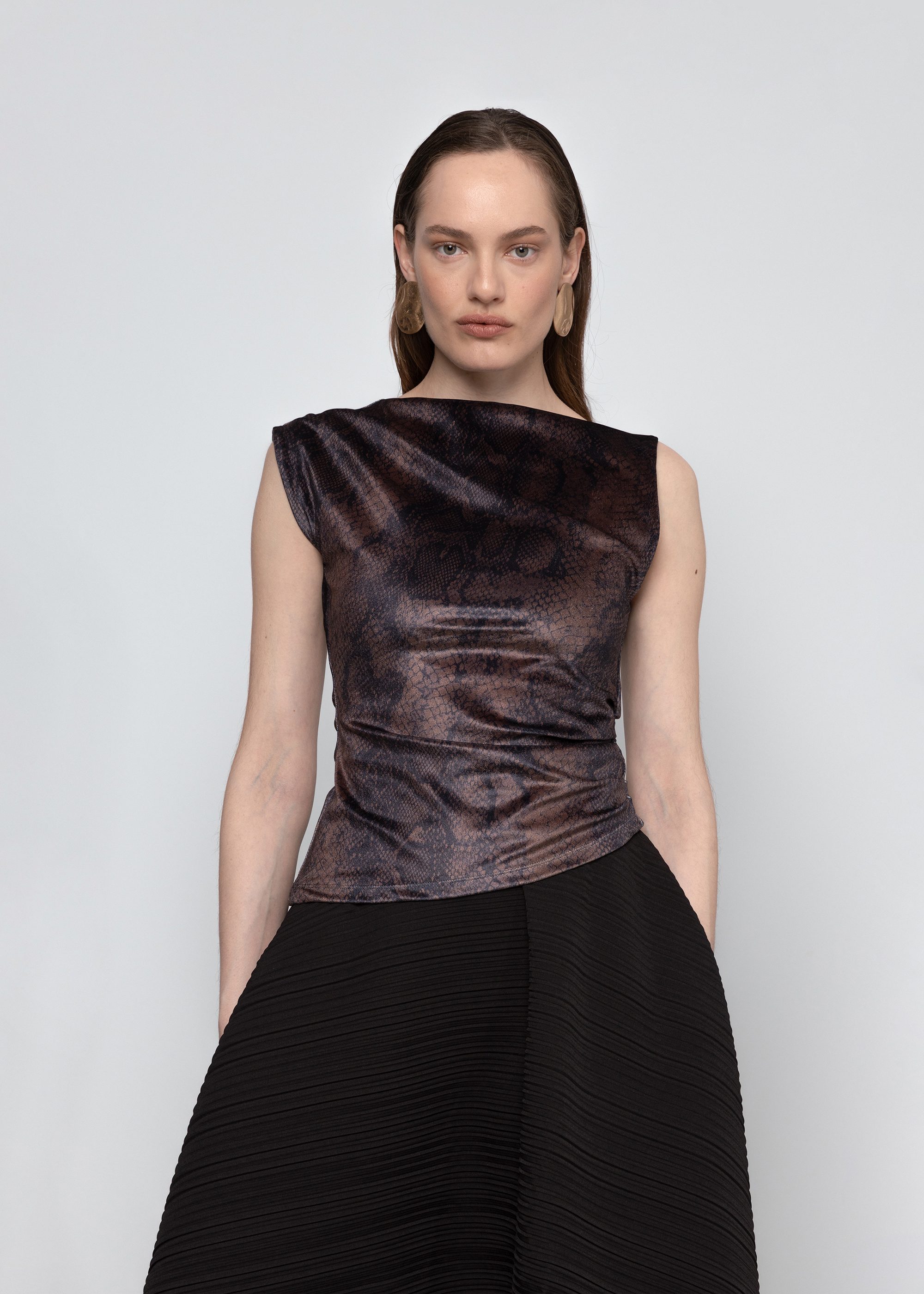 A fitted velvet top with a straight neckline and printed finish. Subtle gathers enhance shape, making it an easy choice for evening looks.