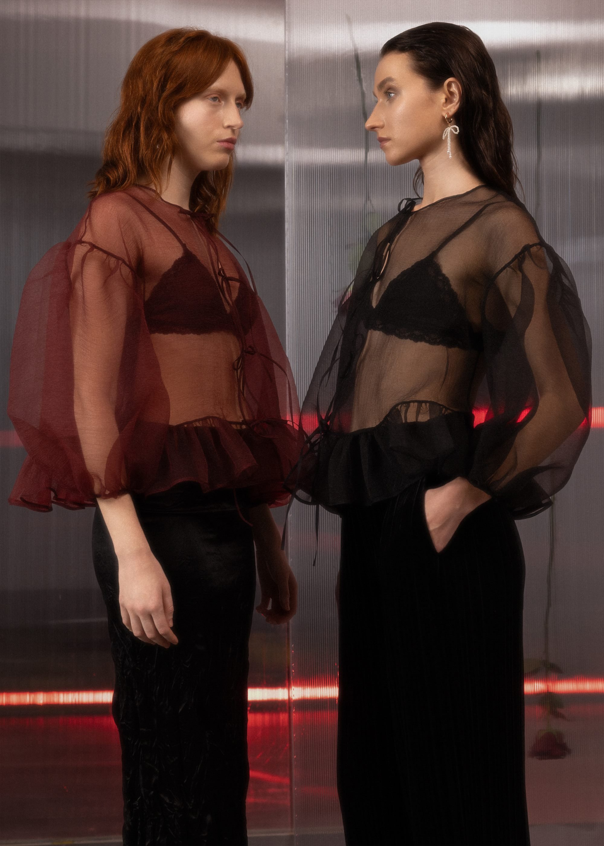 Designed in sheer lightweight organza, this oversized fit top features three rows of statement bows, blending elegance with bold design. Perfect for layering, its airy construction offers both style and versatility. The striking red hue adds a vibrant touch to your wardrobe staples.