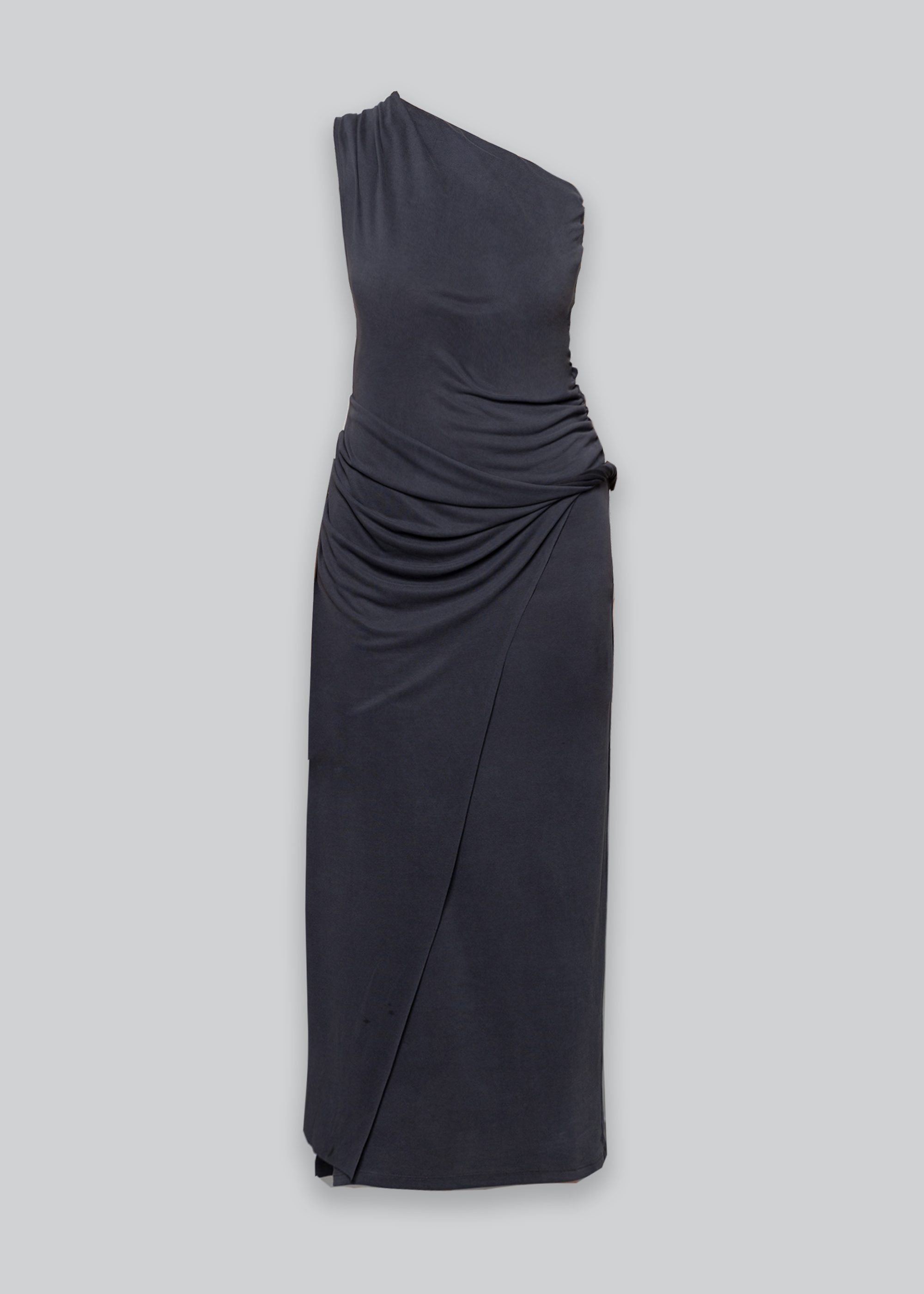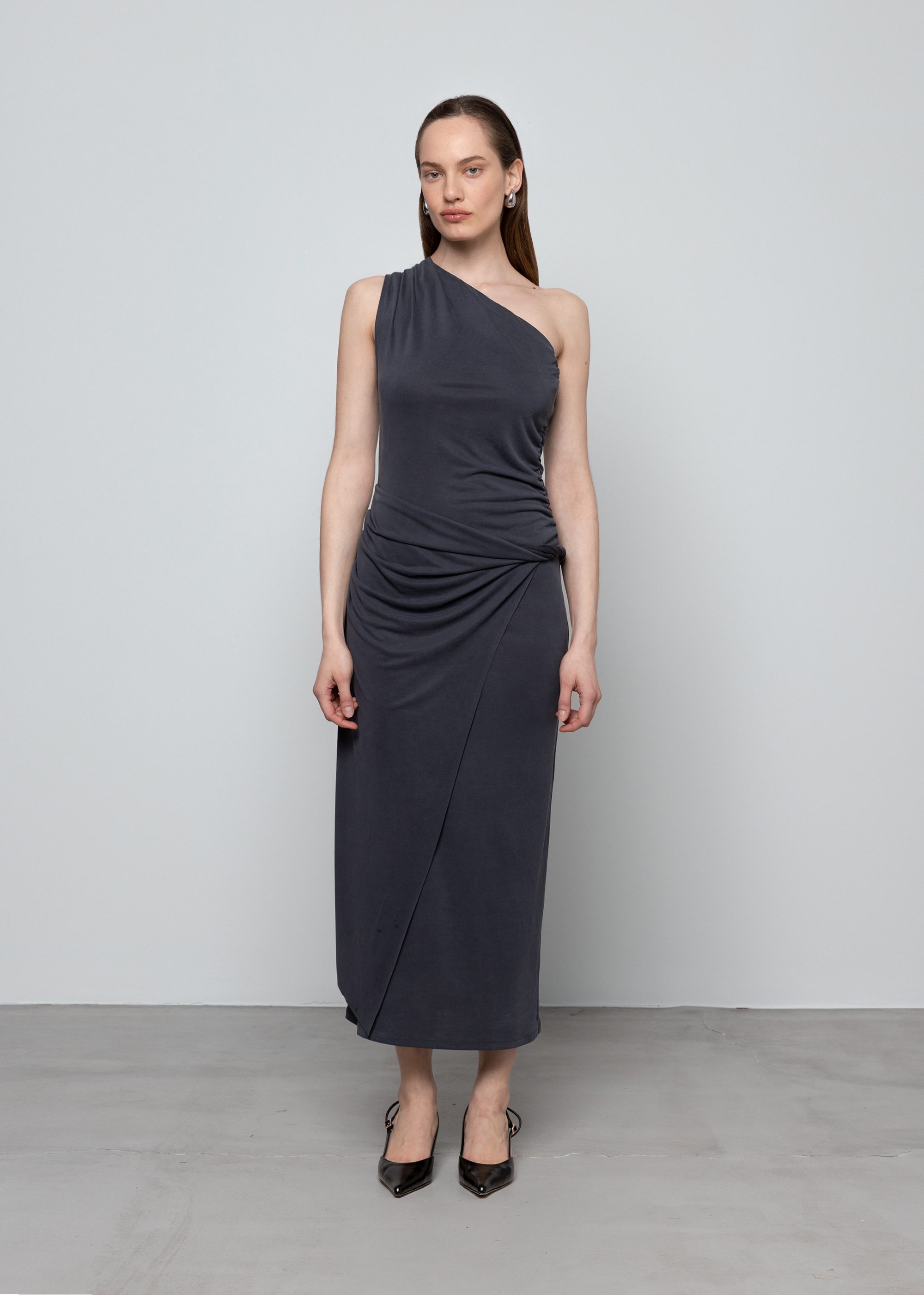A draped asymmetric midi dress designed to create fluid movement. A modern choice for events and polished everyday styling.