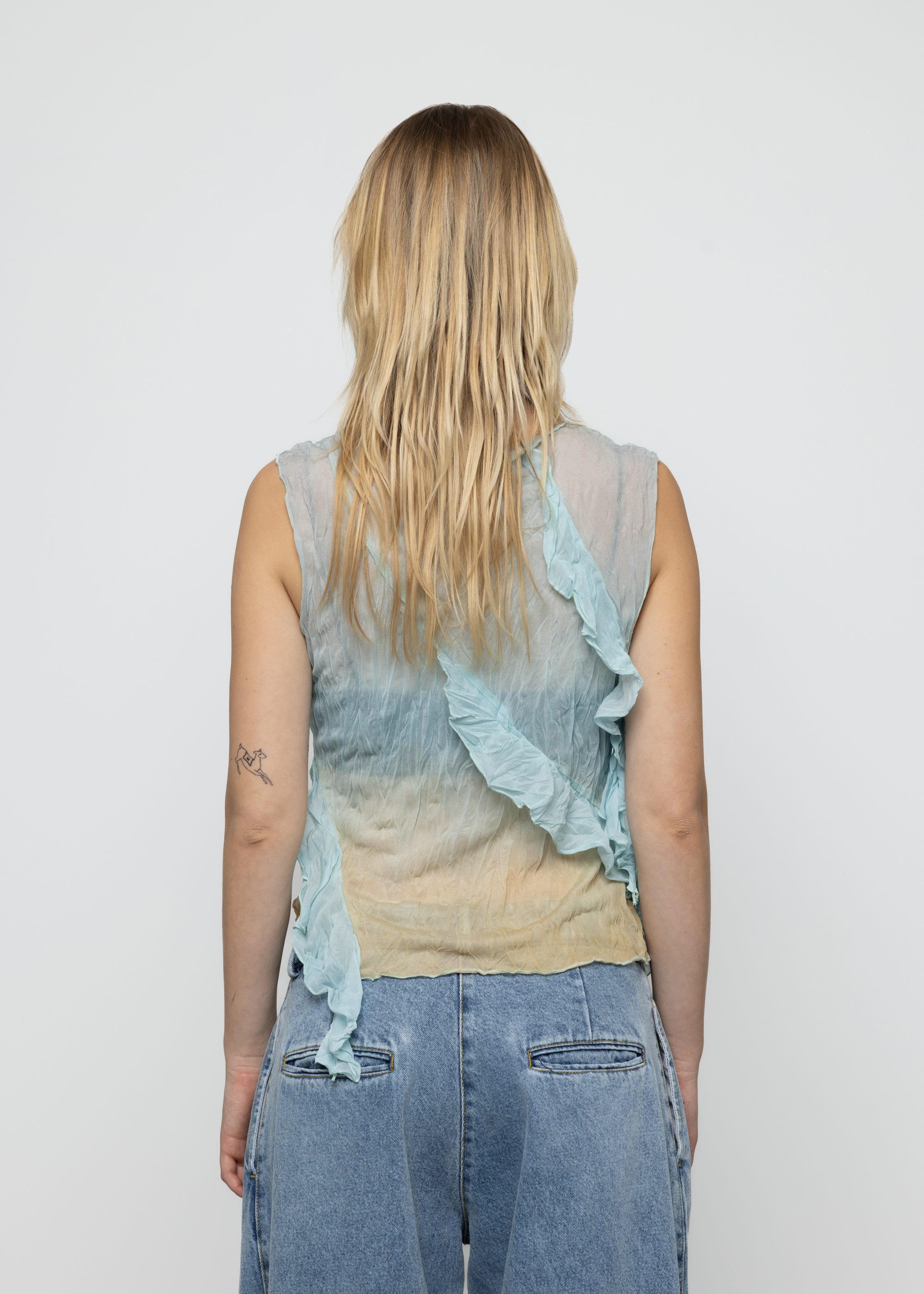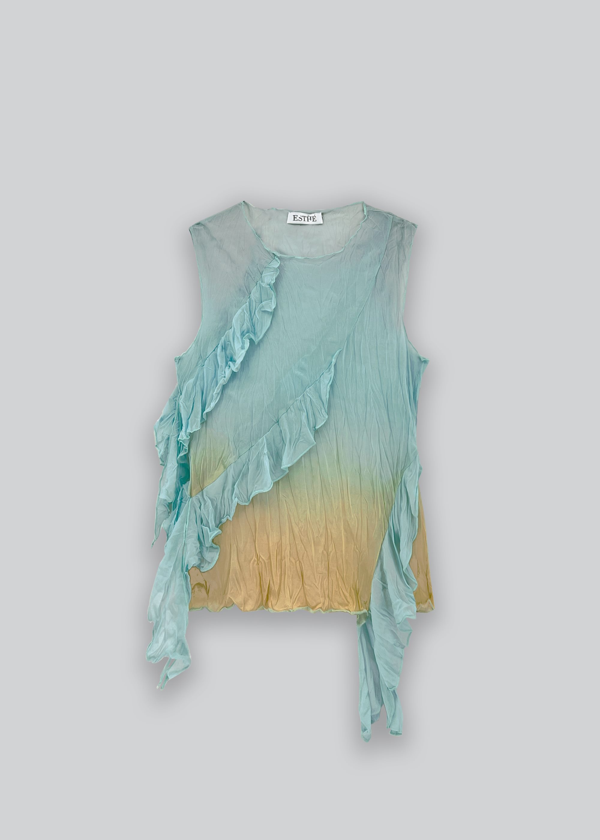 This breeze ombre print top features lightweight crinkle sheer fabric with slim-fit silhouette. Asymmetric frills and printed design with raw edge seams for unique styling.