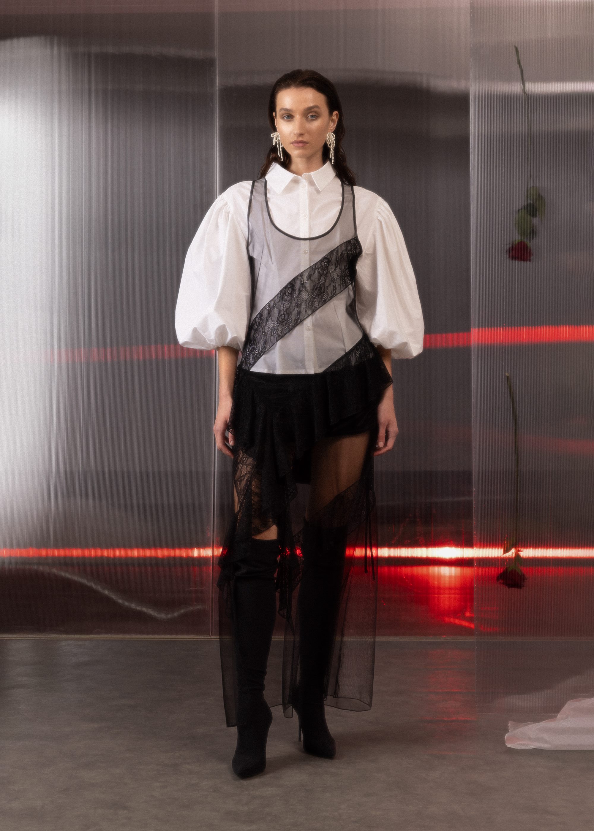 Crafted from lightweight sheer tulle fabric, this sleeveless midi-length dress features a relaxed fit with a crew neckline. Asymmetric lace seam lines at the front and back add a delicate detail. Unlined for an airy feel, it’s designed with effortless elegance in mind.