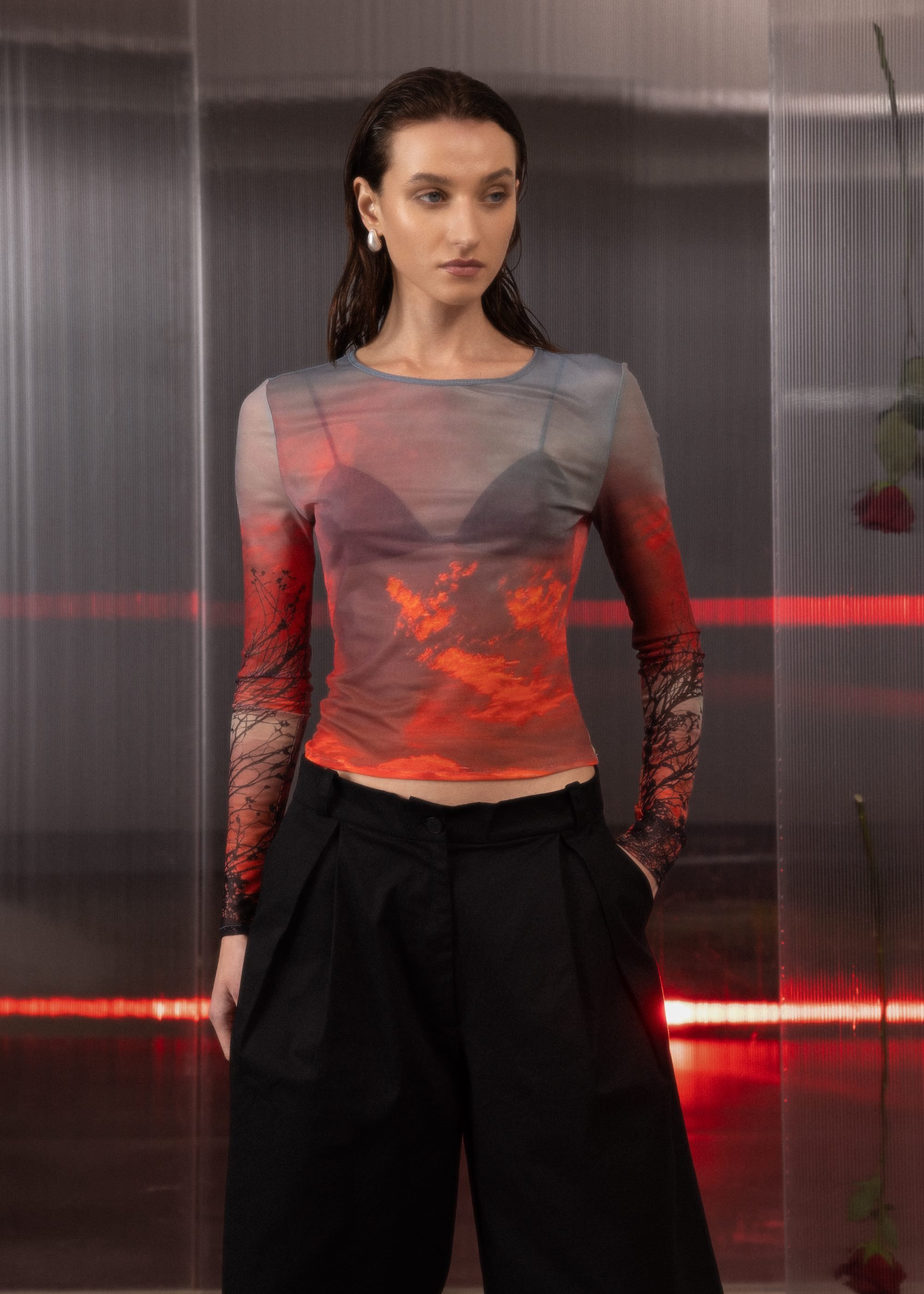 Lightweight and stretchy, this see-through top features a striking Crimson Dusk Print. Its fitted design, long sleeves, and all-over print make it both versatile and bold, perfect for layering or standing out on its own.