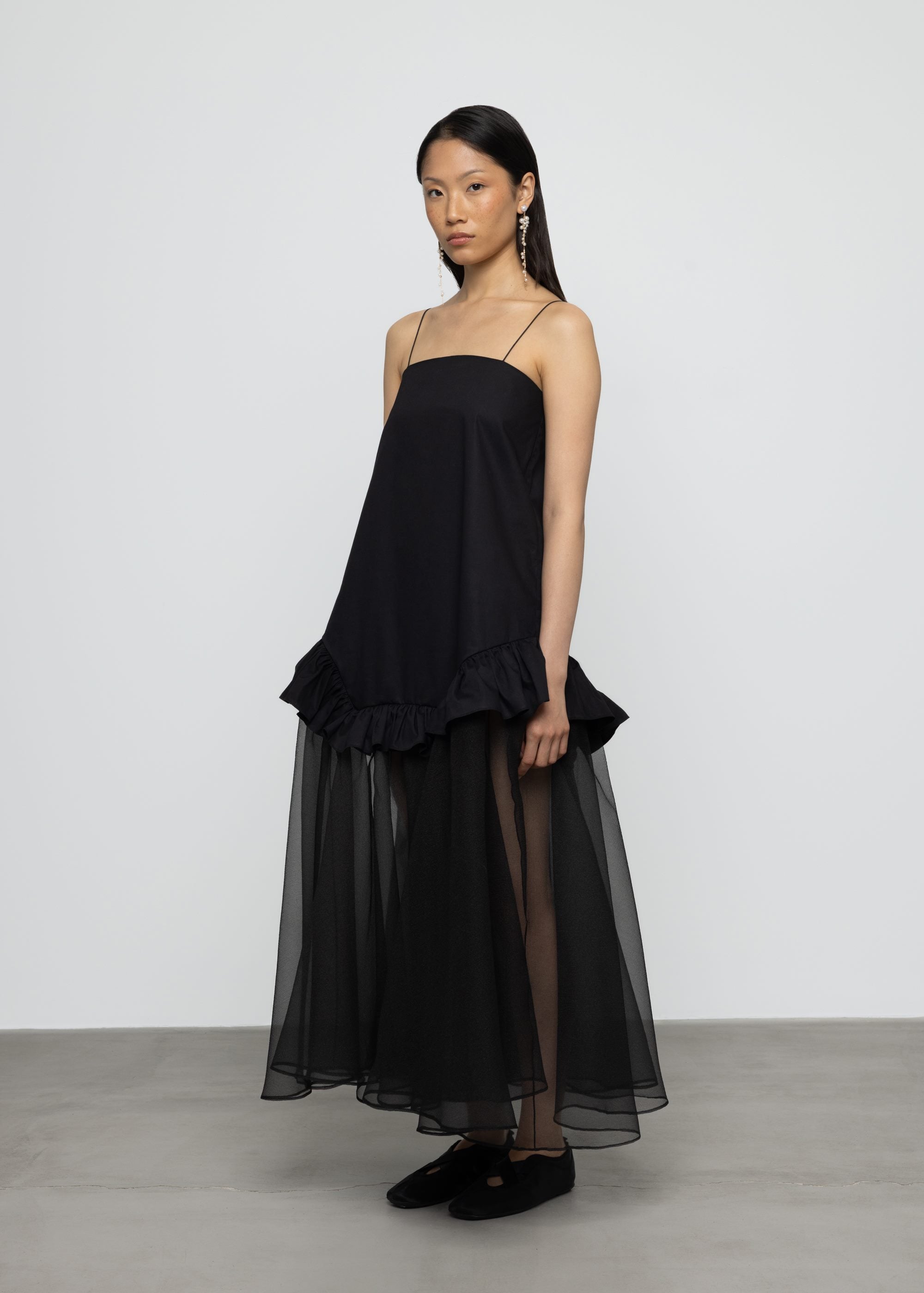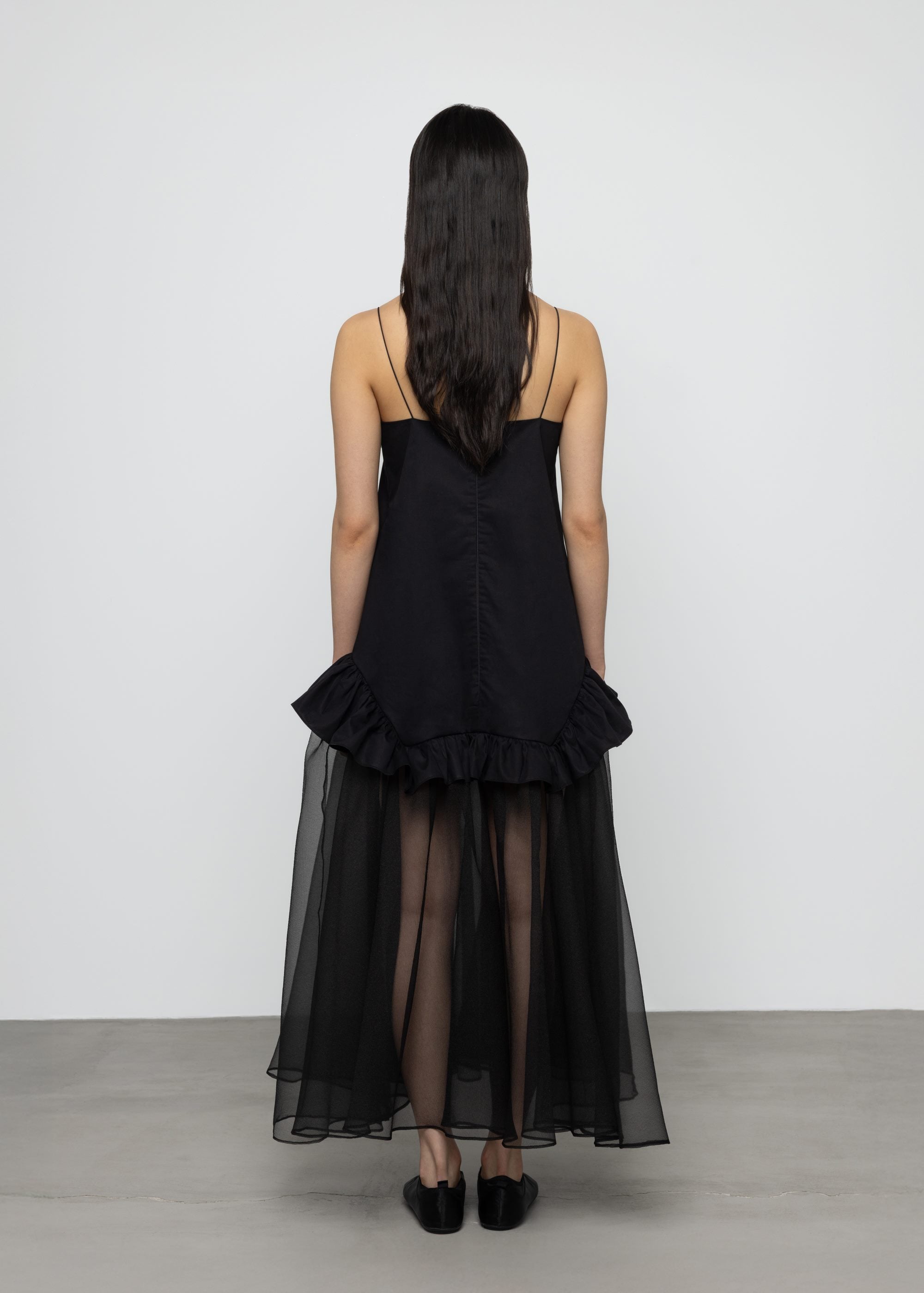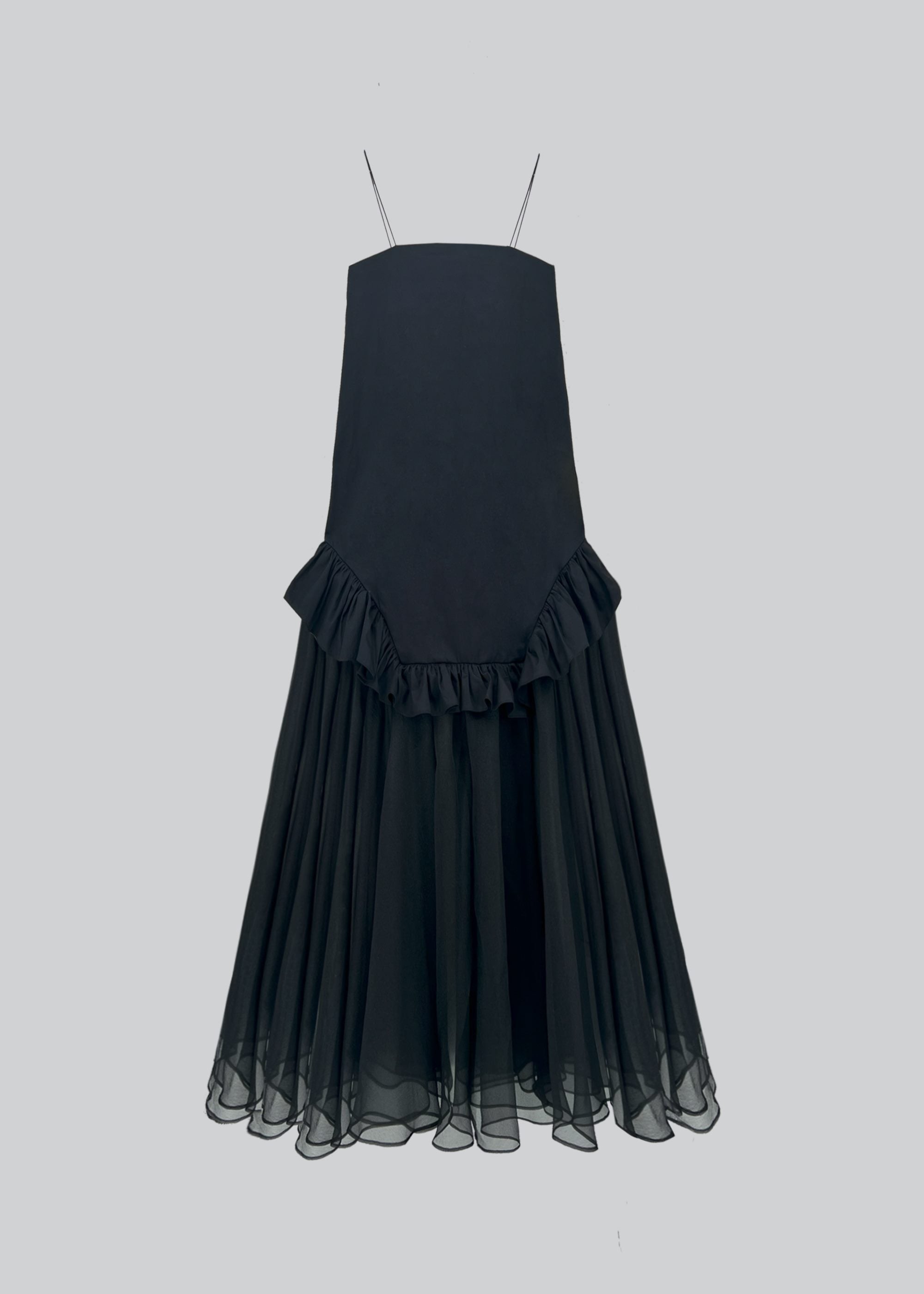 This black maxi dress features relaxed fit with spaghetti strap and sleeveless design. Frill at hip seam with organza volume skirt for elegant movement.