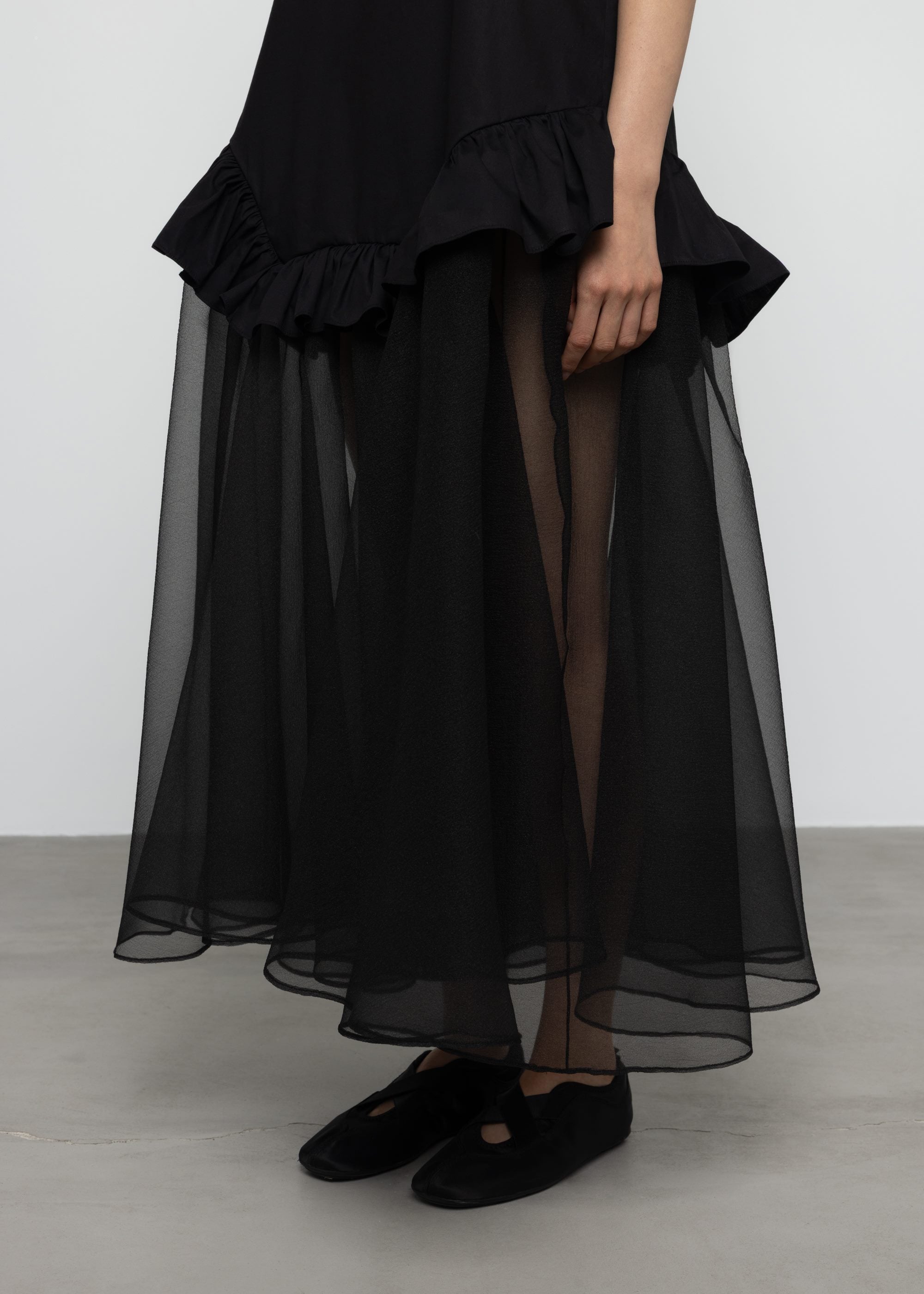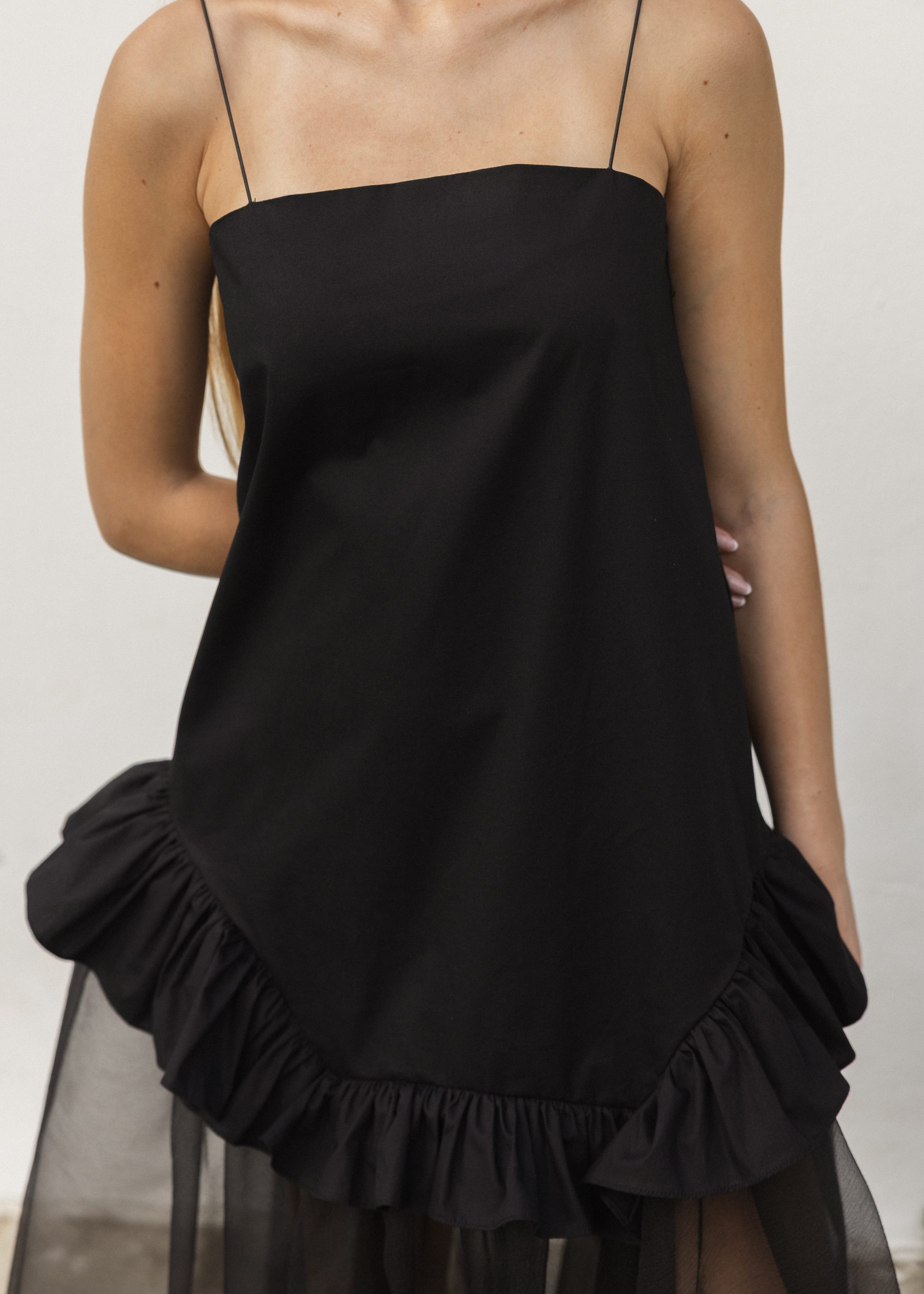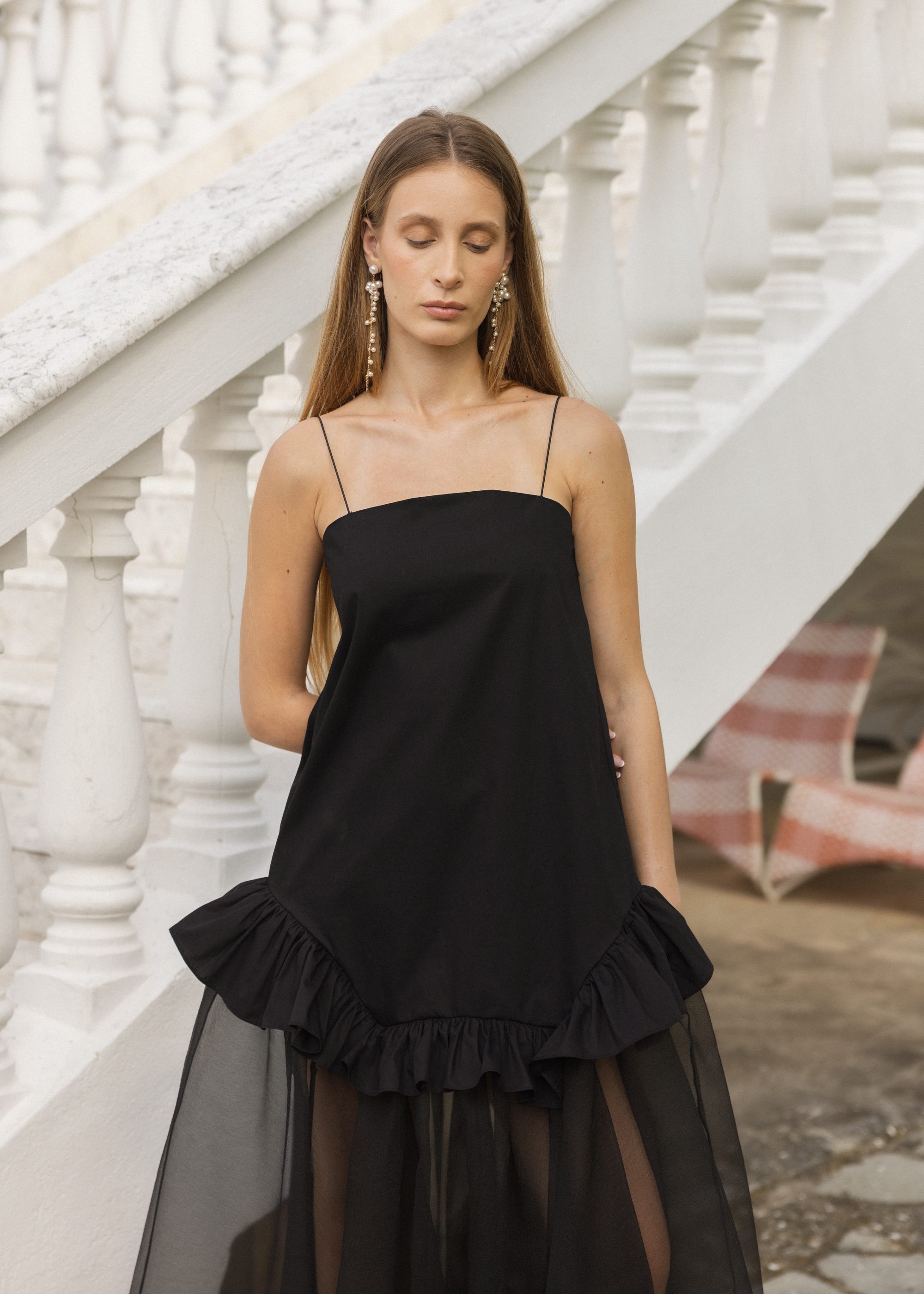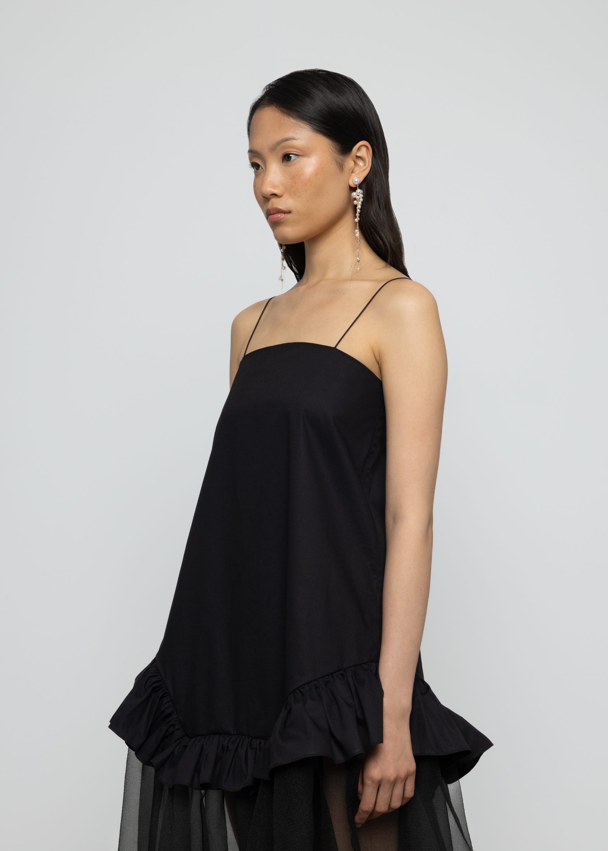 This black maxi dress features relaxed fit with spaghetti strap and sleeveless design. Frill at hip seam with organza volume skirt for elegant movement.