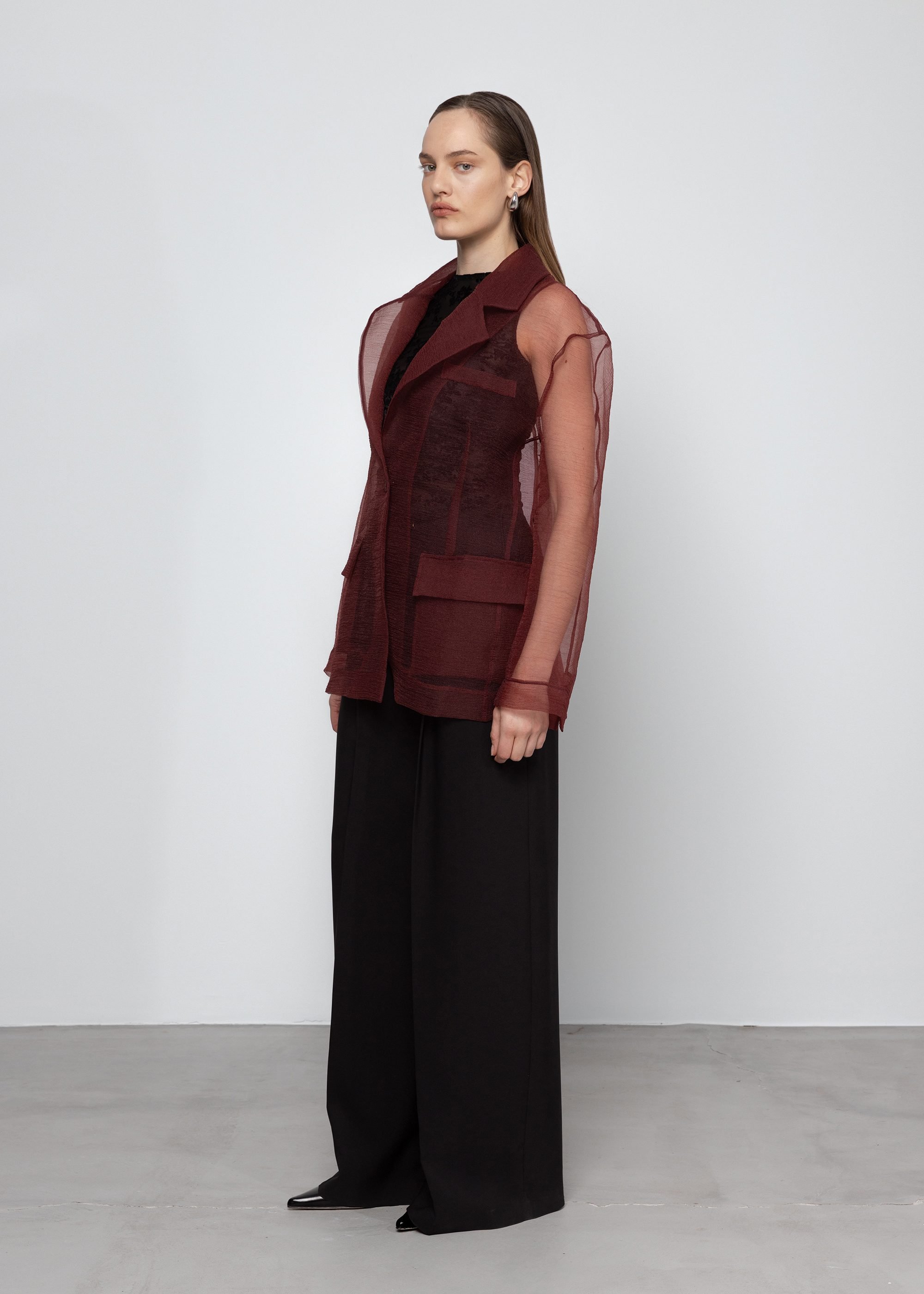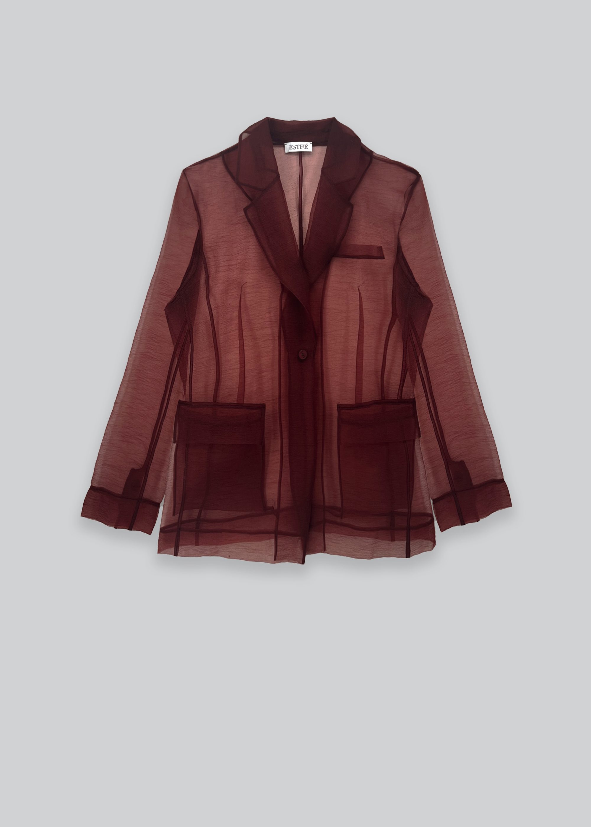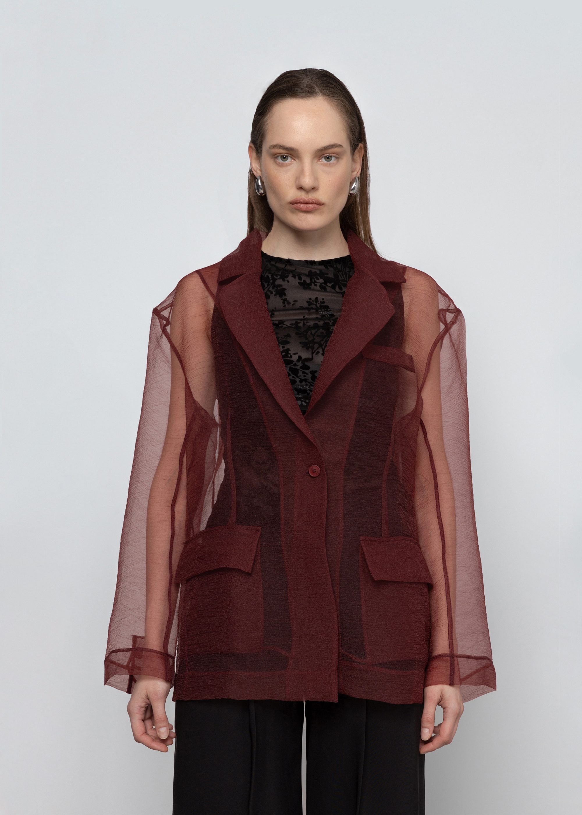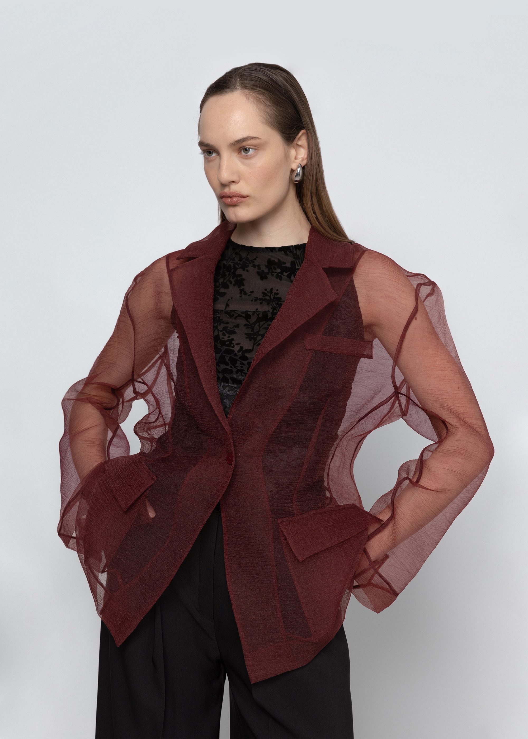 An organza blazer with a sheer finish and lightweight structure. A modern layering piece that elevates simple looks.
