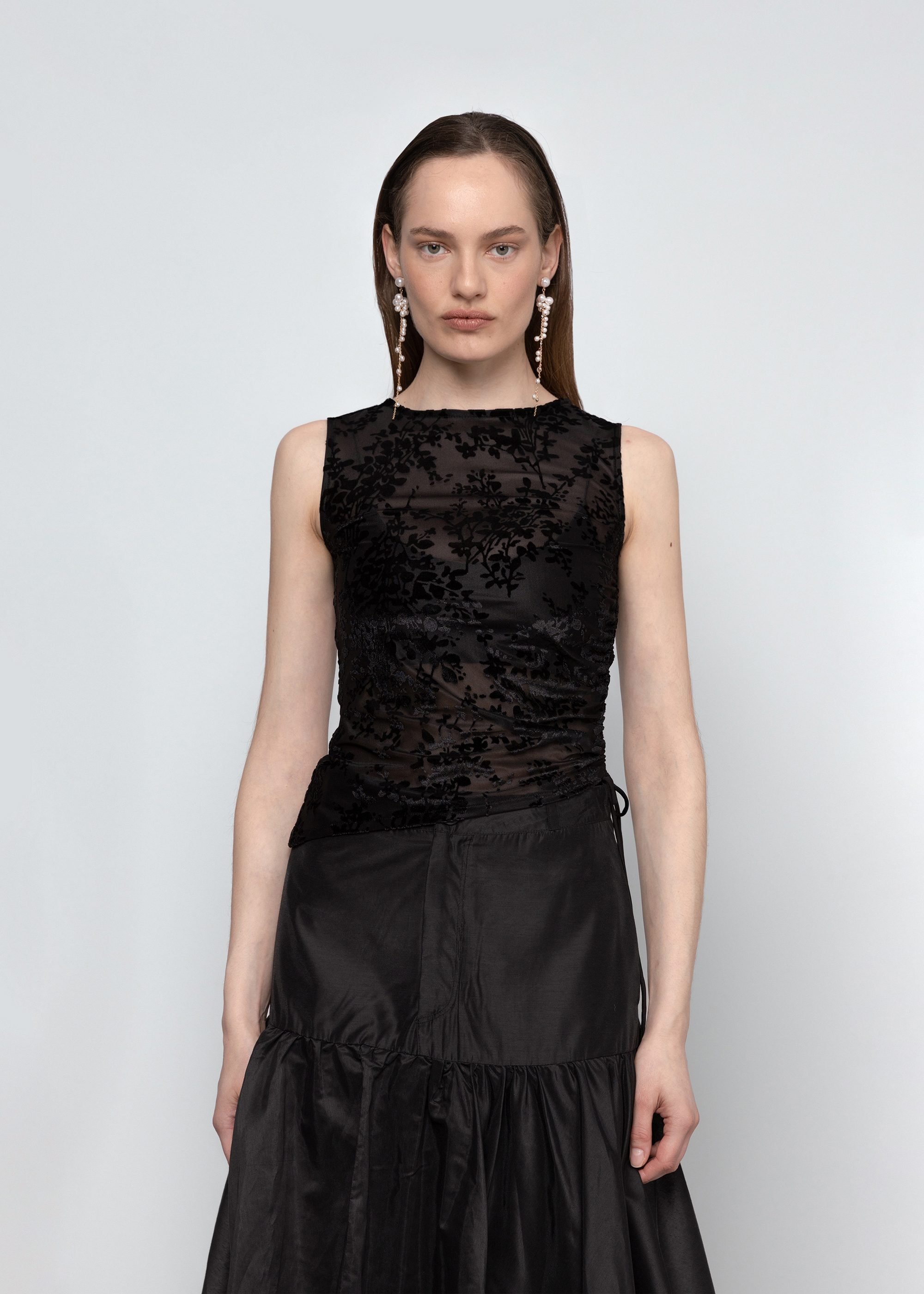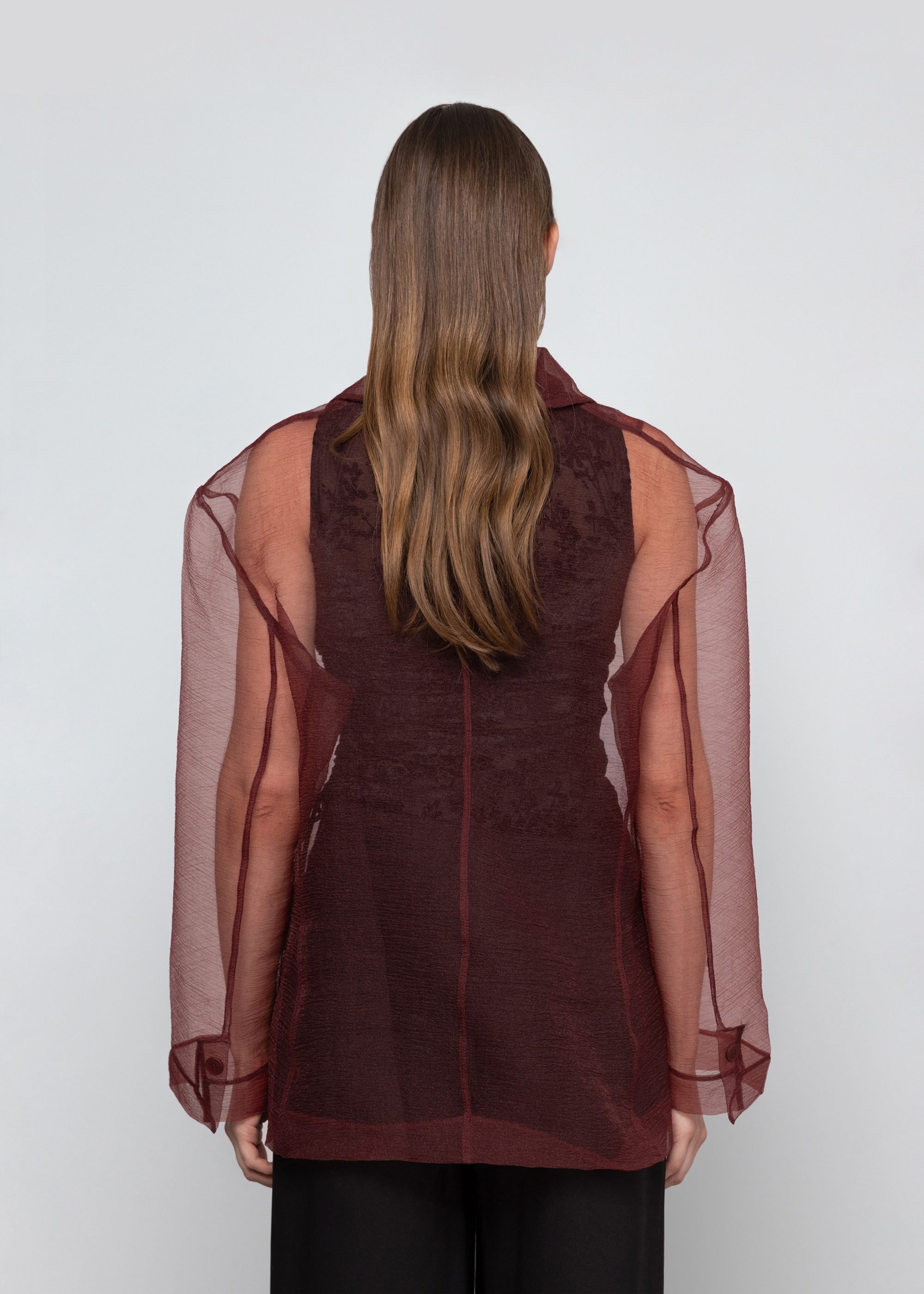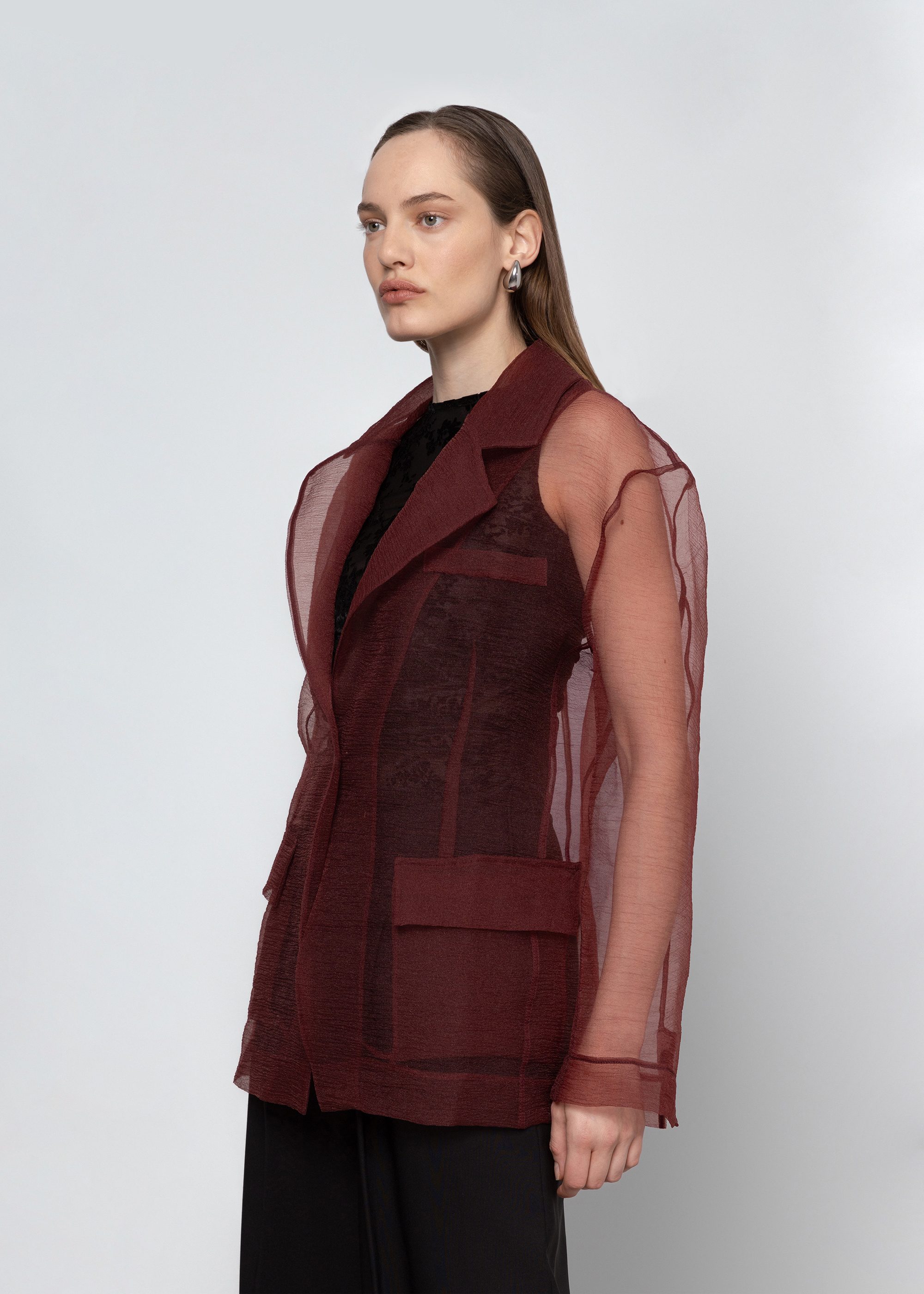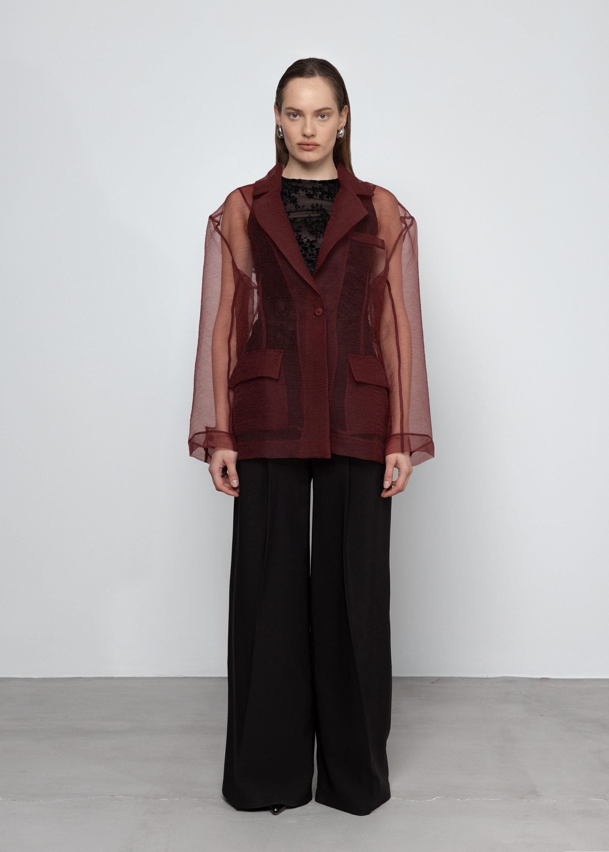 An organza blazer with a sheer finish and lightweight structure. A modern layering piece that elevates simple looks.