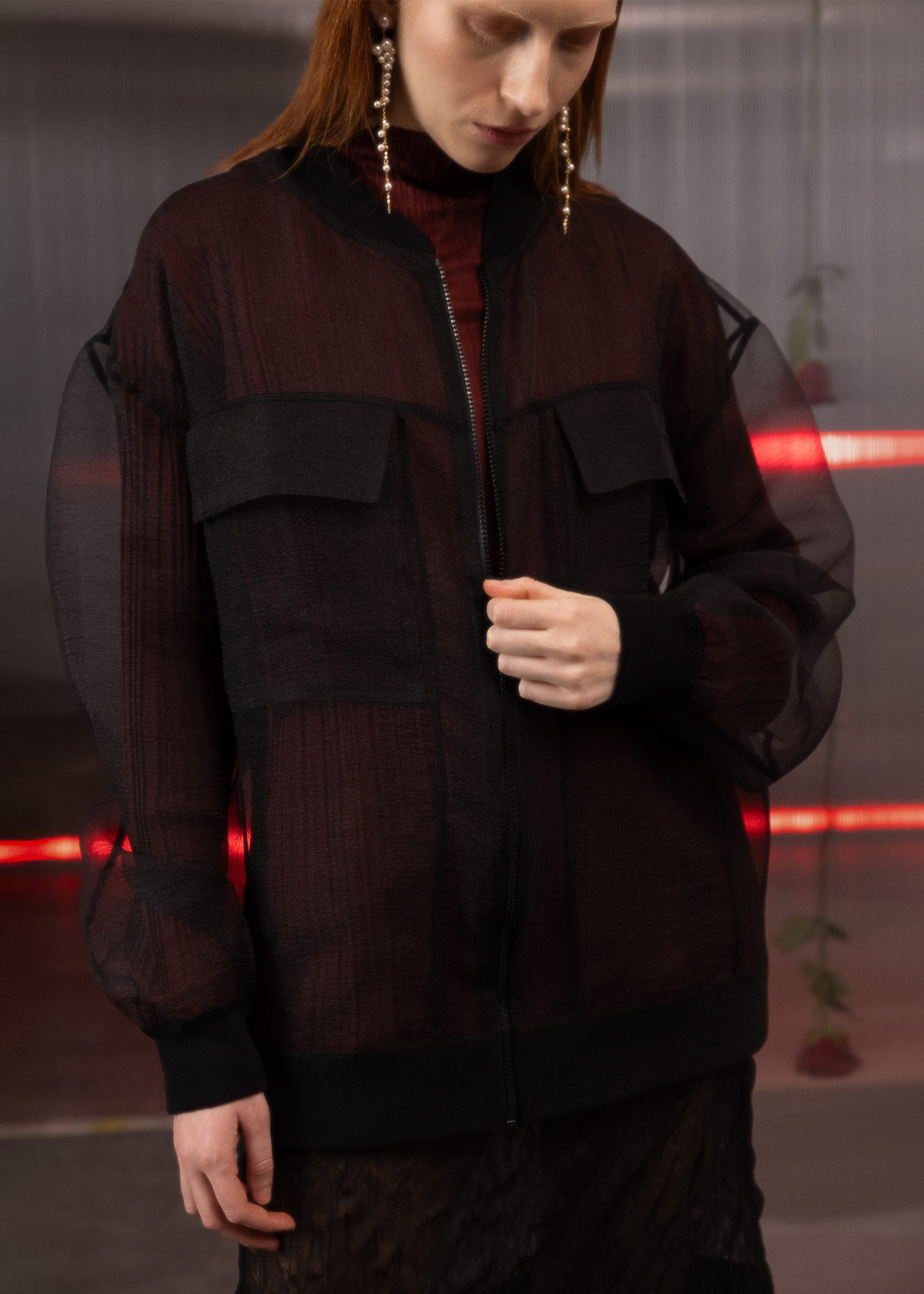 Designed with a sheer lightweight organza fabric, this hip-length piece features an oversized fit that runs large, offering a modern and relaxed silhouette.