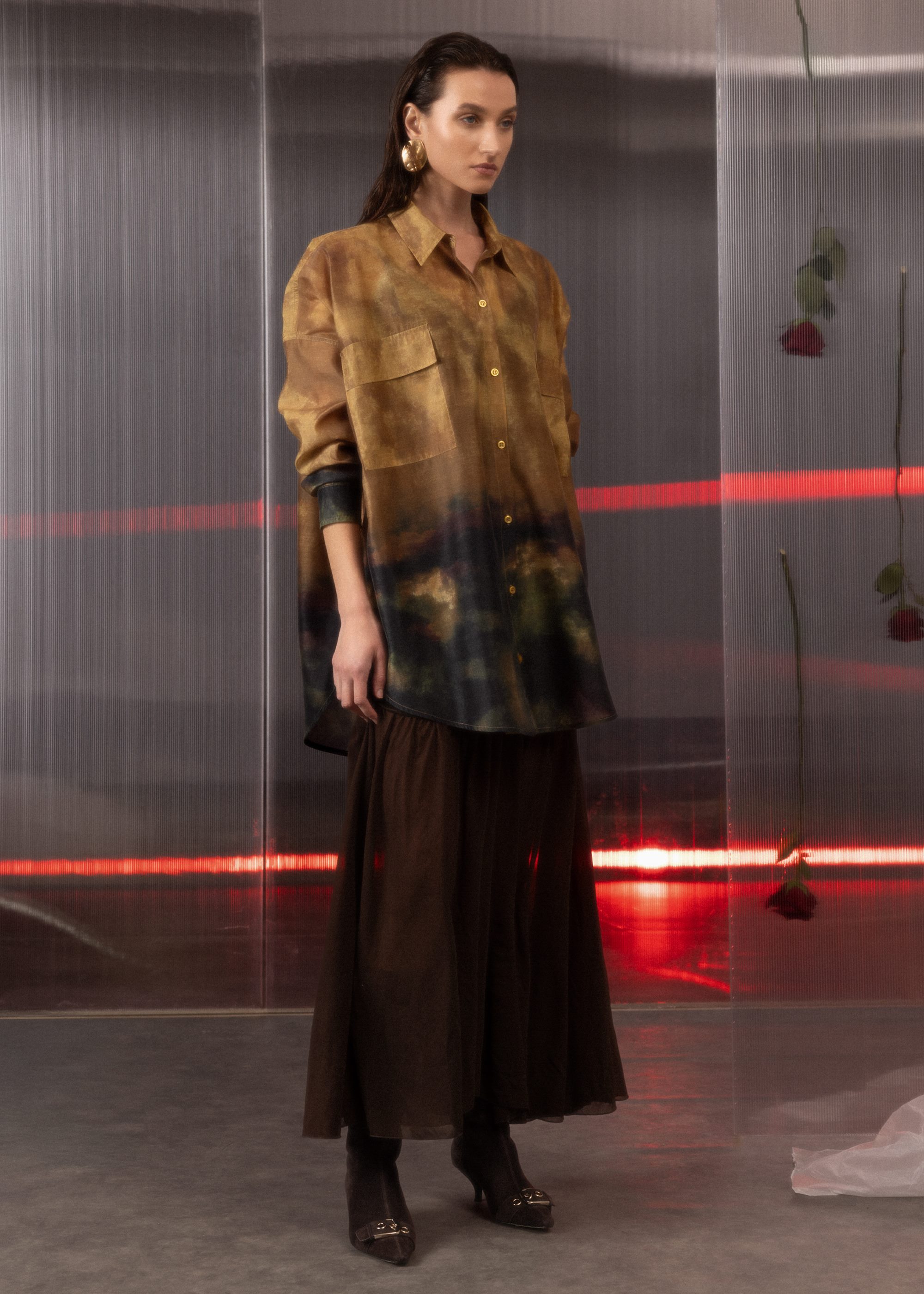 Lightweight, semi-stretch organza fabric with an oversized fit offers an effortlessly chic silhouette. Features front button closure, buttoned cuffs, and two breast patch pockets. The see-through design adds an airy, modern touch.