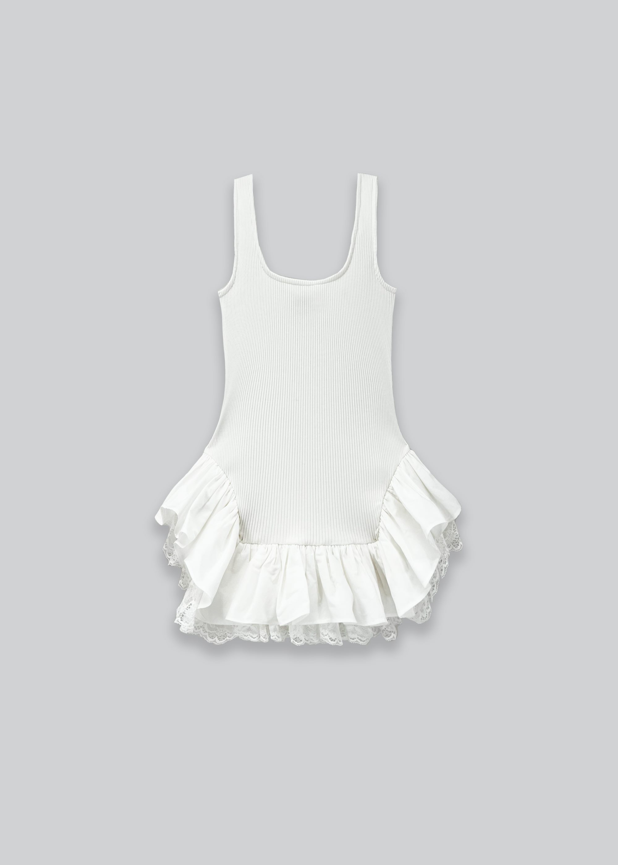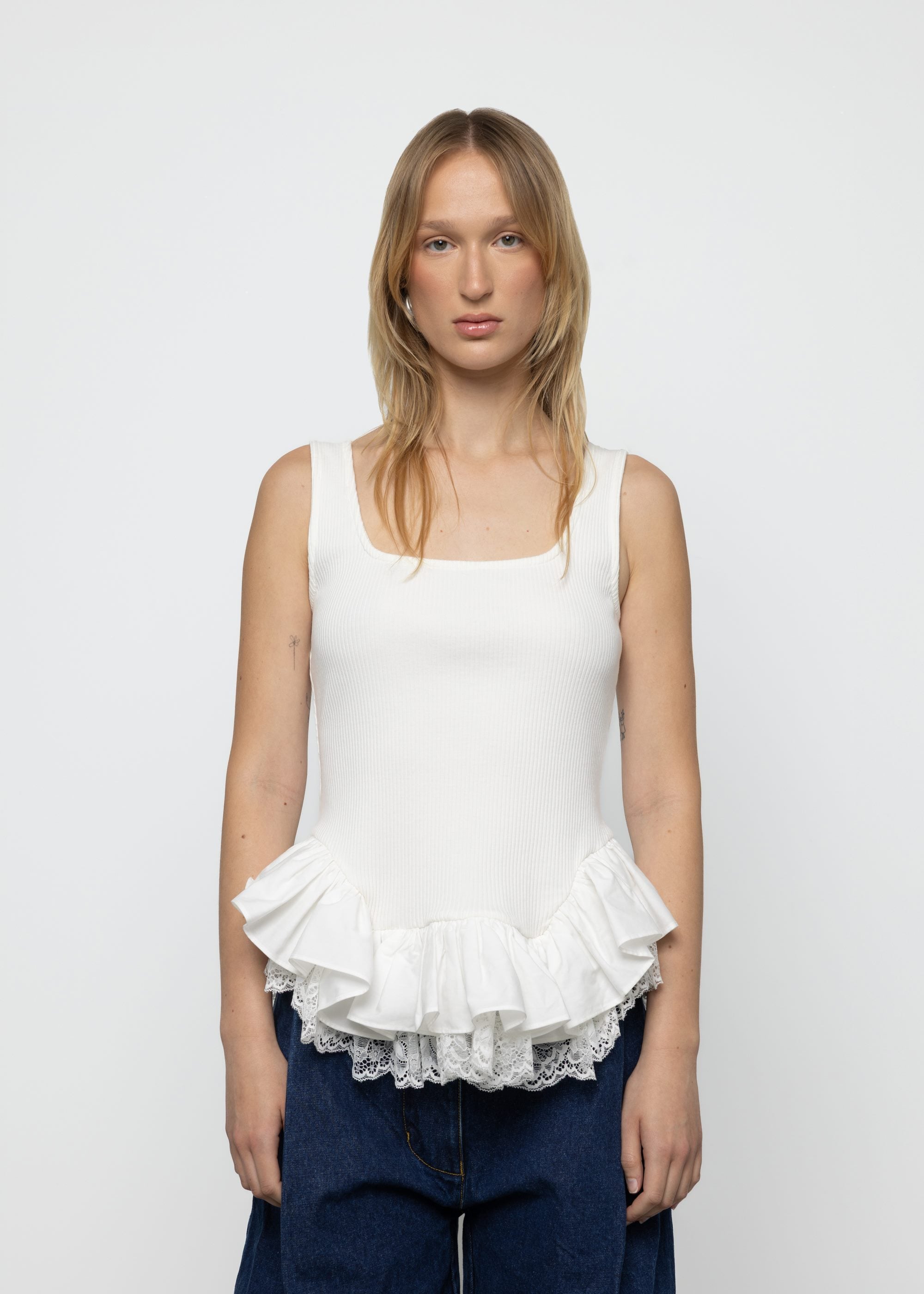 This white top features fitted silhouette with stretchy rib construction. Round neckline and sleeveless with angular hip seam. Made from sustainable materials for conscious style.