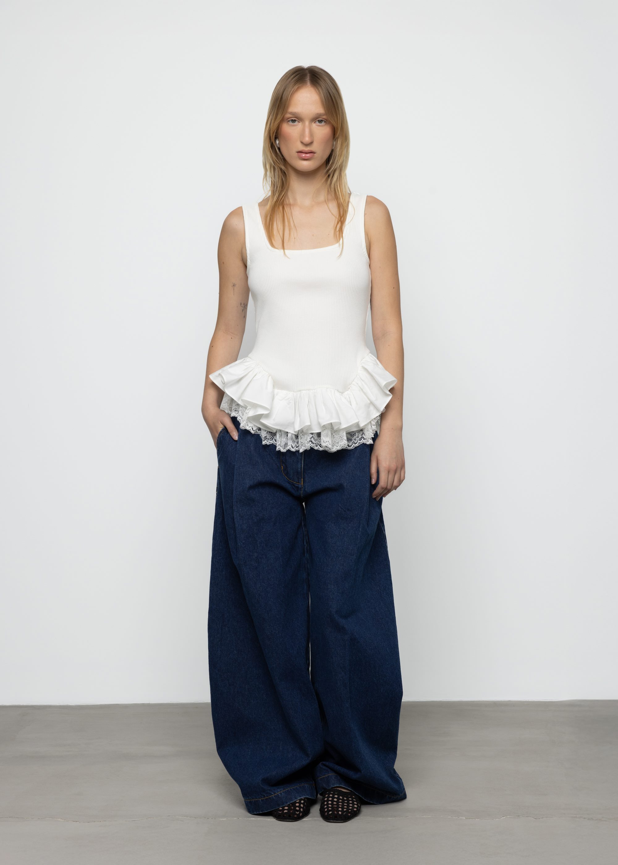 – Angular hip seam with poplin and lace