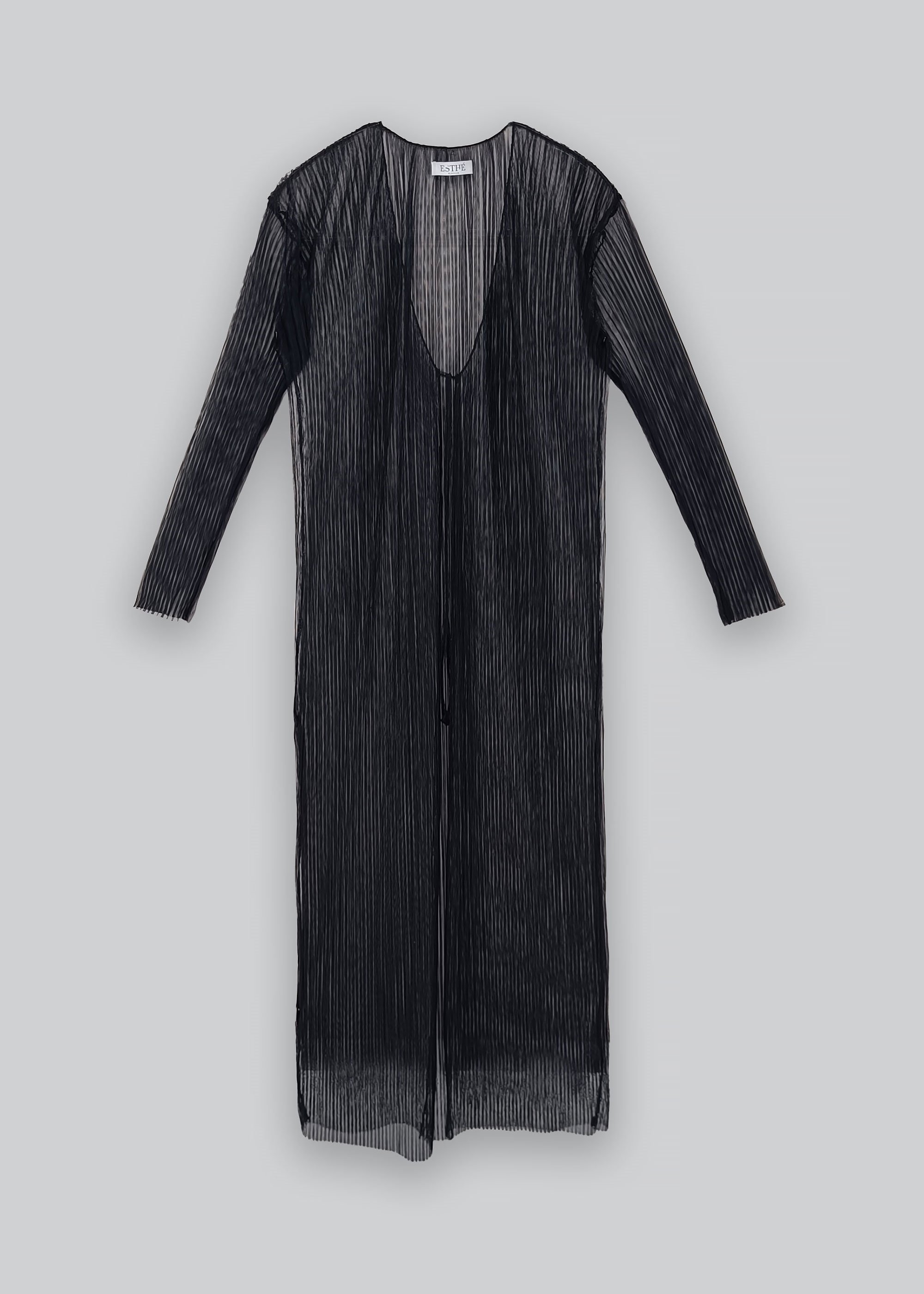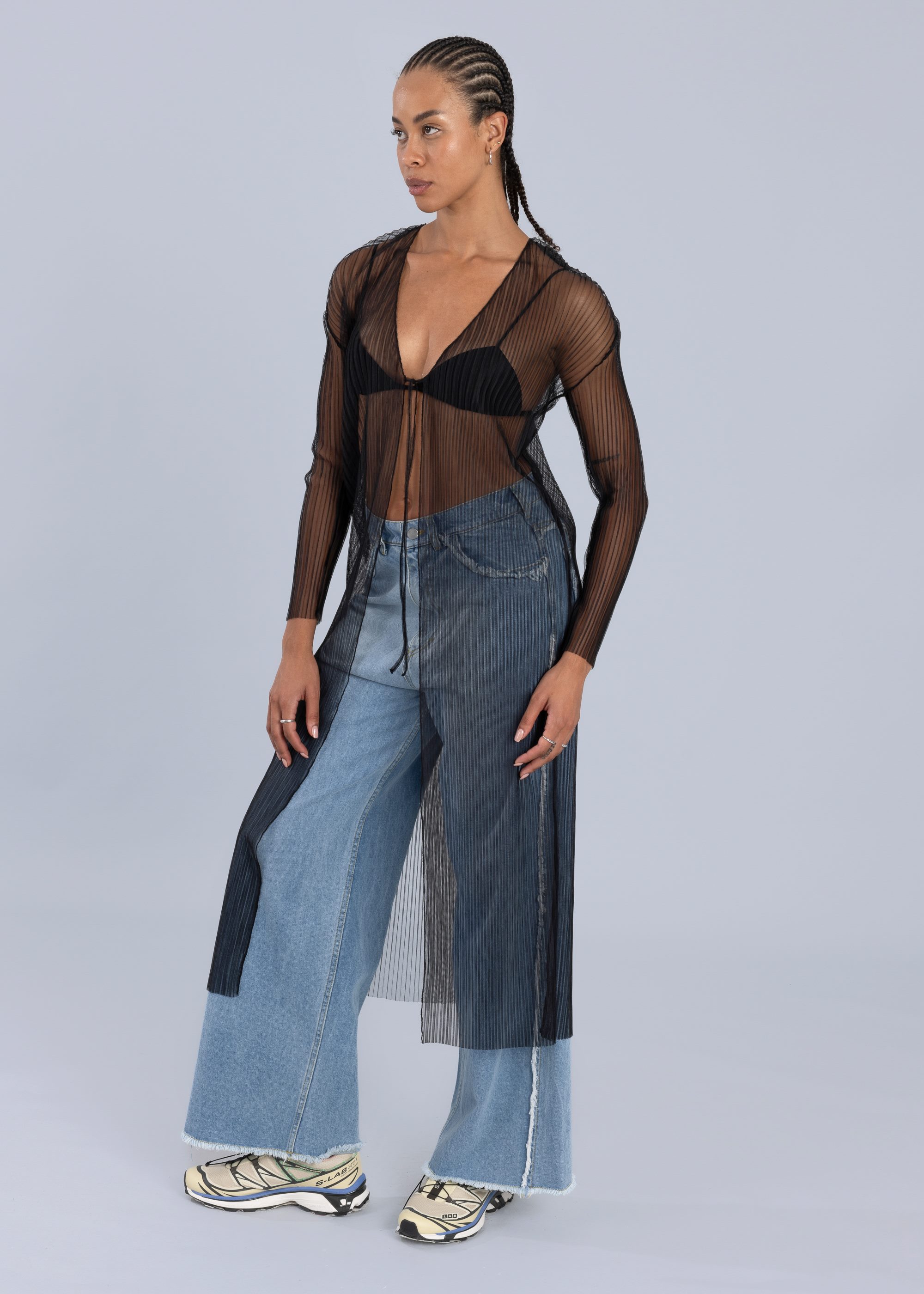 This maxi cardigan is designed to take your look from day to night. Crafted from sheer mesh fabric, this cardigan features pleats throughout the oversized fit and falls to a long midi length. With tie-front closure, laser cut raw edge at cuff and unlined design, it’s the perfect piece to layer your look. Make sure to have this piece in your wardrobe for an elevated look.