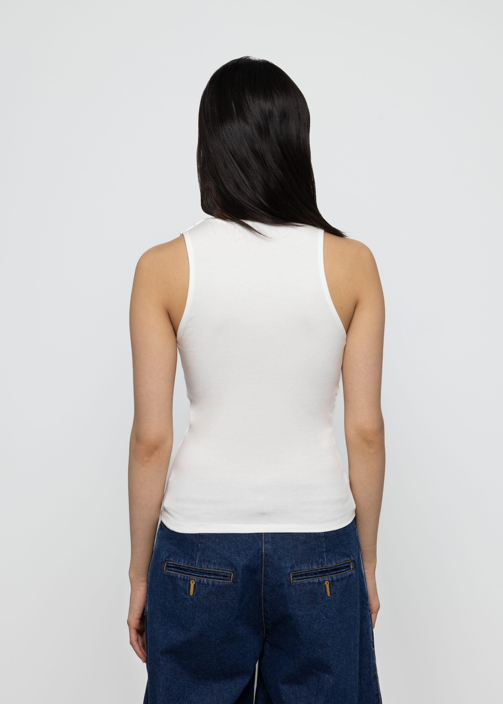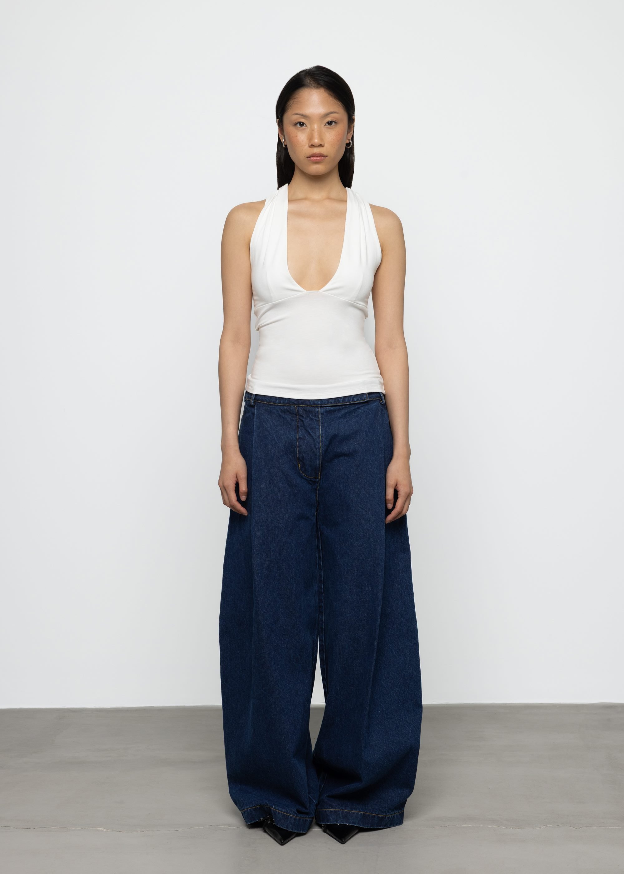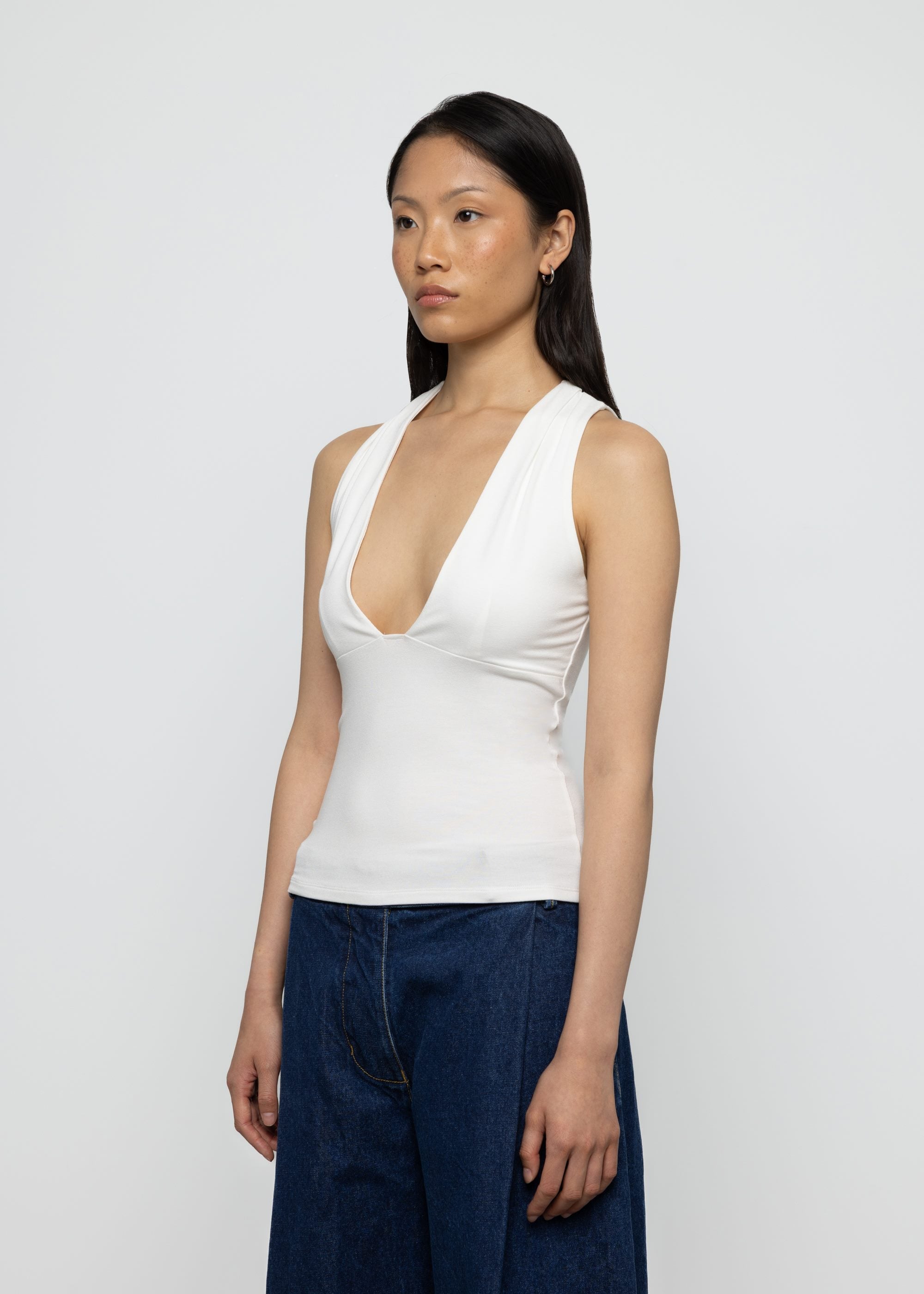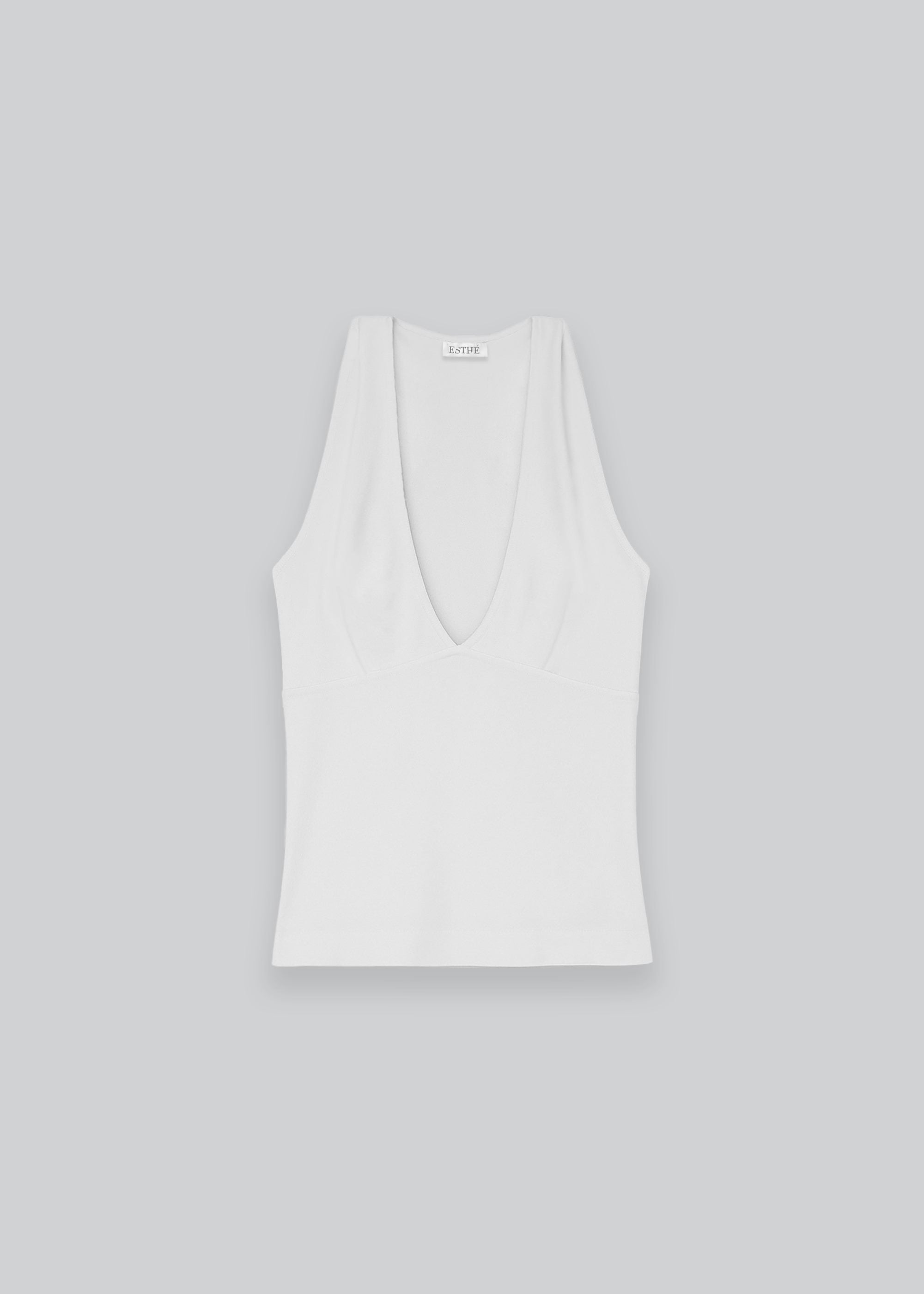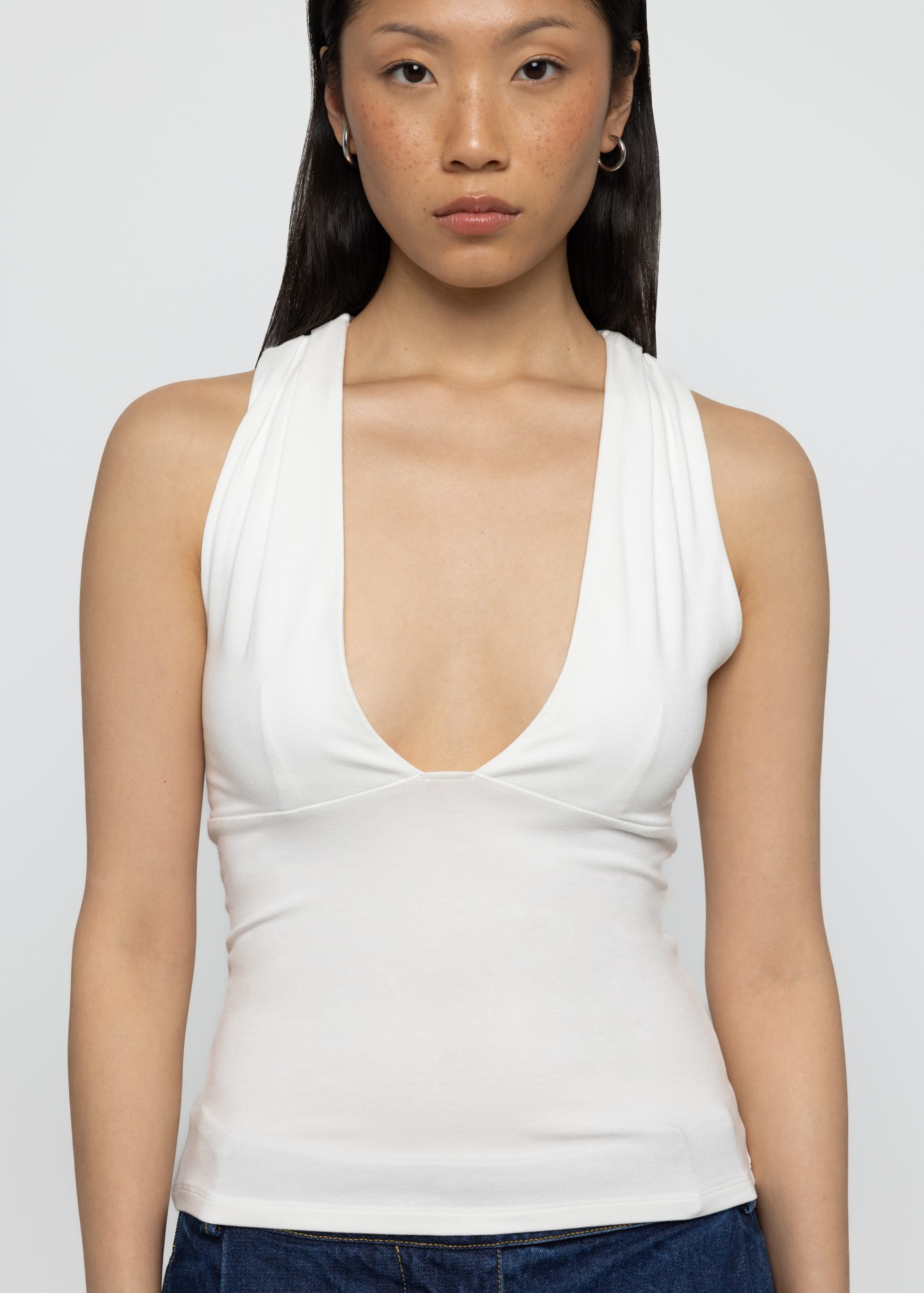 This white top features a striking low plunge neckline with sleeveless design. Regular fit with inverted pleat at shoulders for elegant movement. Ideal for statement evening looks.