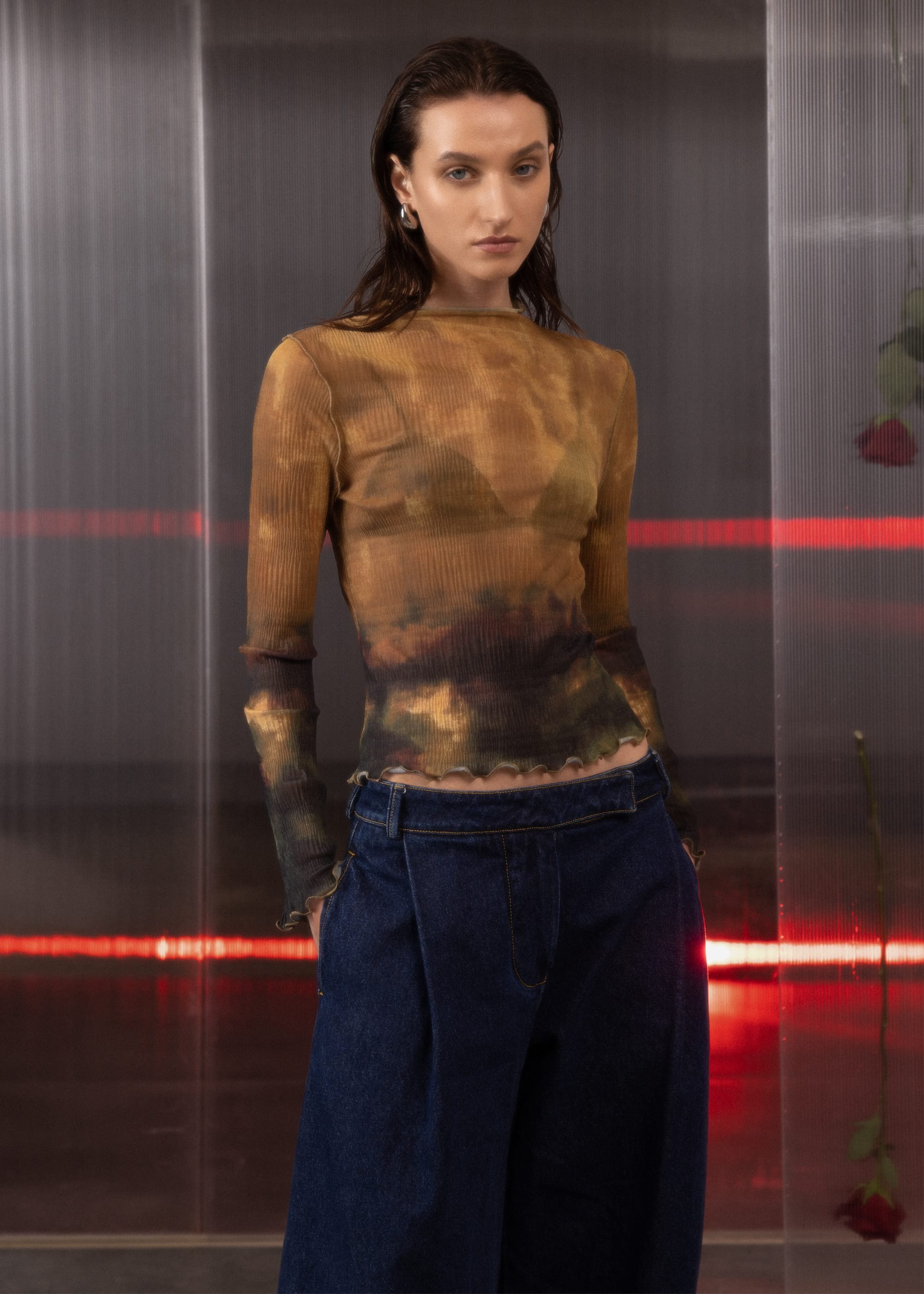Lightweight and sheer with a slightly relaxed fit, this top features a ruffle pleated technique and an intricate Earthshade Print. Crafted with precision, it includes pleated details and visible seam stitching for a modern touch. A blend of texture and design that speaks to understated elegance.