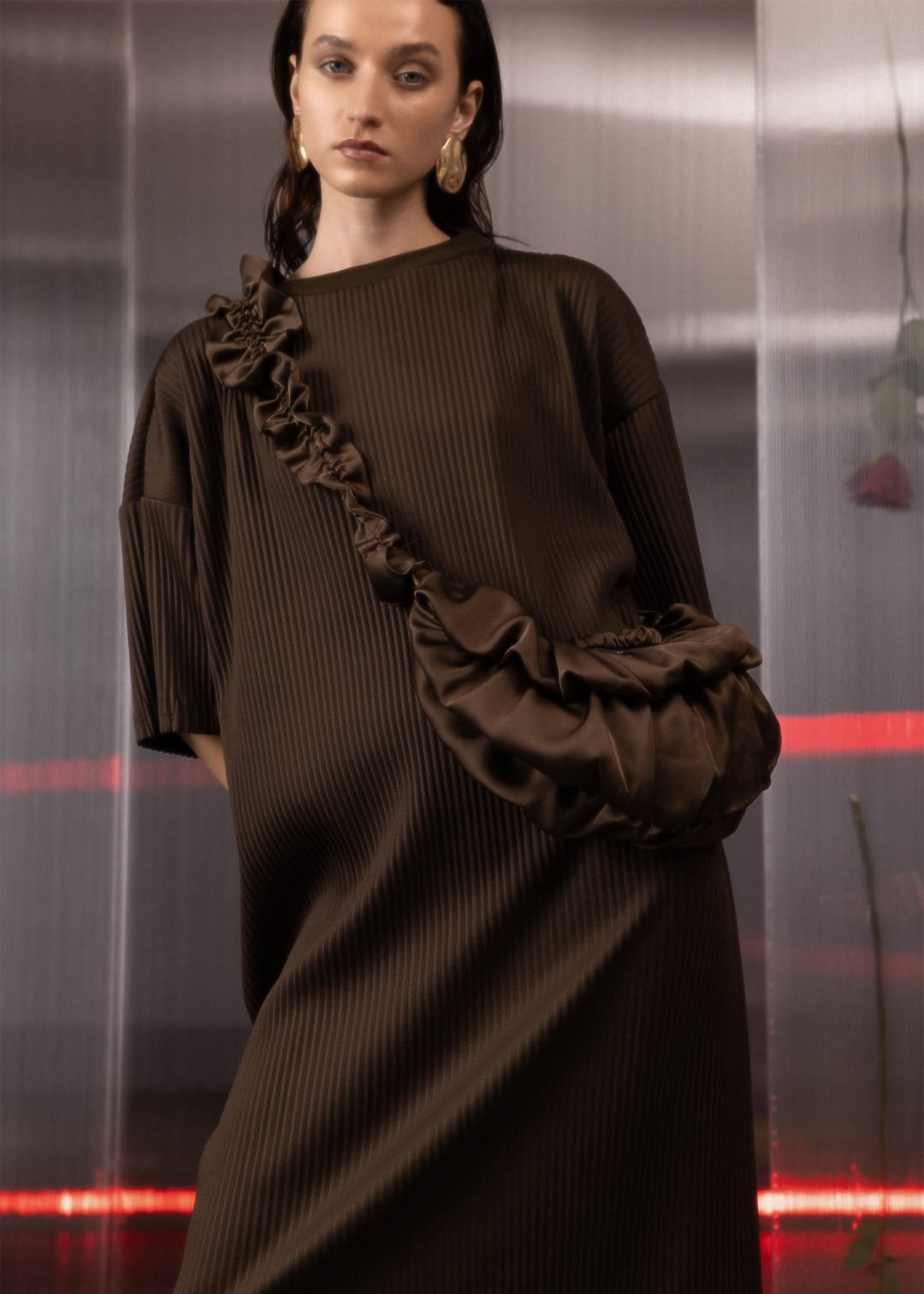 Crafted from lightweight, non-stretch satin fabric, this bag features a spacious design with extra lining for added durability. The adjustable channelled gathering at the strap offers versatility, while the ruffled details provide a refined touch. Its functional yet stylish design makes it a great everyday accessory.