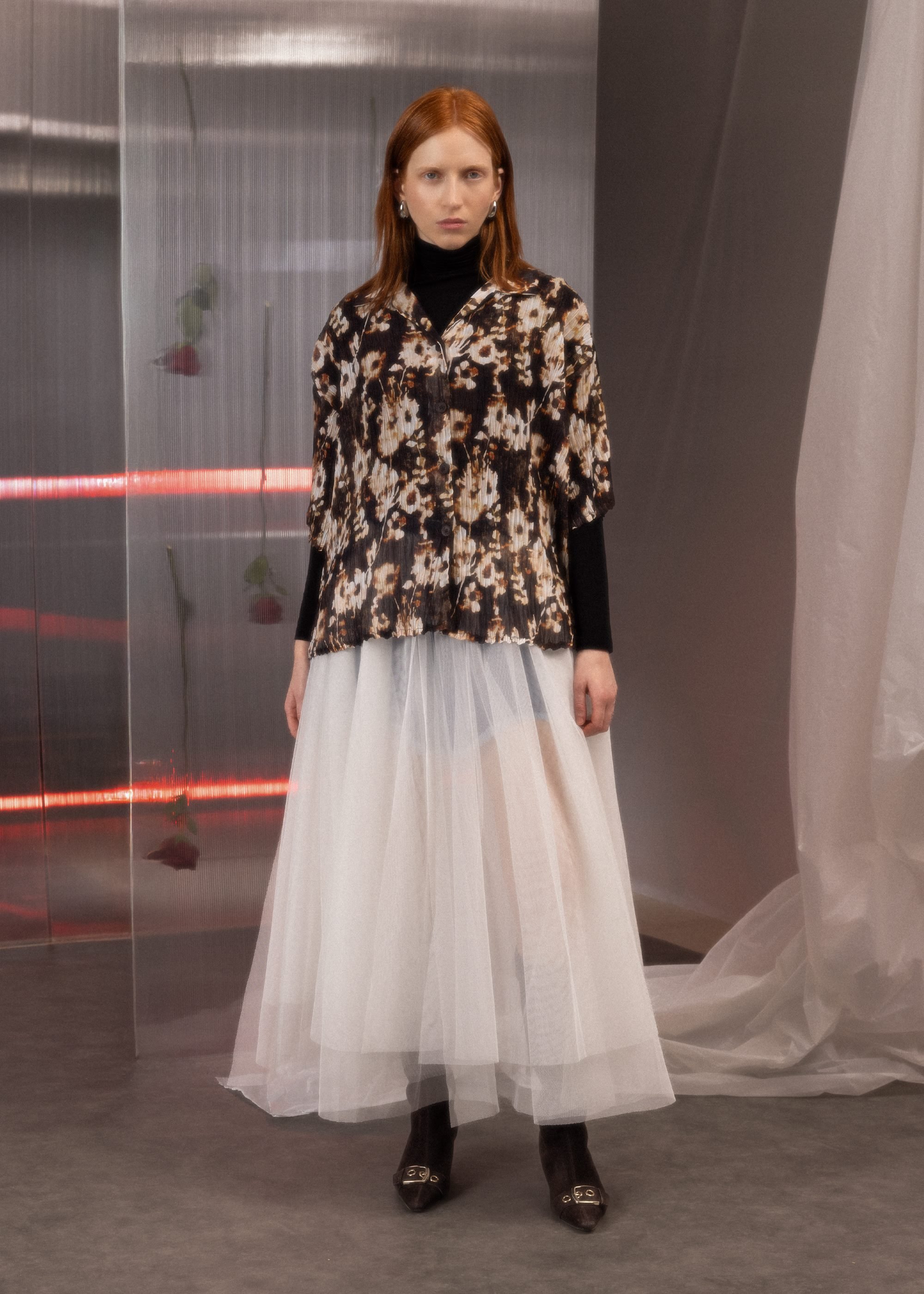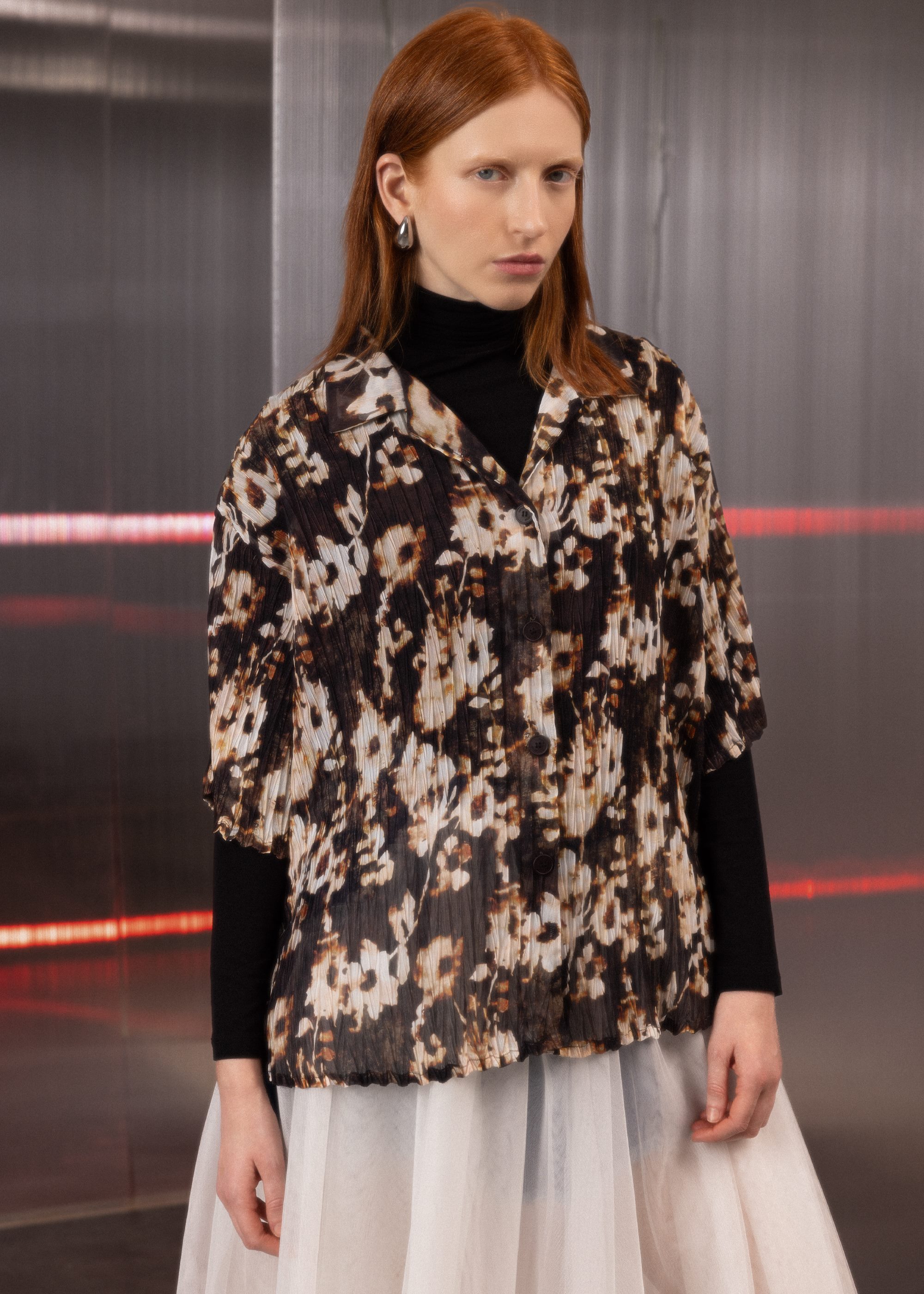 Made from lightweight, see-through chiffon, this pleated shirt combines an oversized fit with short sleeves for effortless comfort. Featuring a collar, placket, front button closure, and a Burnt Blossom print, it’s unlined for a breezy feel.