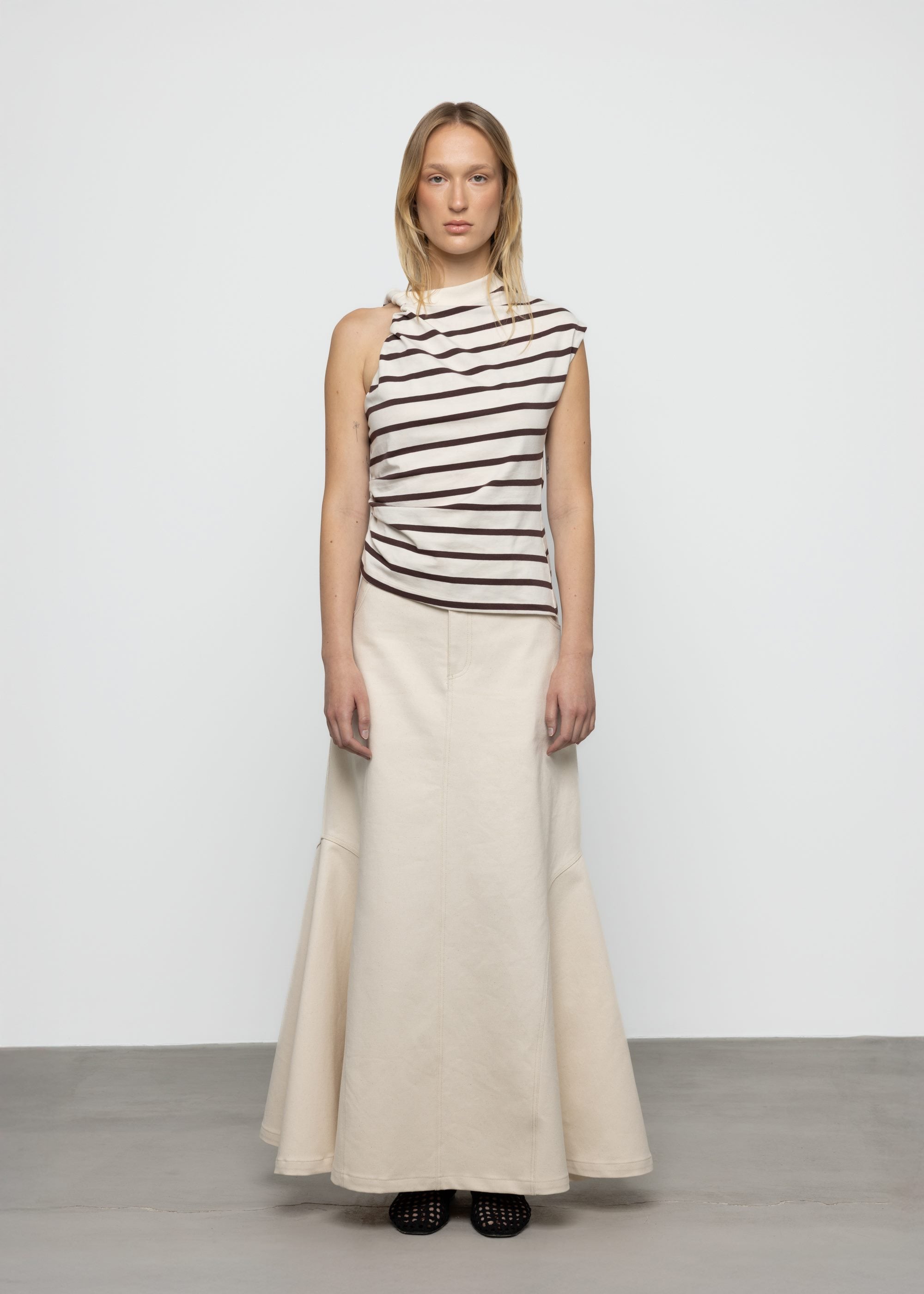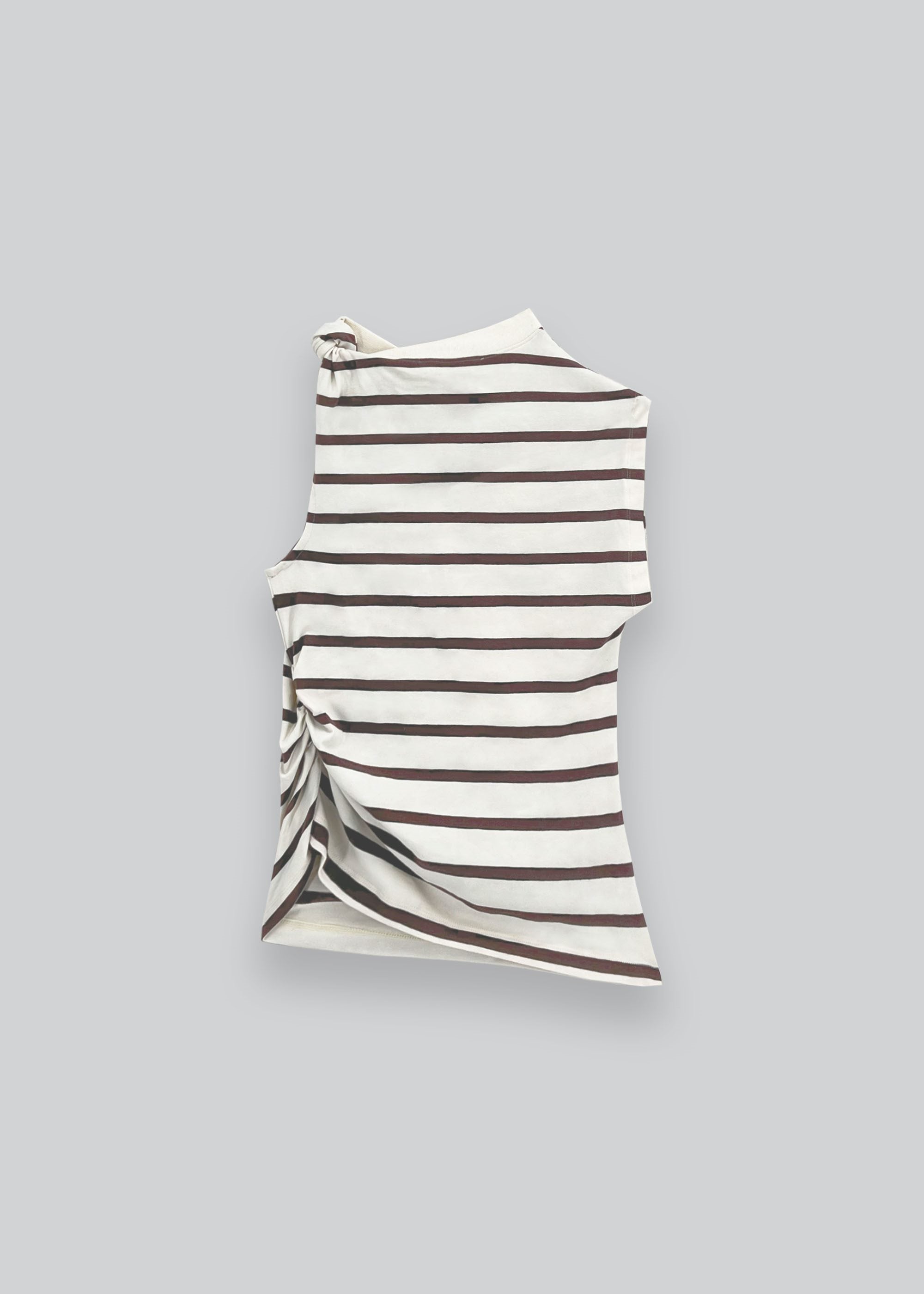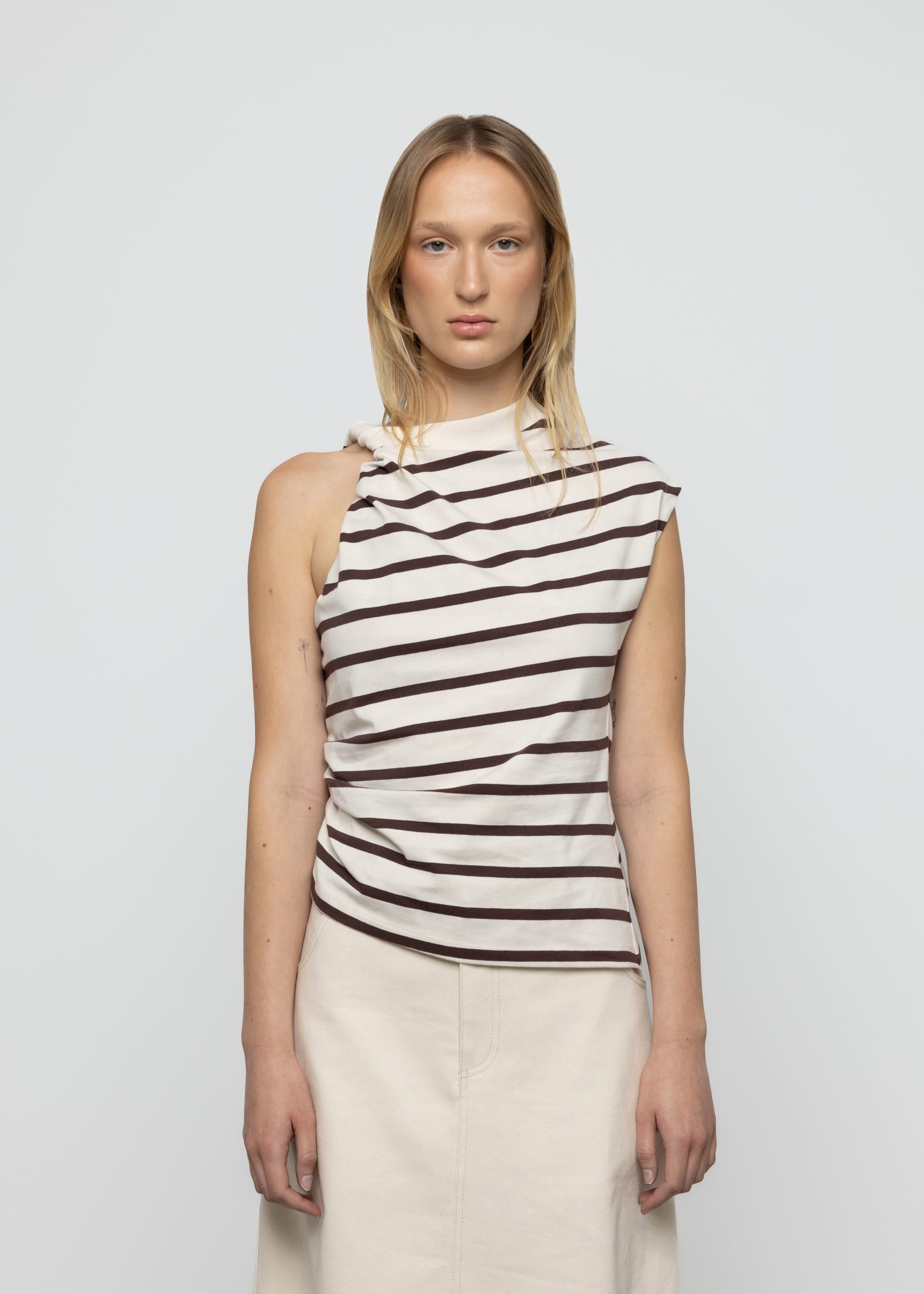 This brown and white top features stretched fabric with true to size fit. One shoulder design with twist and waist gatherings. Asymmetric hem for contemporary styling.
