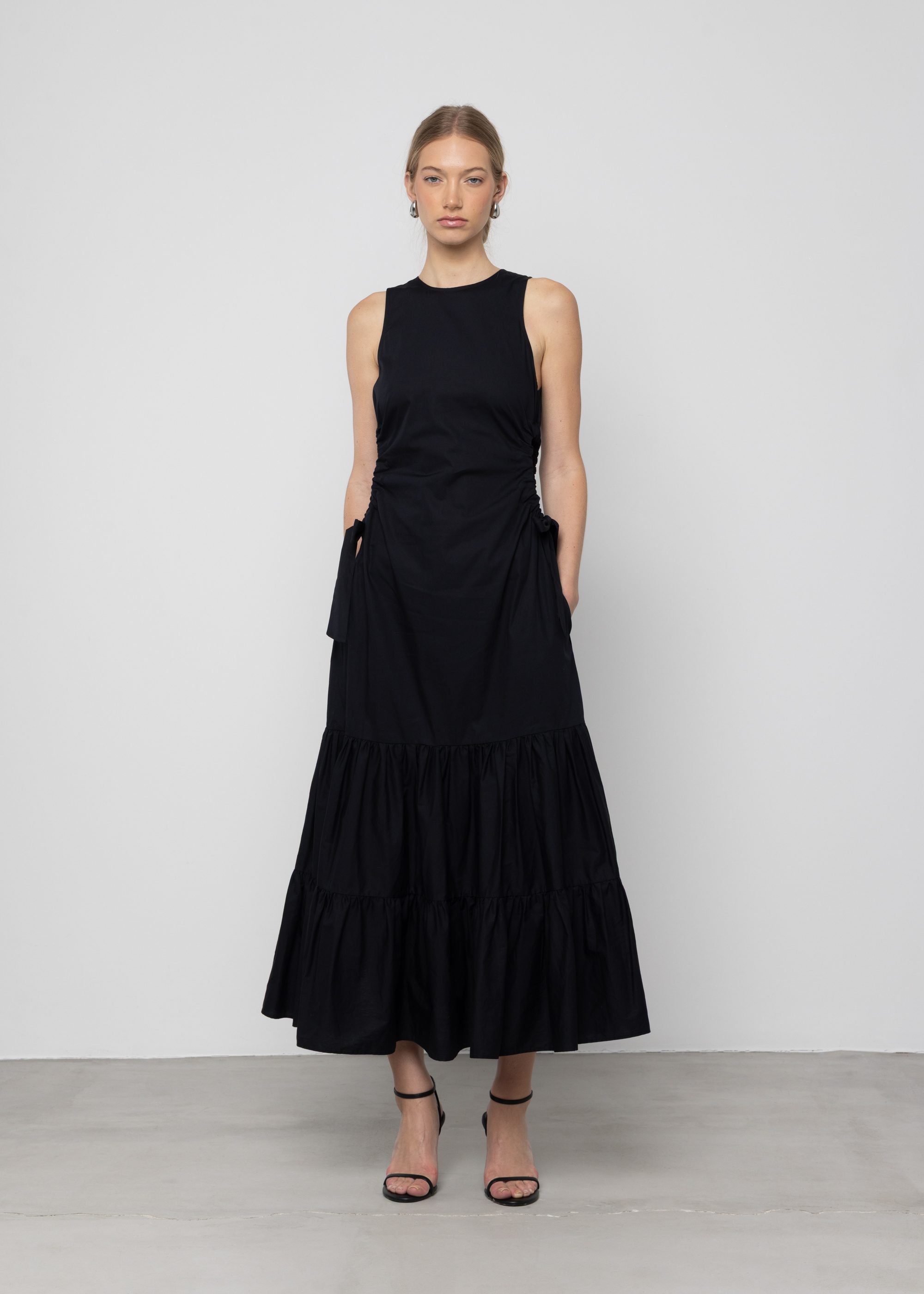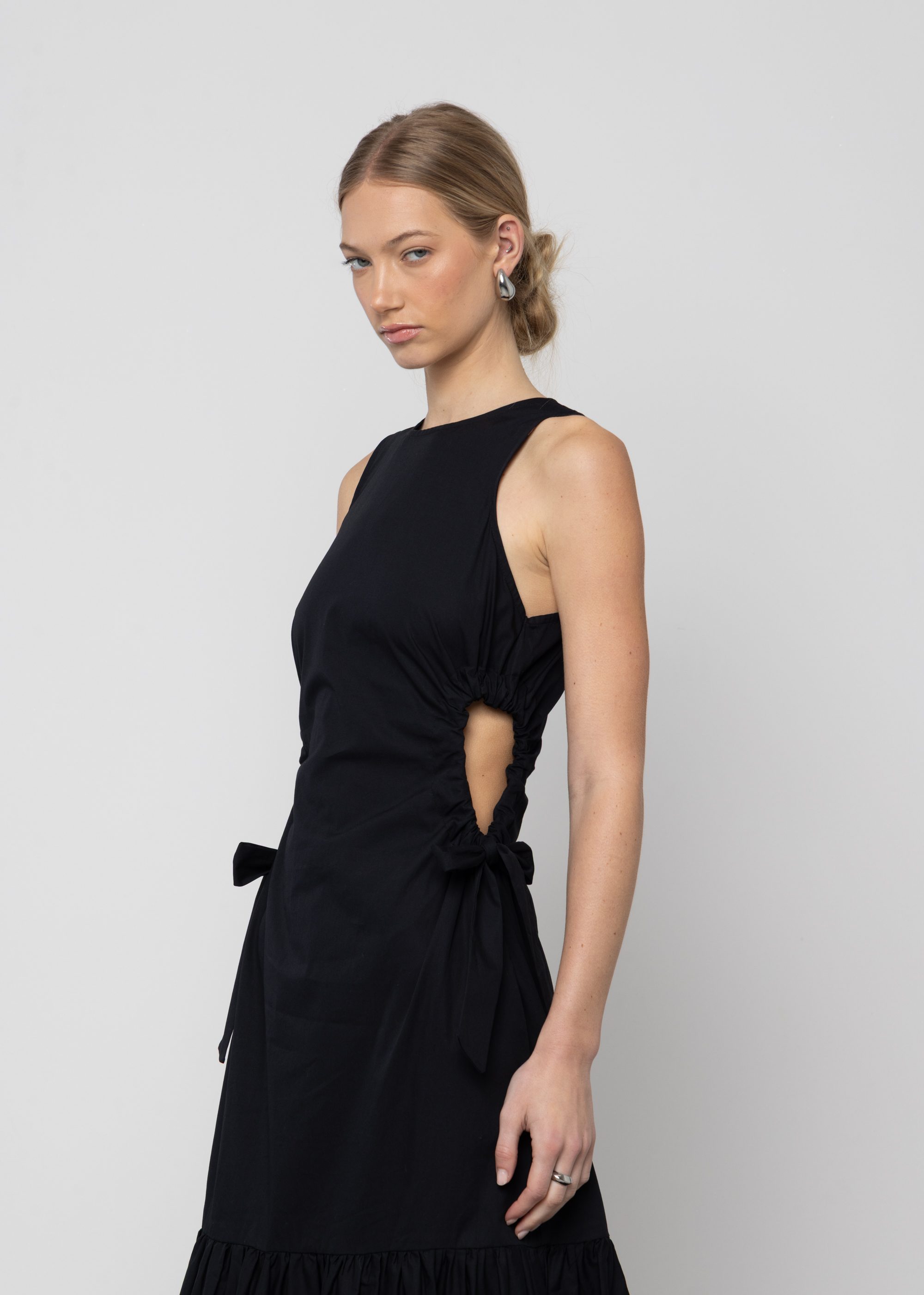 This black maxi dress is the perfect addition to any wardrobe. The cut-out design feature and channelled gathering at the waist create a unique and stylish look. It fits true to size and flows in a tiered volume skirt, designed for maximum impact. Crafted from a sustainable and responsible fabric, this fit and flare maxi dress is sure to become a wardrobe staple.